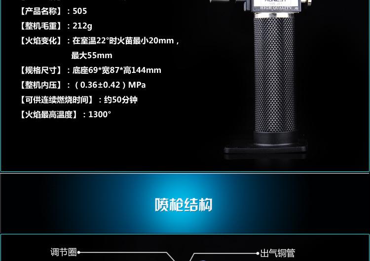 [Rango de Llama] (medido a temperatura ambiente de 22 grados) La llama se puede ajustar entre 20 mm y 65 mm. La llama aquí se refiere al área de llama azul oscuro en el medio de la llama, y la distancia de pulverización de la llama exterior puede alcanzar unos 200 mm