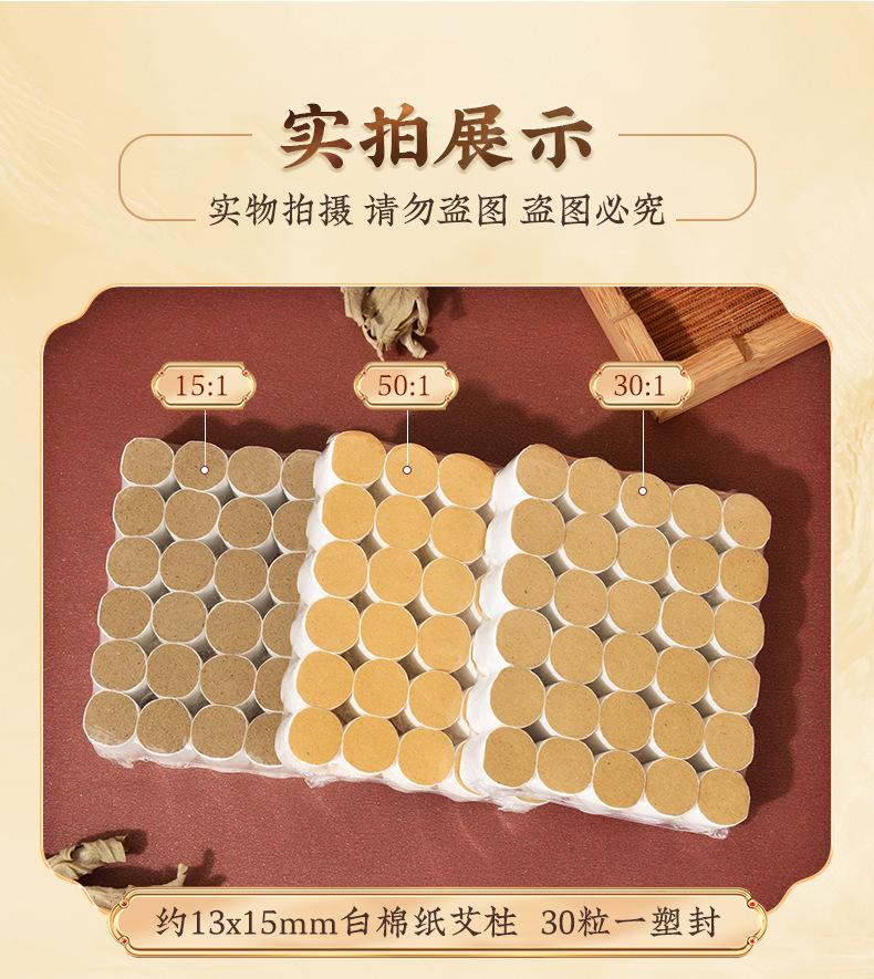15:1 white tissue paper moxa stick 13*15mm (30 grains plastic sealed), 30:1 white tissue paper moxa stick 13*1...