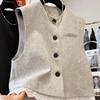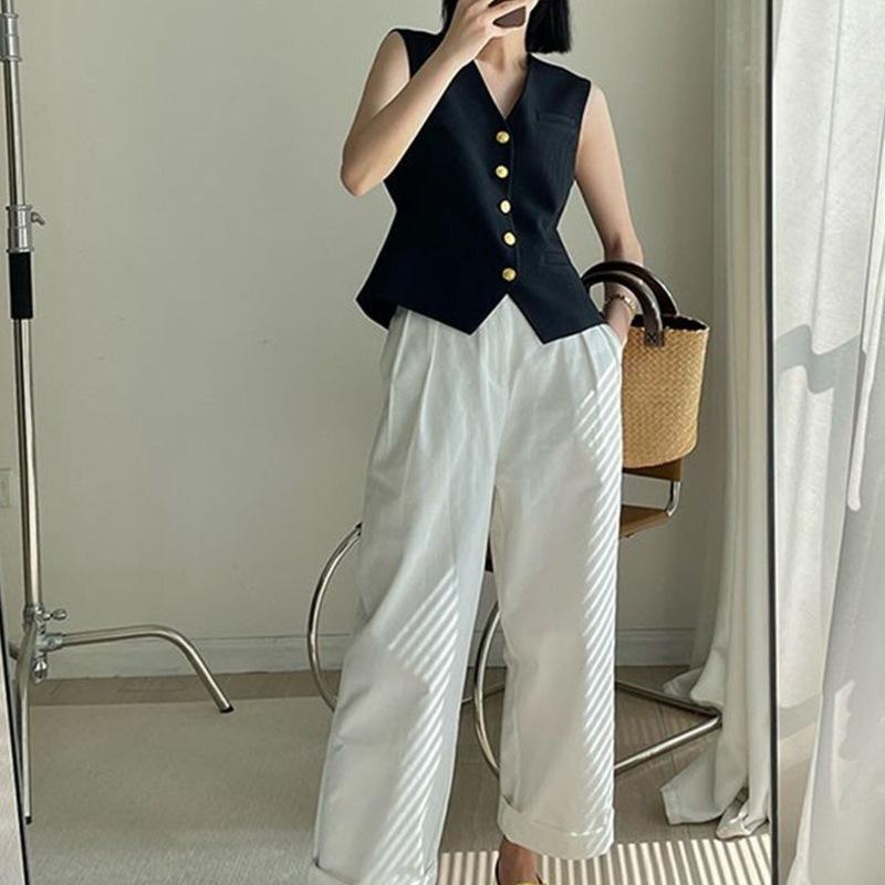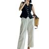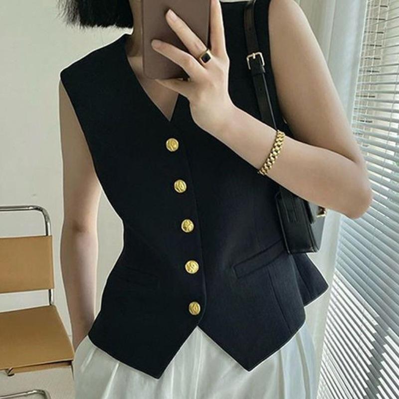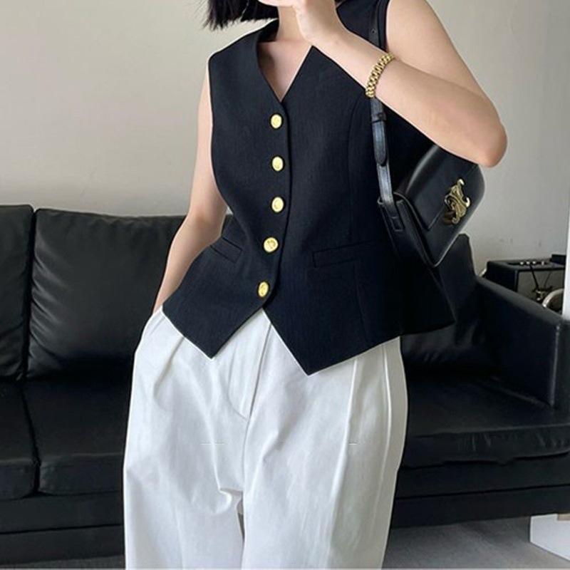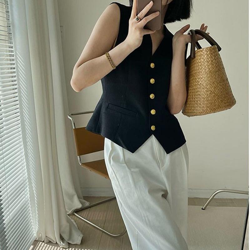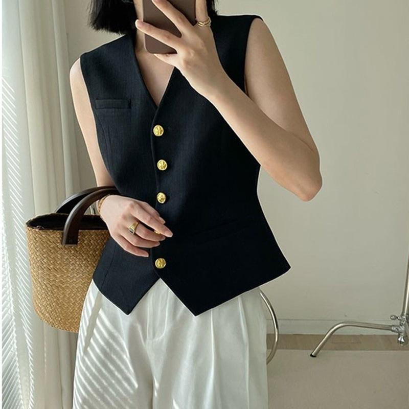 Chaleco de Traje Retro de Gama Alta Negro con Cuello en V Verano Femenino Ajustado a la Cintura Look Adelgazante Estilo Corto Chaqueta Chaleco