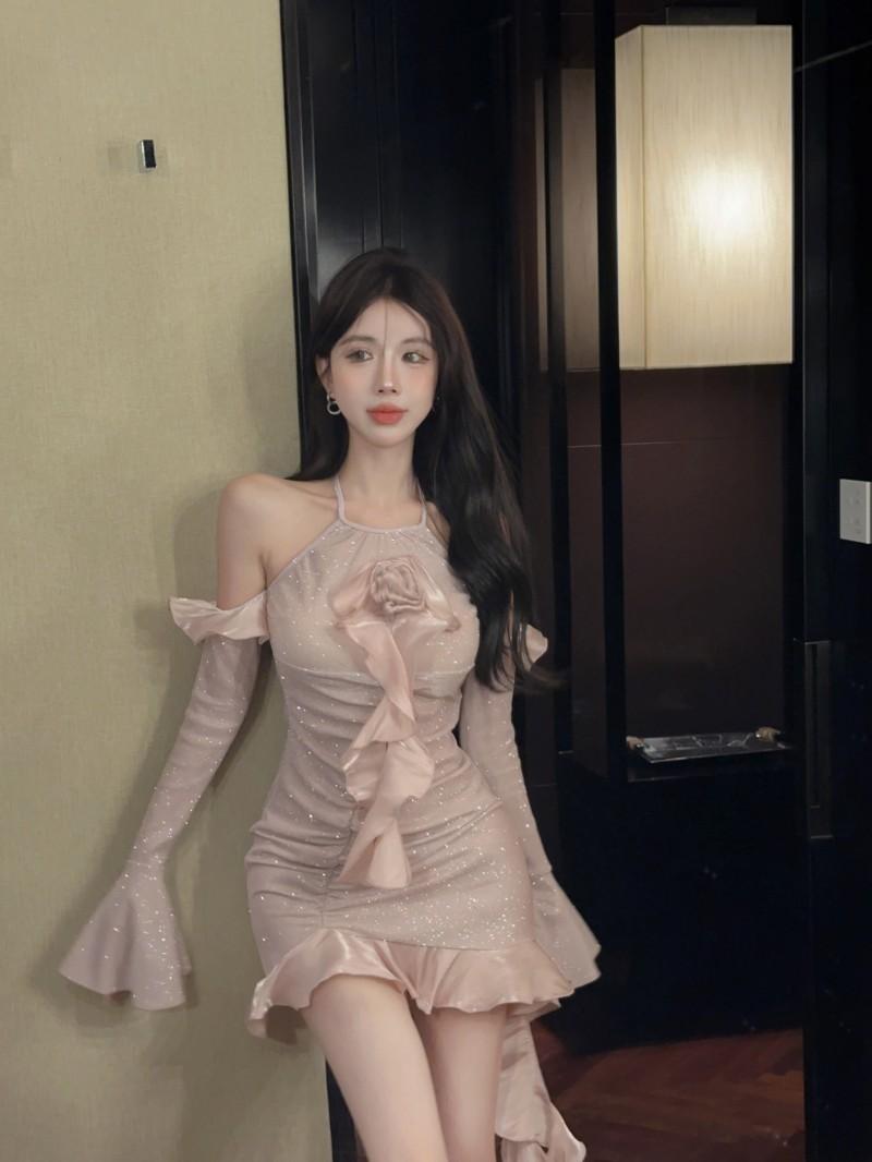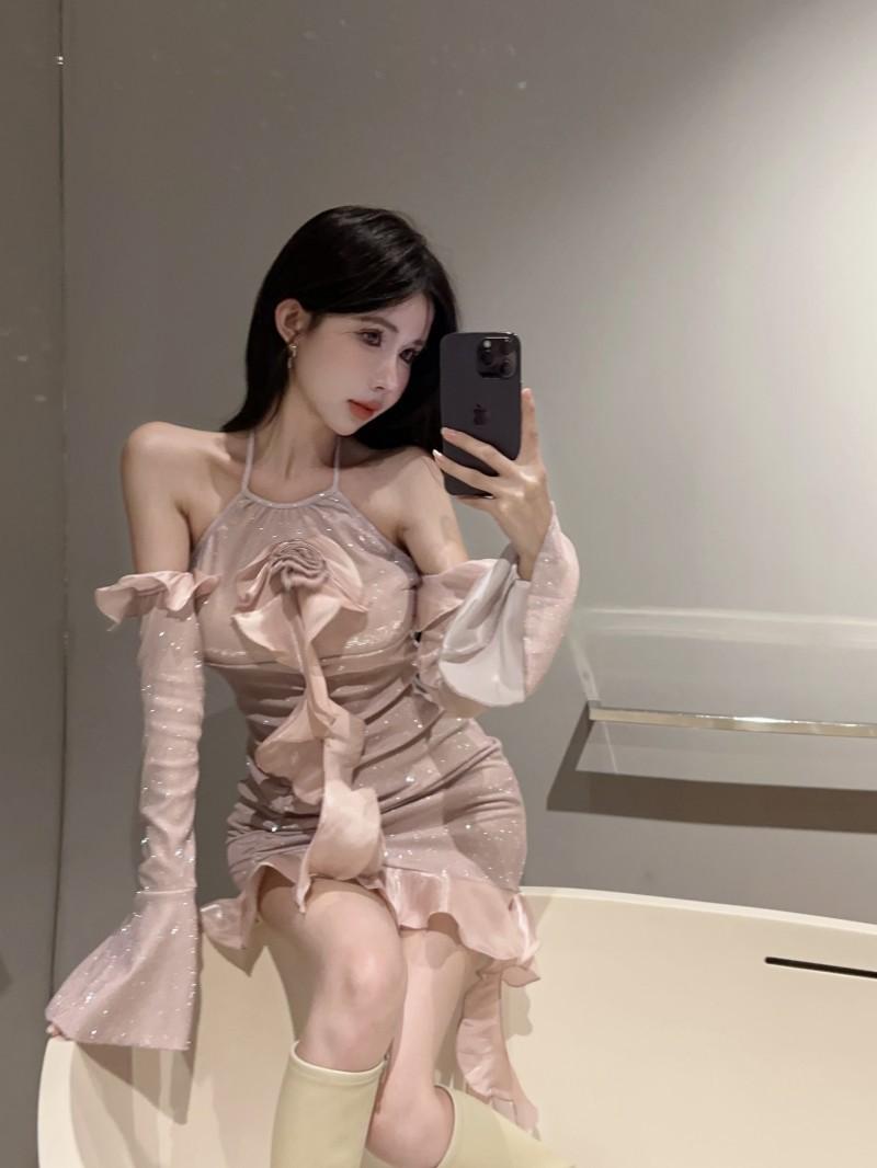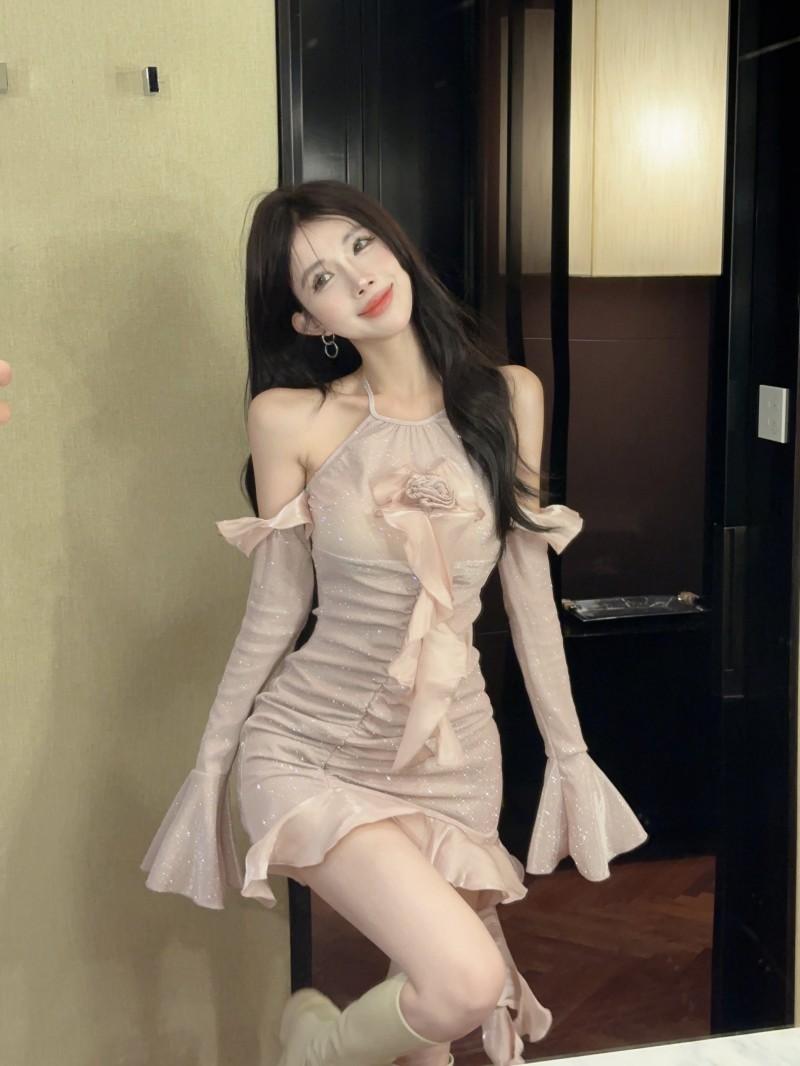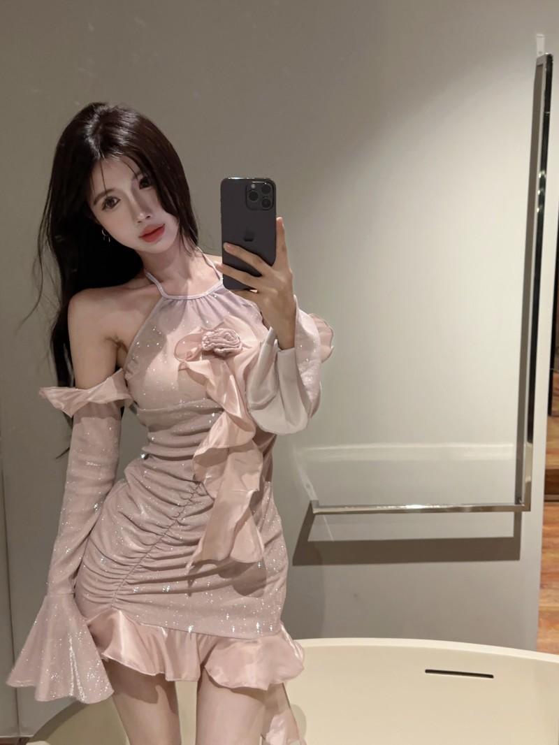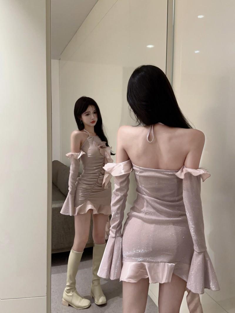 Vestido ajustado con mangas acampanadas y volantes con hombros descubiertos, brillante, rosa, estilo de celebridad de Internet, sexy y sexy para mujer