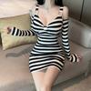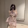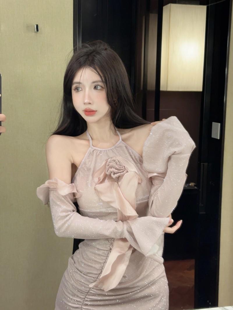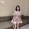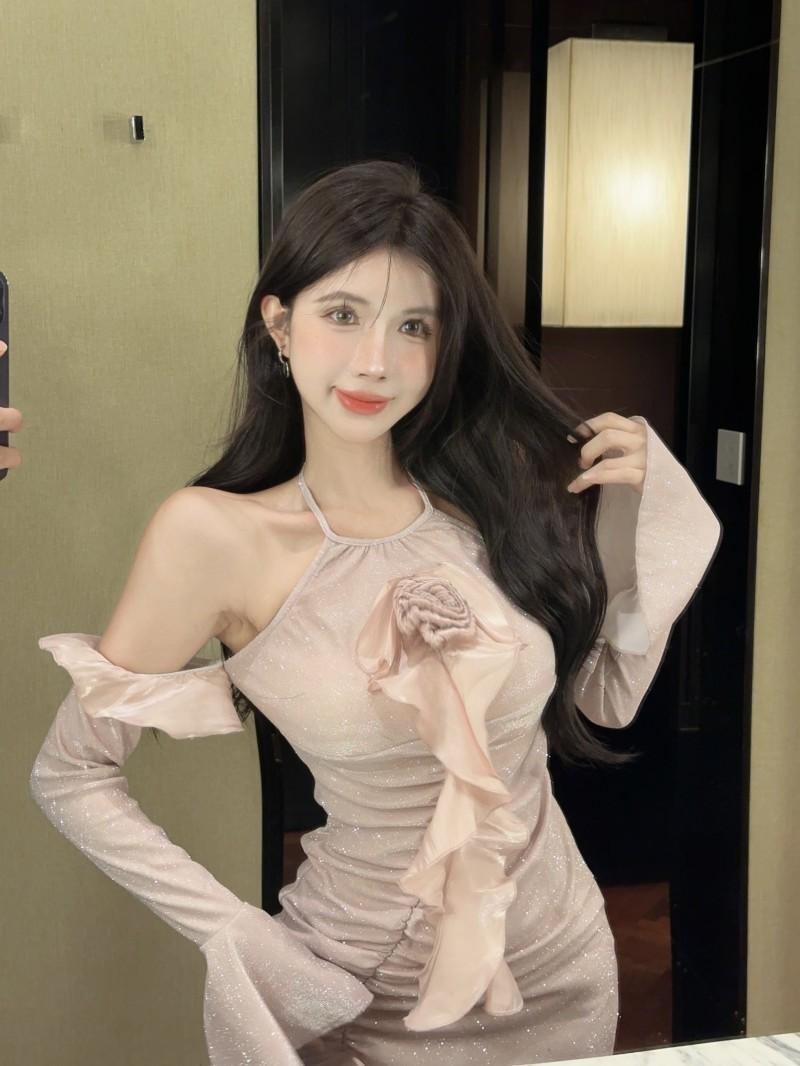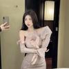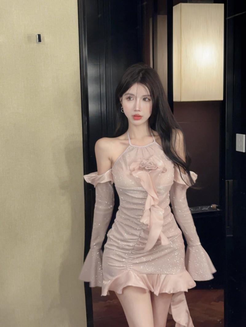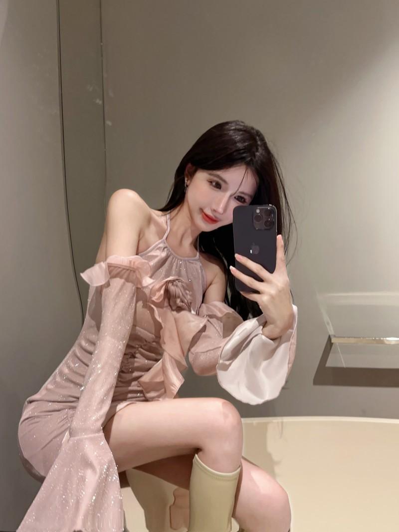 Vestido ajustado con mangas acampanadas y volantes con hombros descubiertos, brillante, rosa, estilo de celebridad de Internet, sexy y sexy para mujer