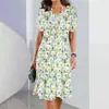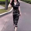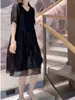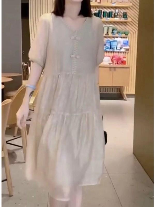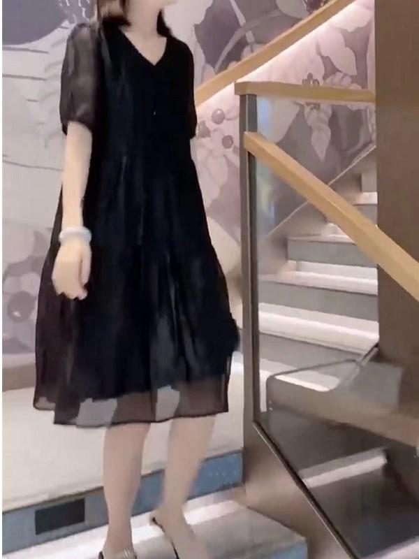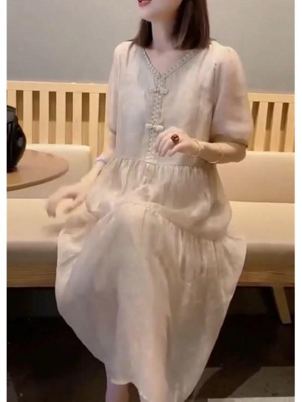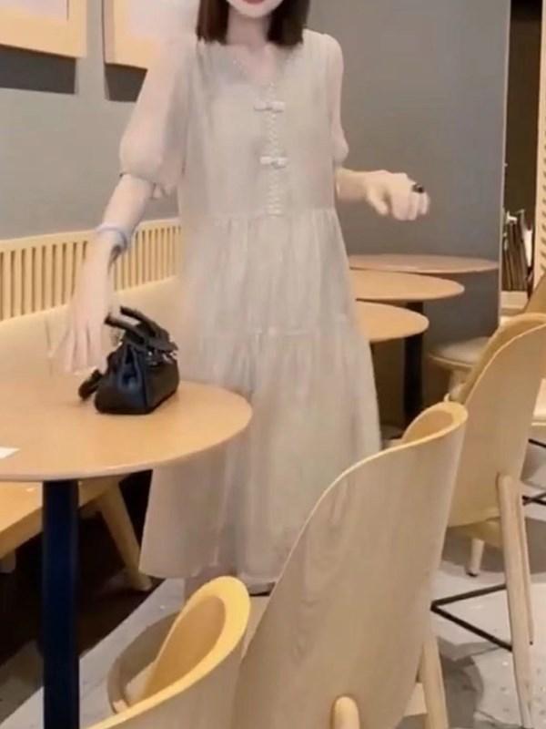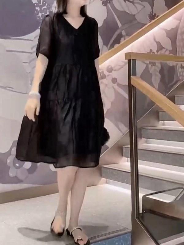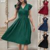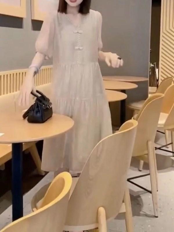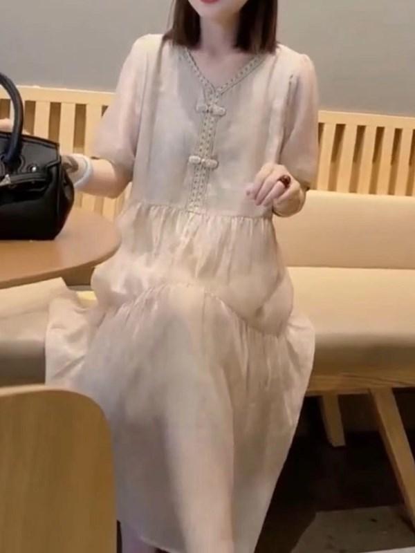 24365 Damei Beauty 2025 Verano Nuevo Vestido de Largo Medio con Cuello en V de Moda Vestido Elegante Adelgazante para Mujer