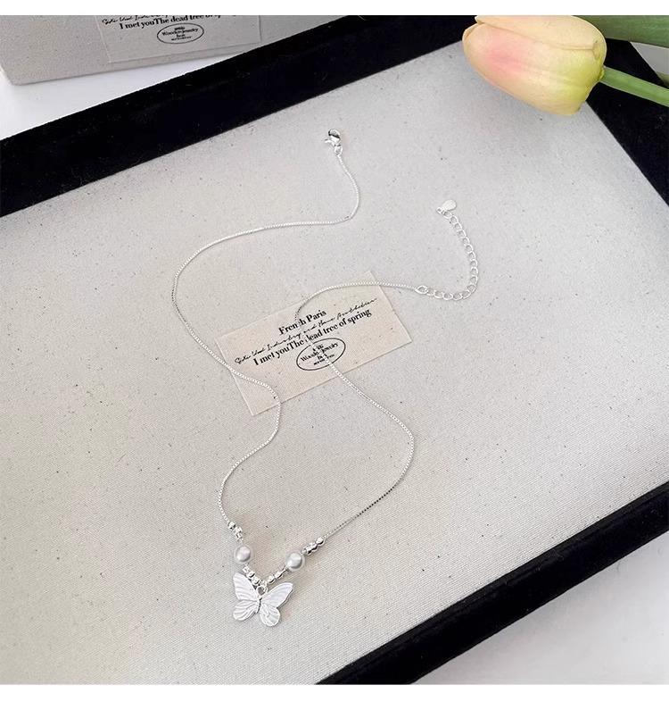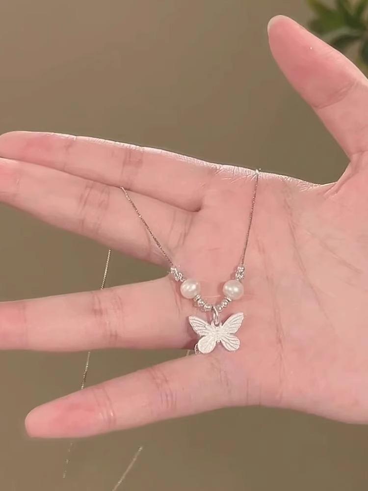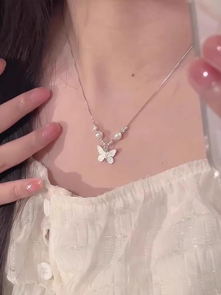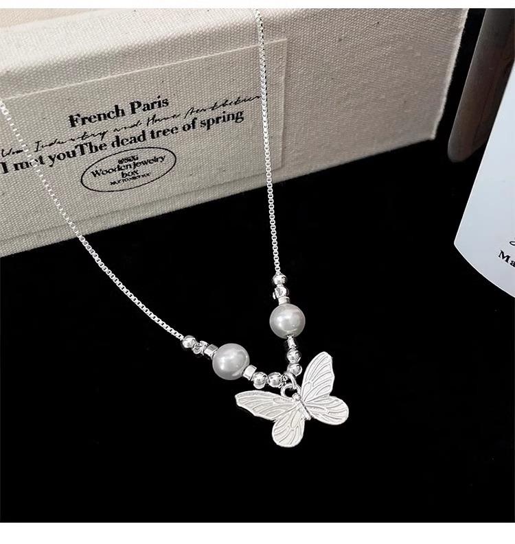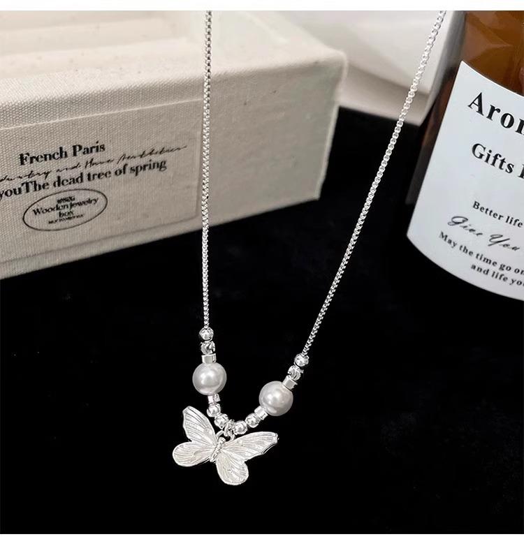 Collar con colgante de mariposa de metal perlado para mujer, estilo francés, retro, sencillo, combinable y elegante.