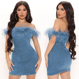| WY23099 Vestido vaquero de un solo hombro con ribete de piel y cintura cruzada, estilo europeo y americano, nueva falda corta de talla grande para chica sexy femenina |