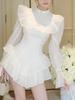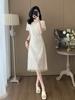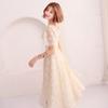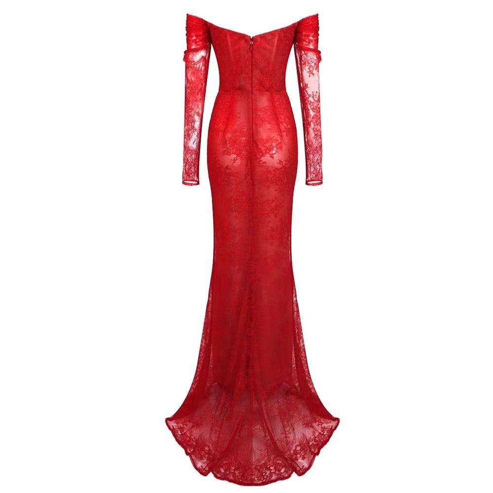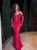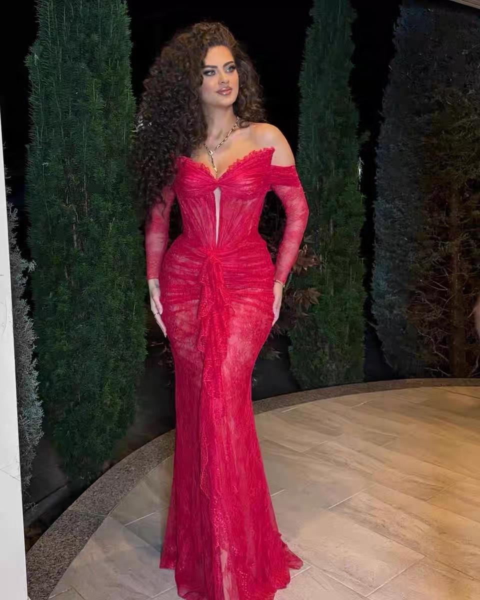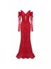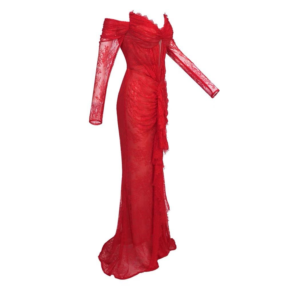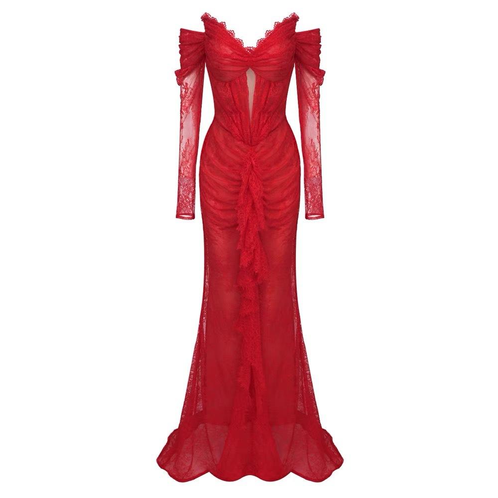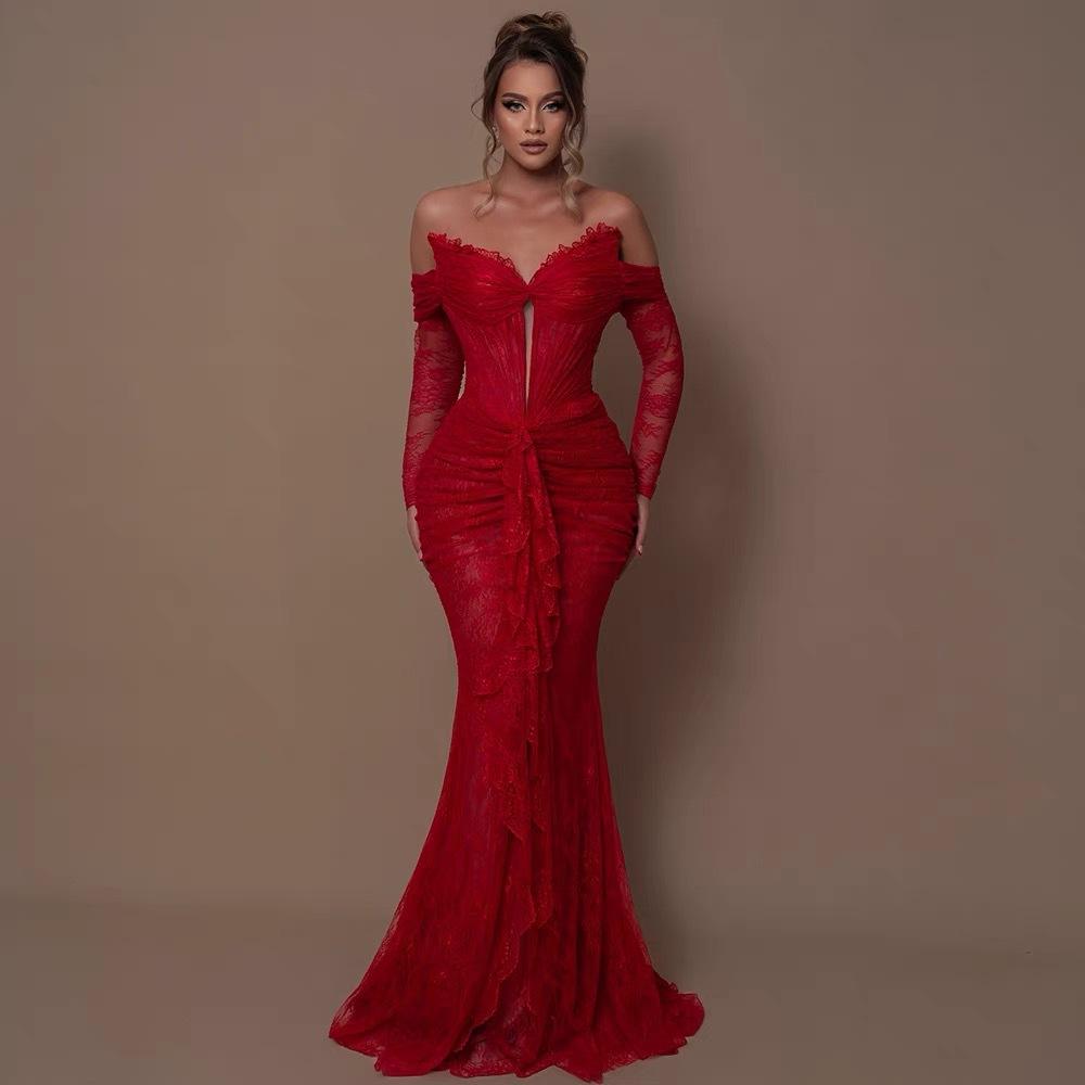 Vestido de verano para mujer, con escote en V, manga larga, encaje, cintura alta, plisado, cola de pez, para banquete de boda, 2024