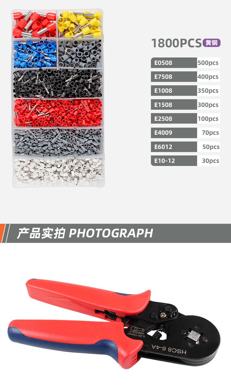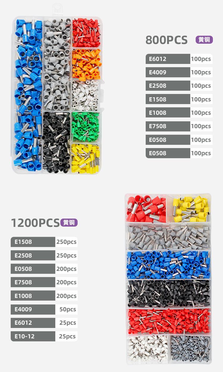 Los cuatro tipos de terminales de tubo VE (empaque de caja cuadrada) en la combinación, 800PCS, 1200PCS, 1800PCS, 1900PCS, están todos hechos de cobrelatón. La combinación de cobre púrpura solo admite compra individual [actualmente no se vende como un conjunto], para detalles por favor contacte al servicio al cliente.
