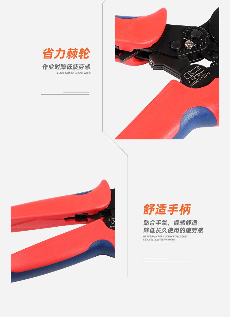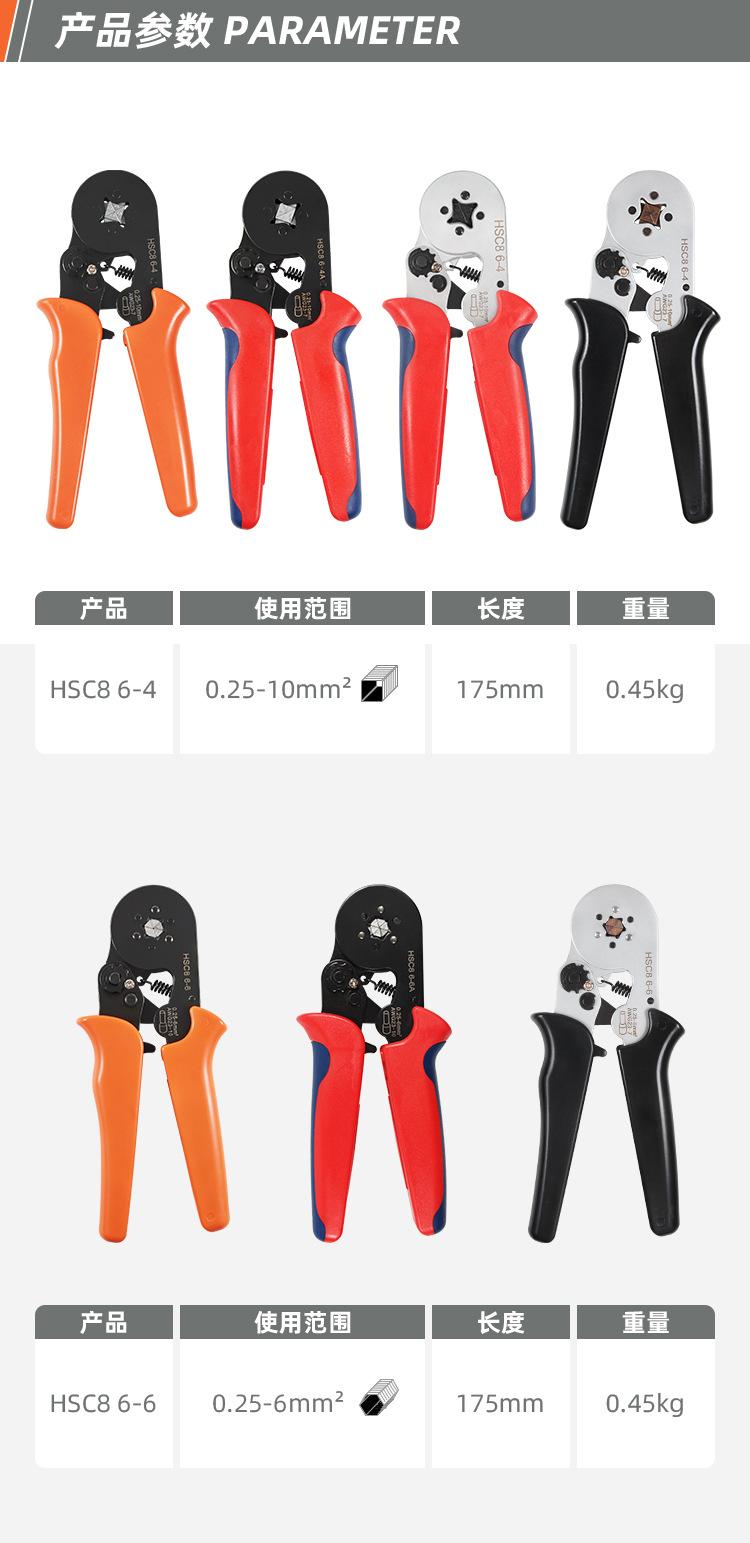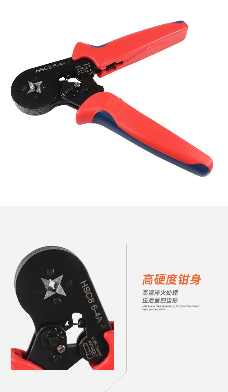 Tanto 6-4 como 6-6 se utilizan para engarzar terminales tubulares, pero la forma después del formado es diferente. 6-4 engarza en forma cuadrilátera, mientras que 6-6 engarza en forma hexagonal. Por favor, preste atención a la posición de las mordazas.