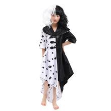 Disfraz de bruja Cruella Deville con vestido moteado en blanco y negro para Halloween de 101 dálmatas.