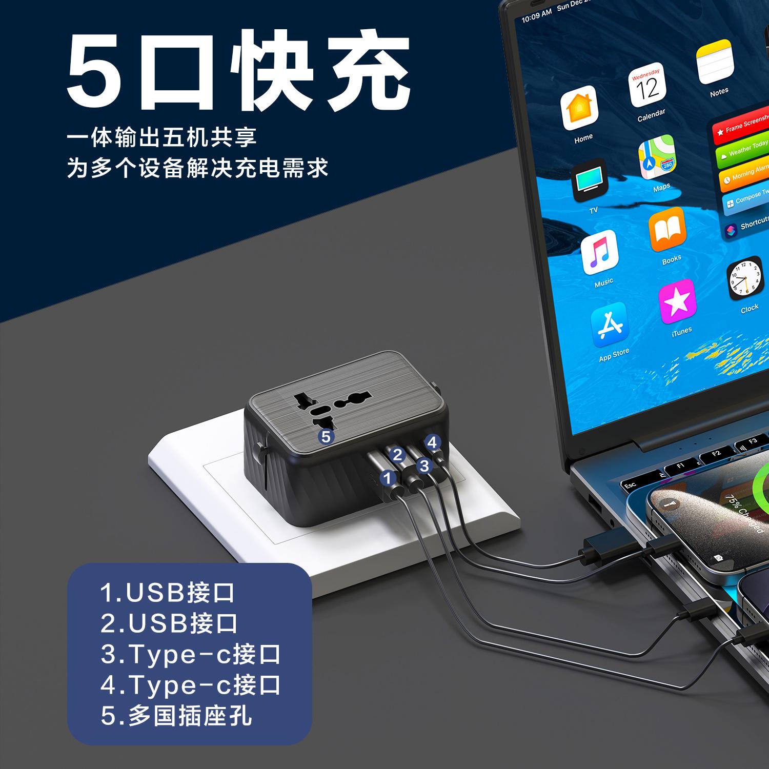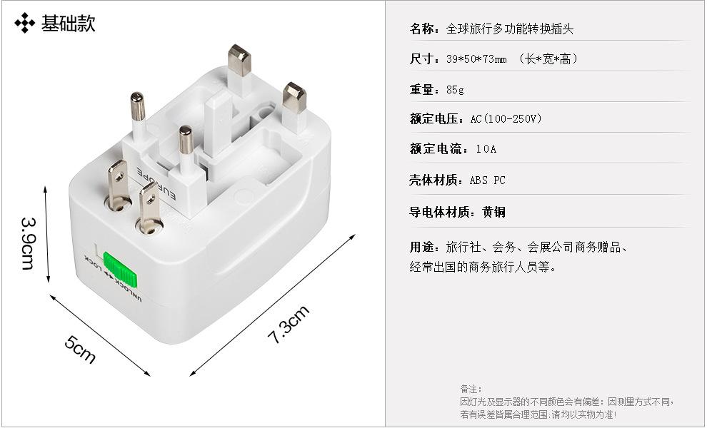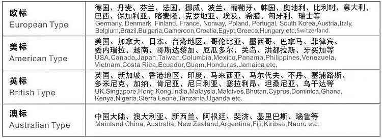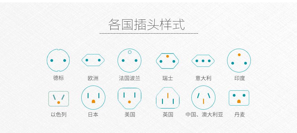 7. Tipo de enchufe: estándar americano, estándar australiano, estándar británico, estándar europeo, cuatro tipos de enchufes en uno.