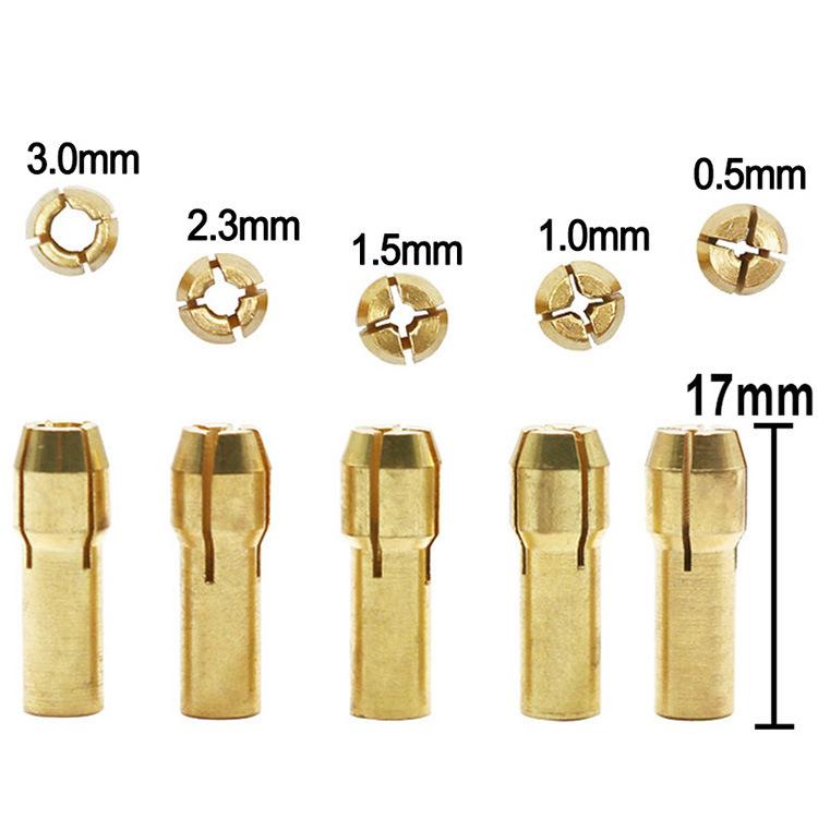 Especificaciones: 1 portabrocas de cobre + 5 boquillas de cobre + 1 llave pequeña, los tamaños de las boquillas de cobre son (0.5mm, 1.0mm, 1.5mm, 2.3mm, 3.0mm)