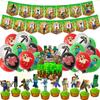 Set 2: 1 juego de banner + 1 juego de adornos para pastel + 32 globos (8 verdes 8 rojos 8 blancos 8 rosa claro) + 15 metros de cinta