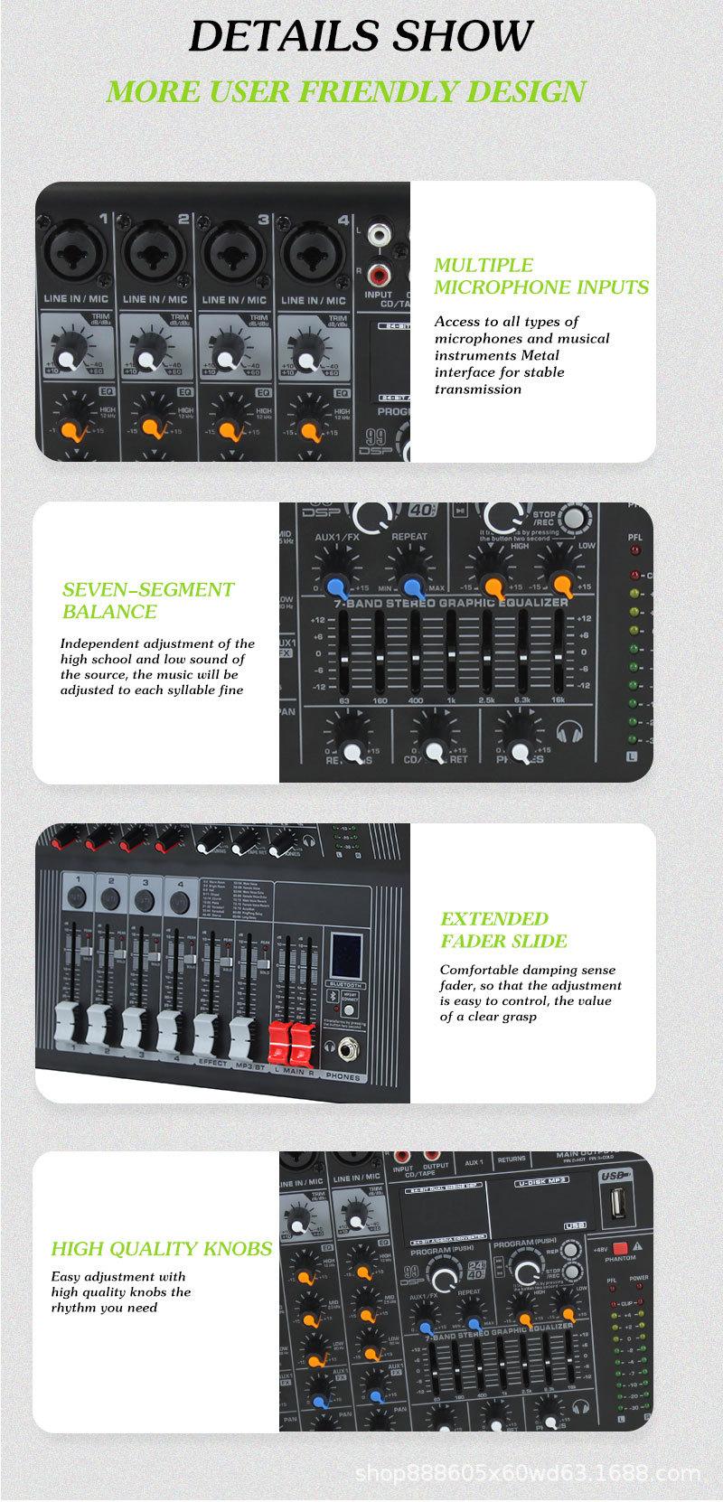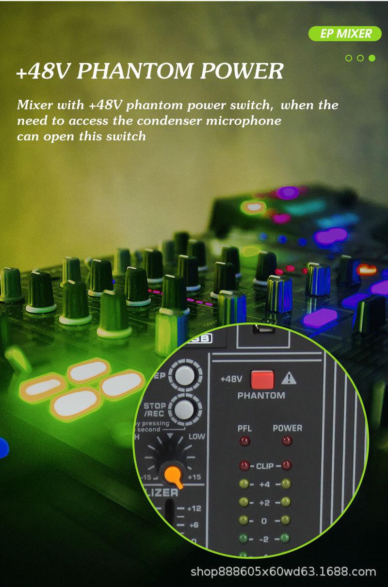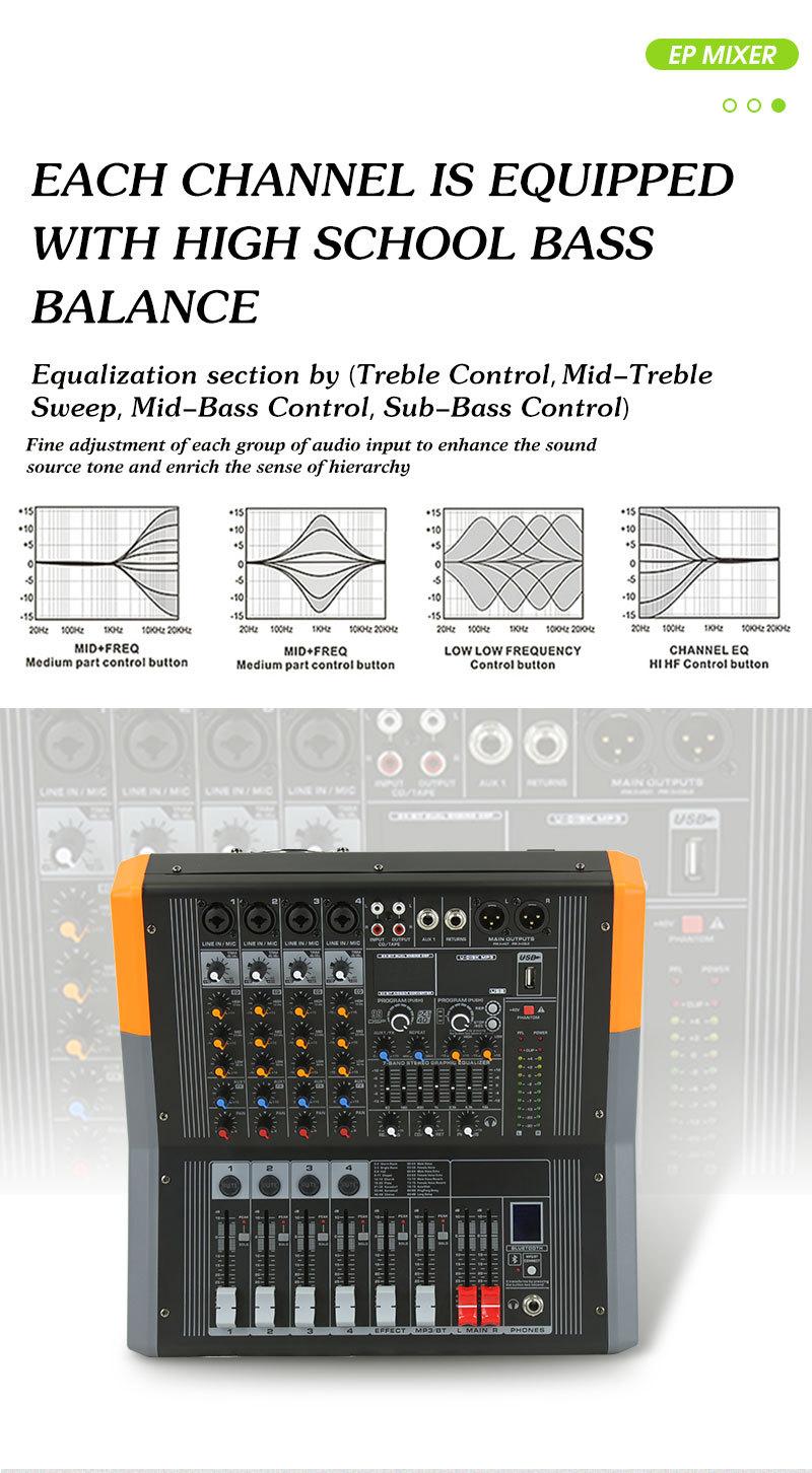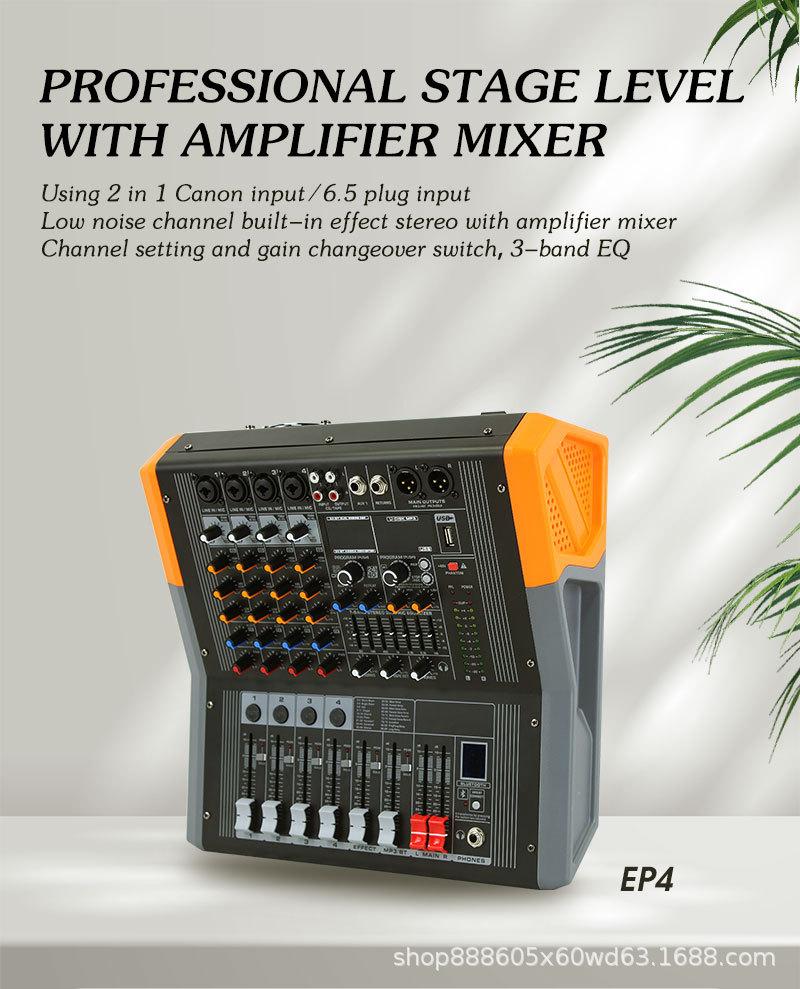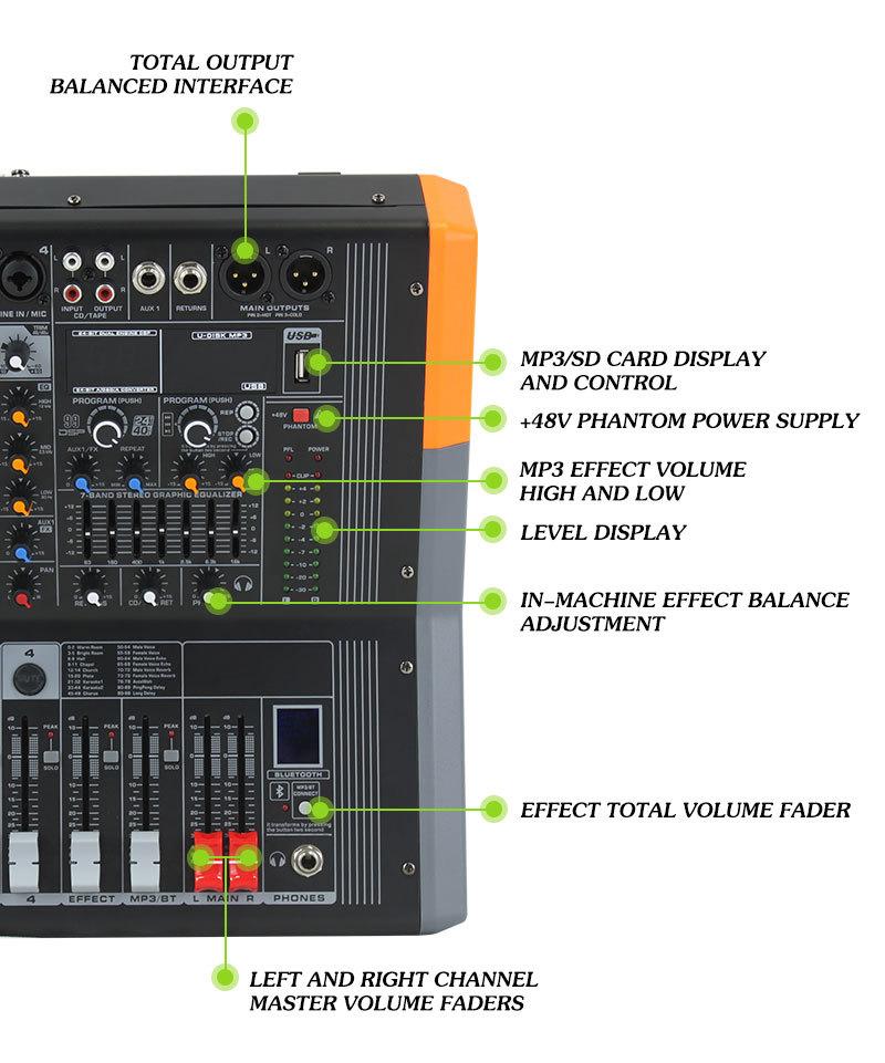 Mezclador estéreo con efectos incorporados y canal de bajo ruido con amplificador