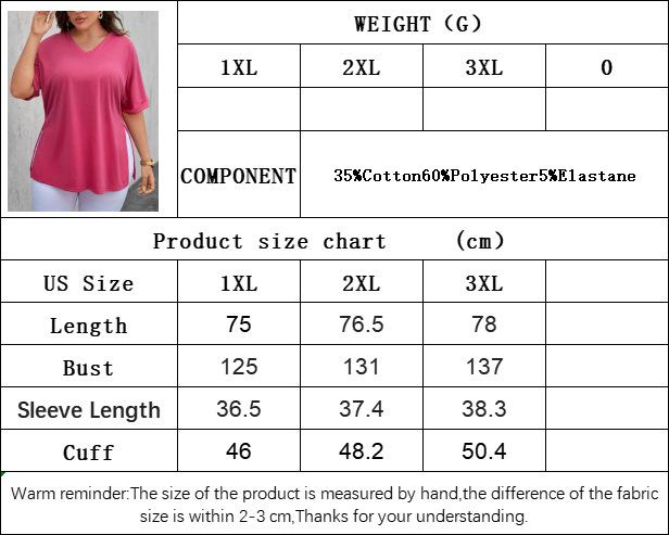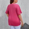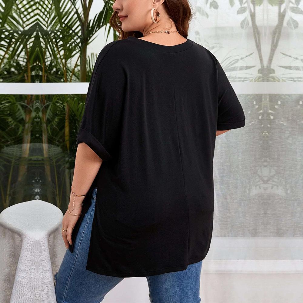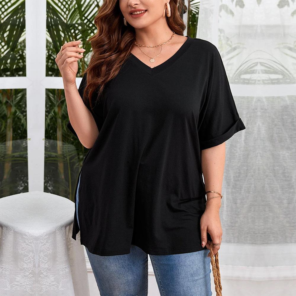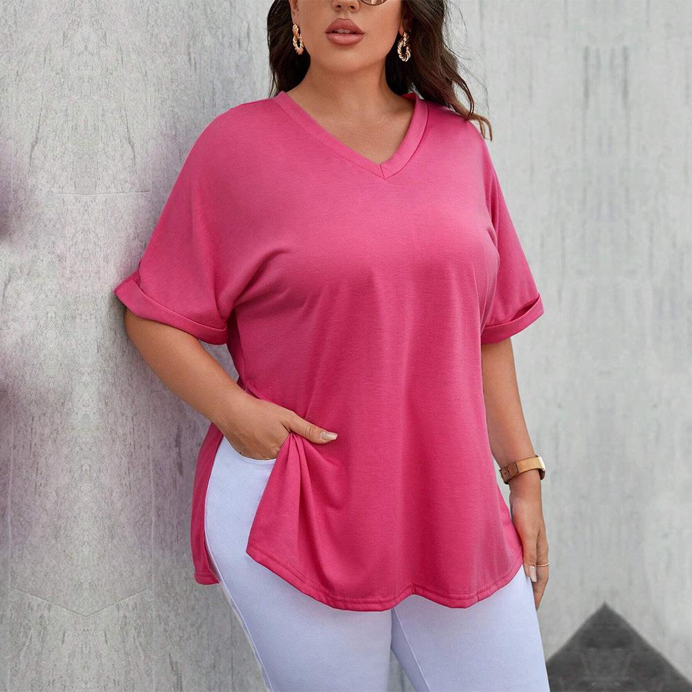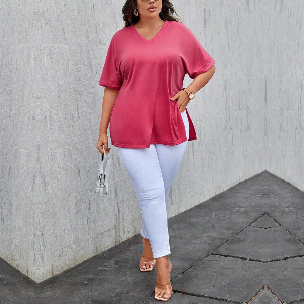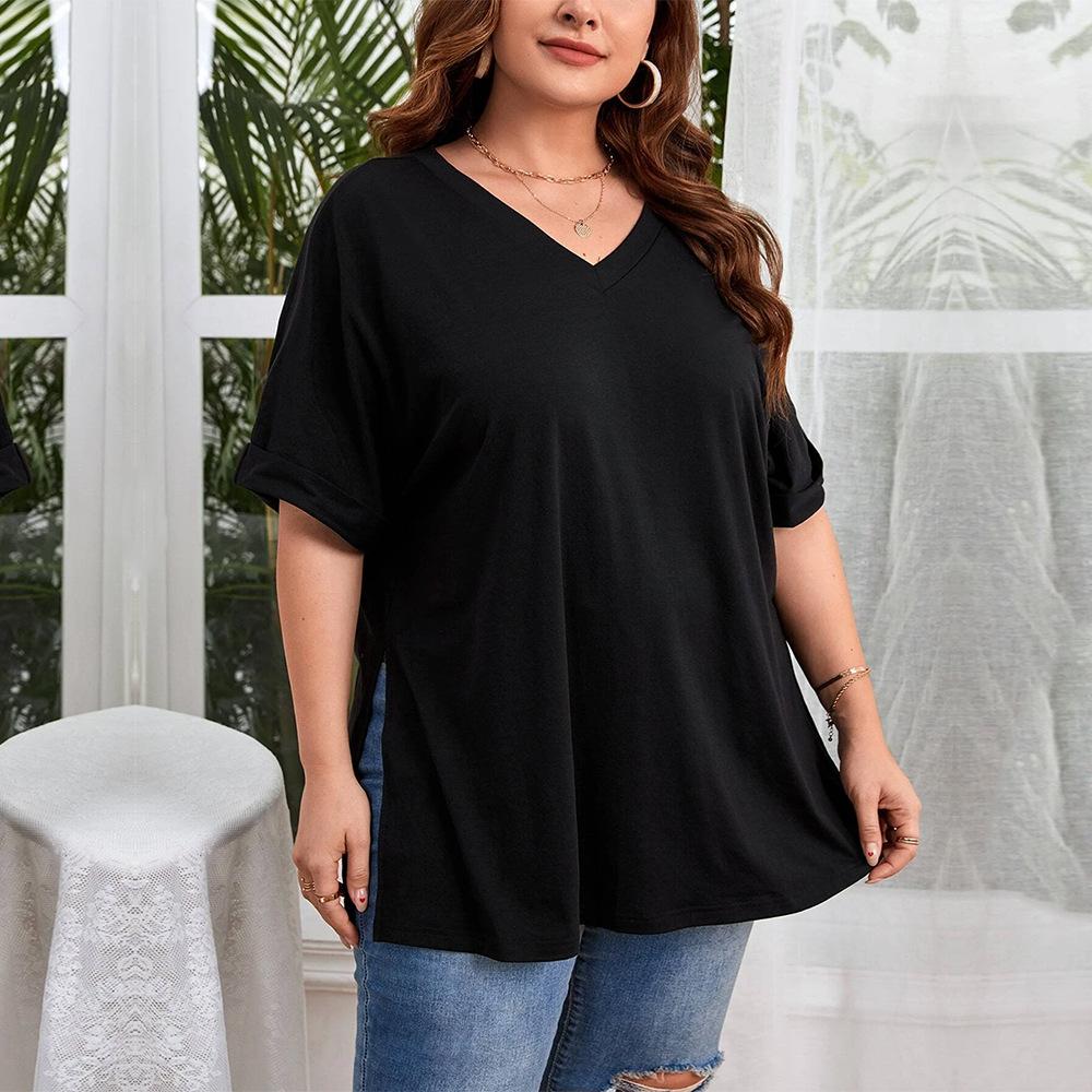Camiseta de manga corta de color liso con escote en V, holgada, informal, con abertura, para mujer, talla grande, comercio exterior de Europa y América, novedad de 2024