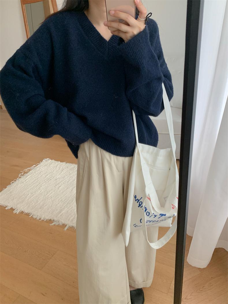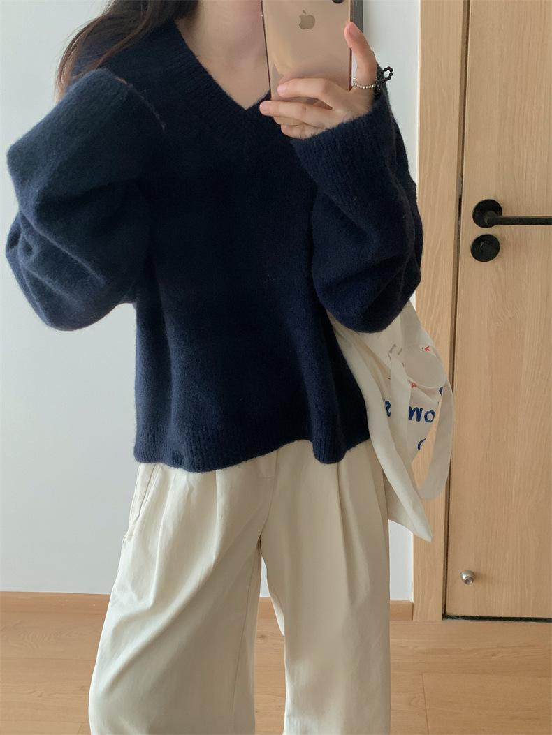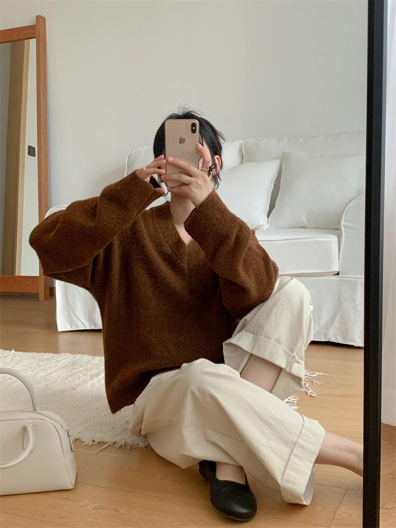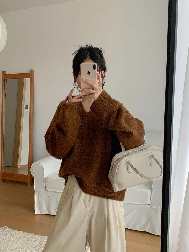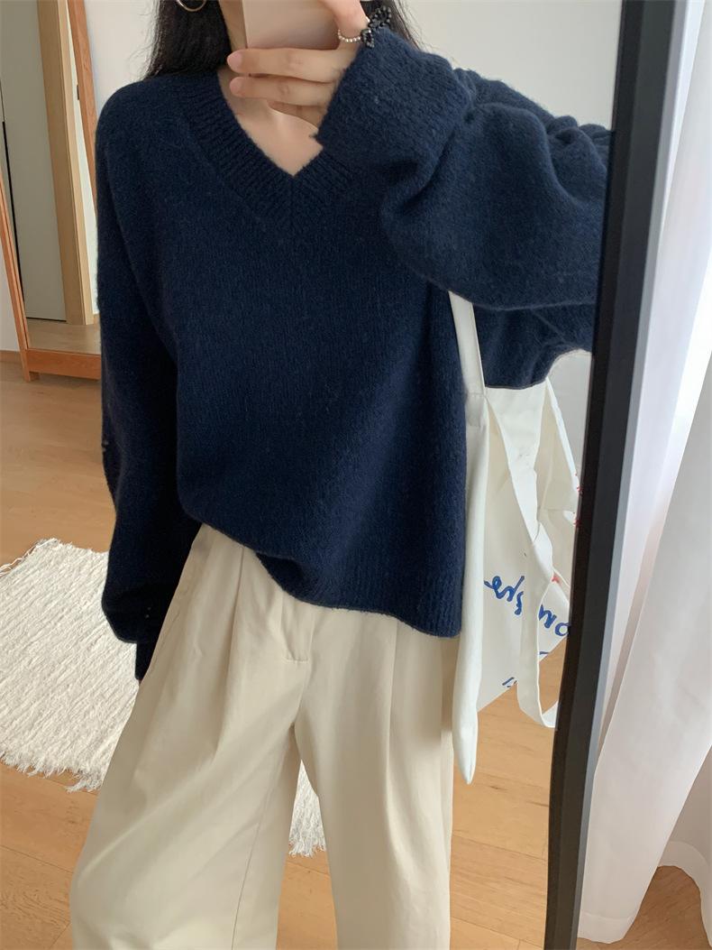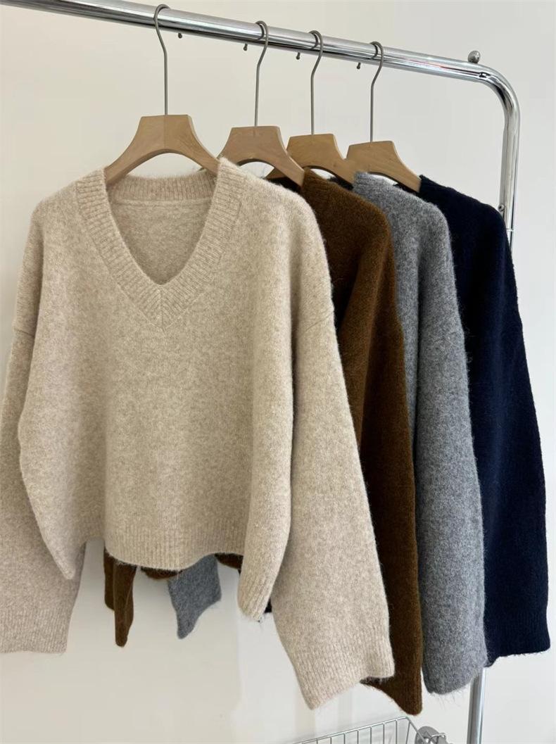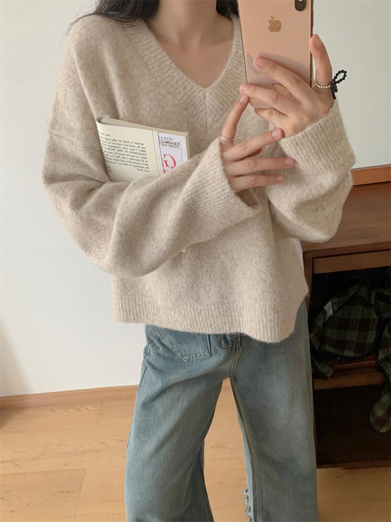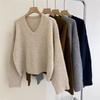 Suéter de cuello en V suave y encerado para mujer, otoño e invierno, nuevo, suelto, estilo perezoso, camisa de punto corta, base superior para mujer