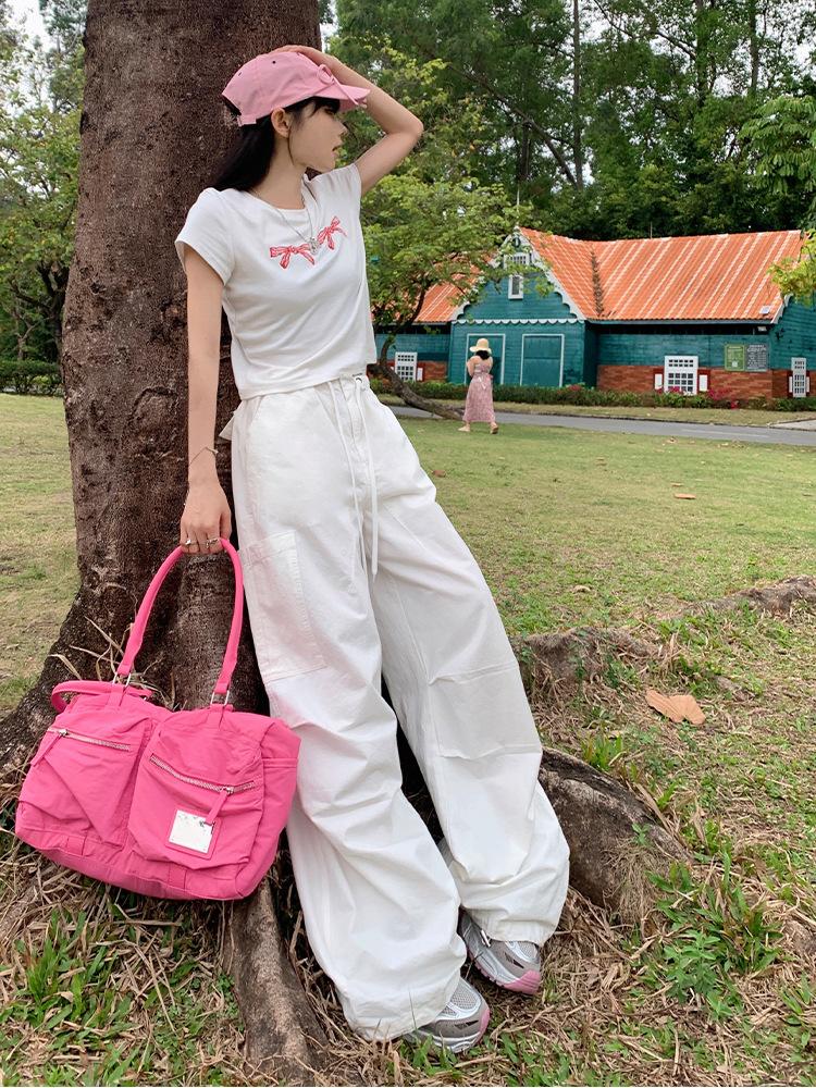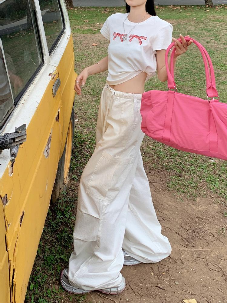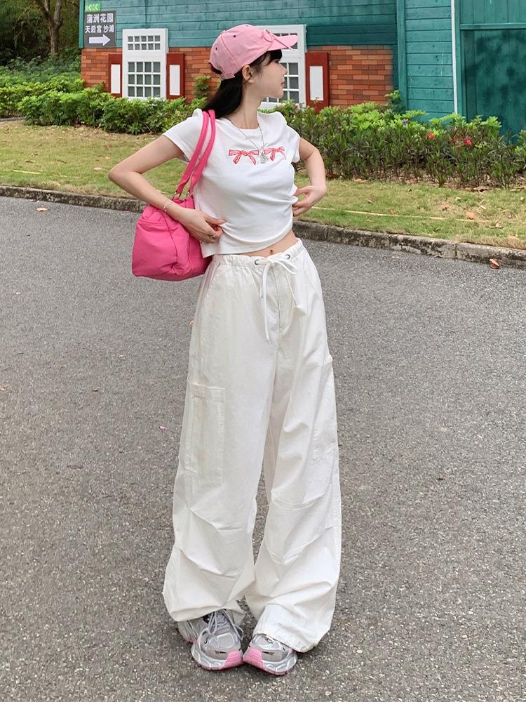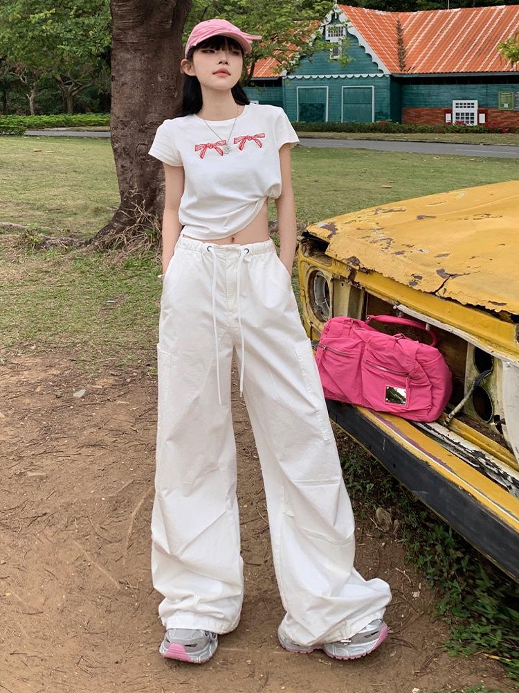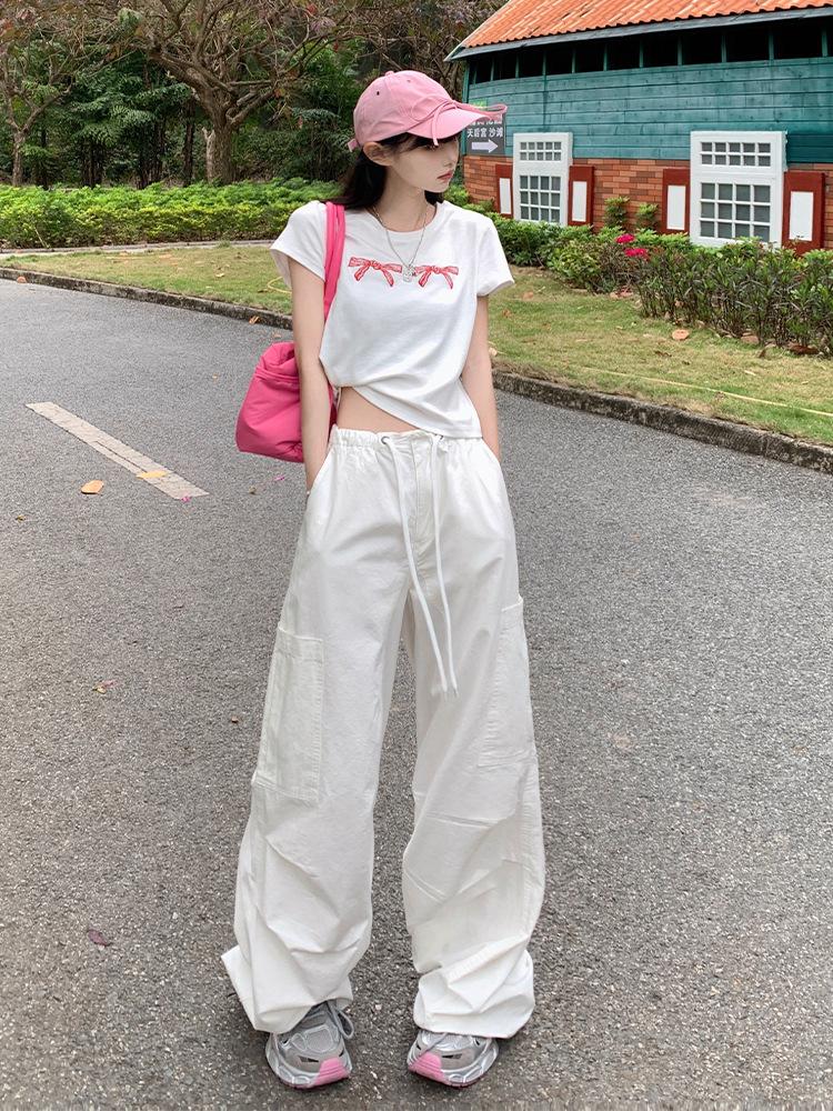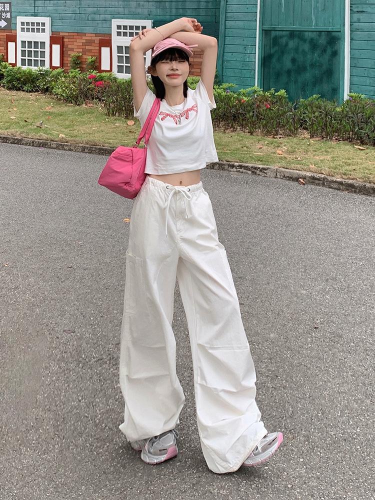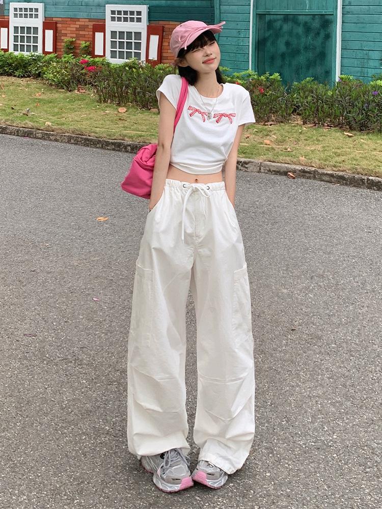 Compra Pantalones anchos con cordón ajustable estilo americano para mujer, primavera y otoño, rectos, sueltos, de cintura alta, adelgazantes, informales, blancos. al por mayor en Joom.pro