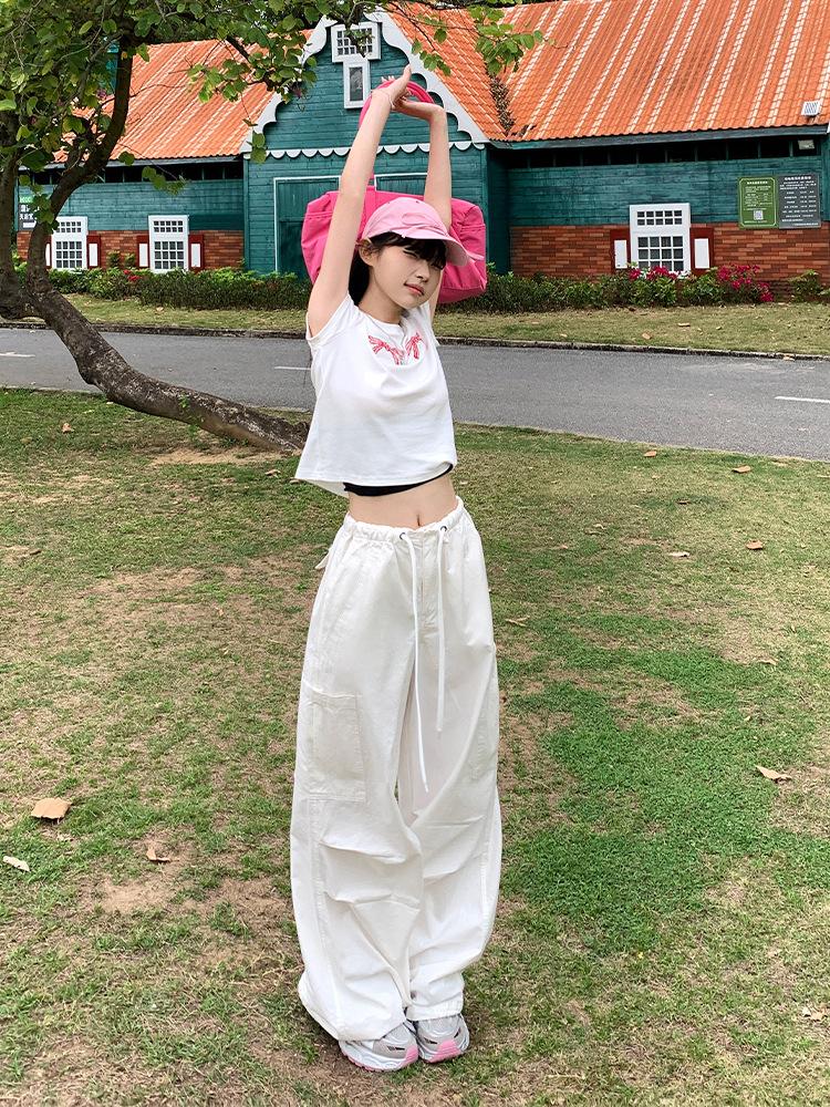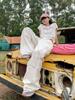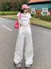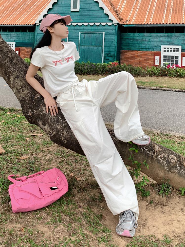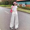 Pantalones anchos con cordón ajustable estilo americano para mujer, primavera y otoño, rectos, sueltos, de cintura alta, adelgazantes, informales, blancos.