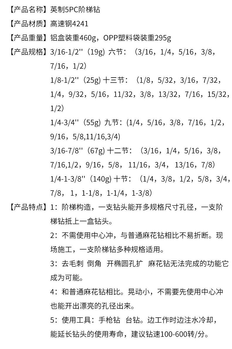 5pc inch step drill (aluminum box), 5pc inch step drill (plastic bag)