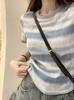 Camiseta de manga corta con hombros descubiertos y rayas degradadas para mujer, diseño nuevo de verano, top informal de media manga con nicho