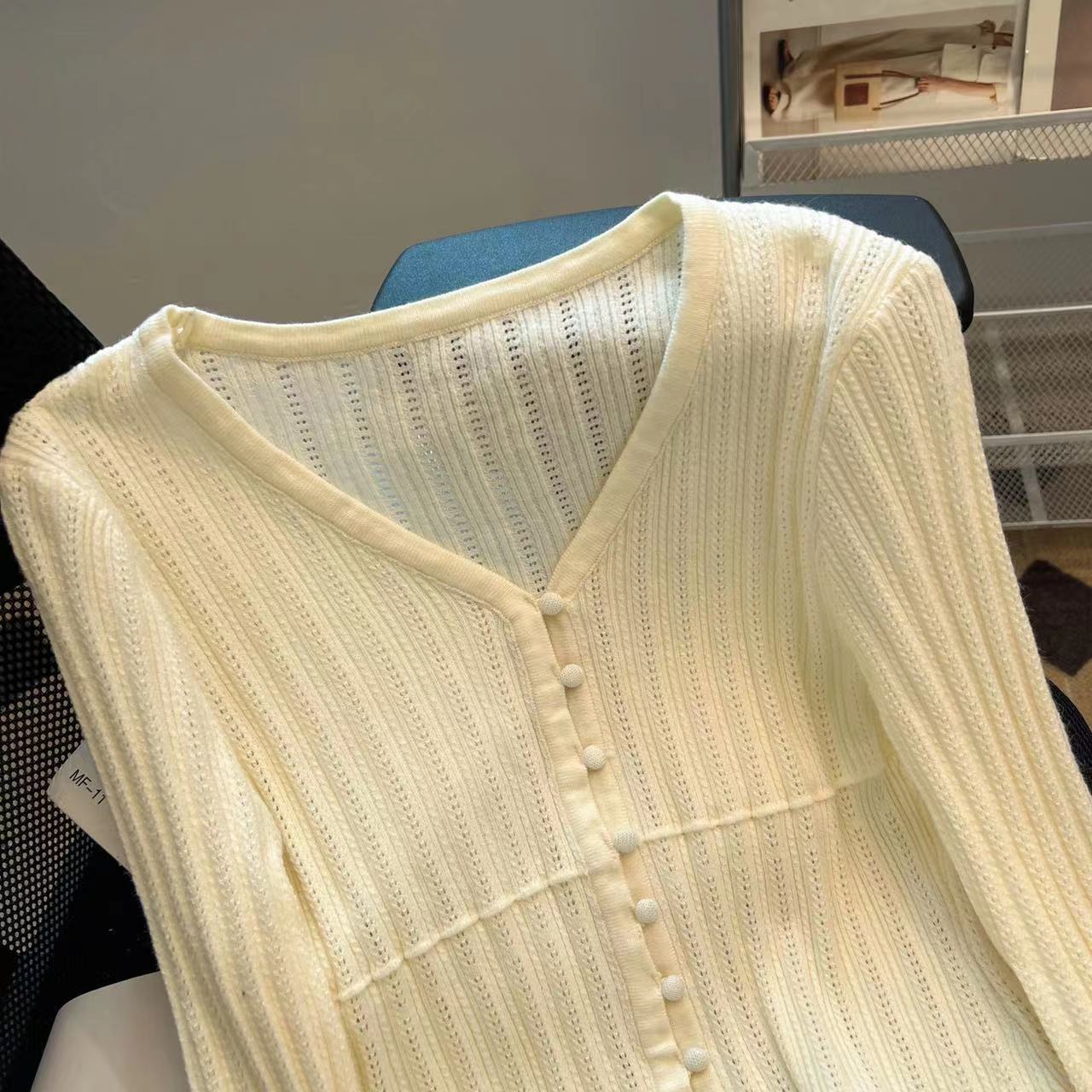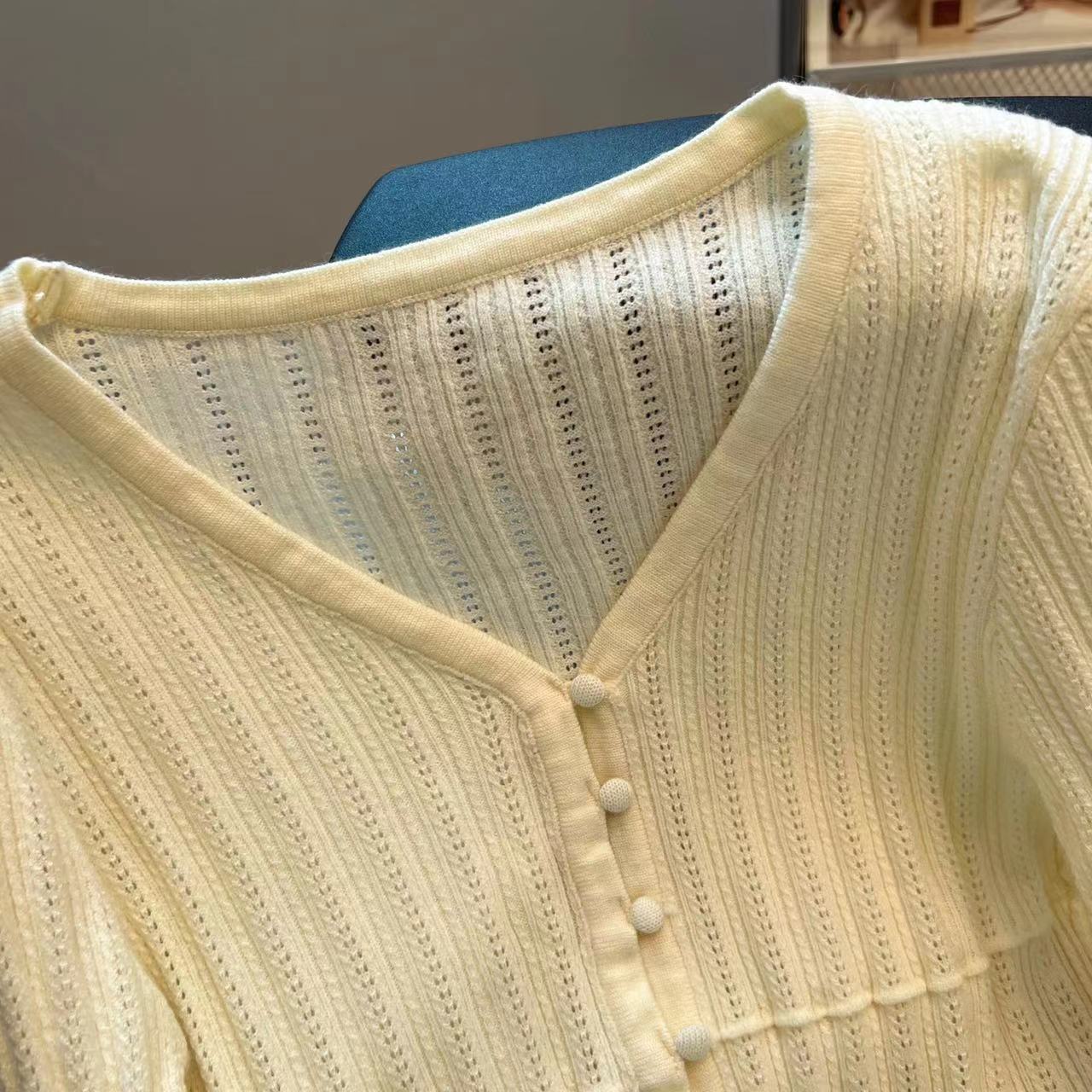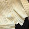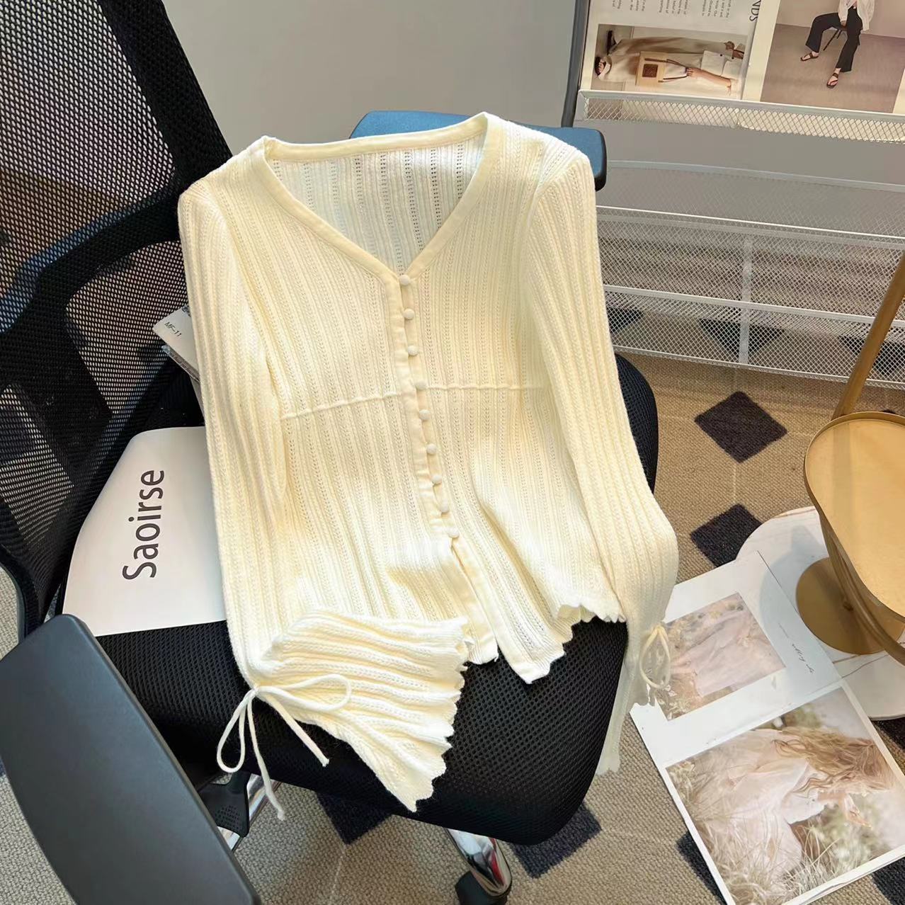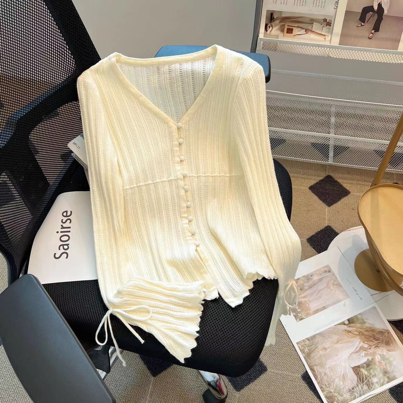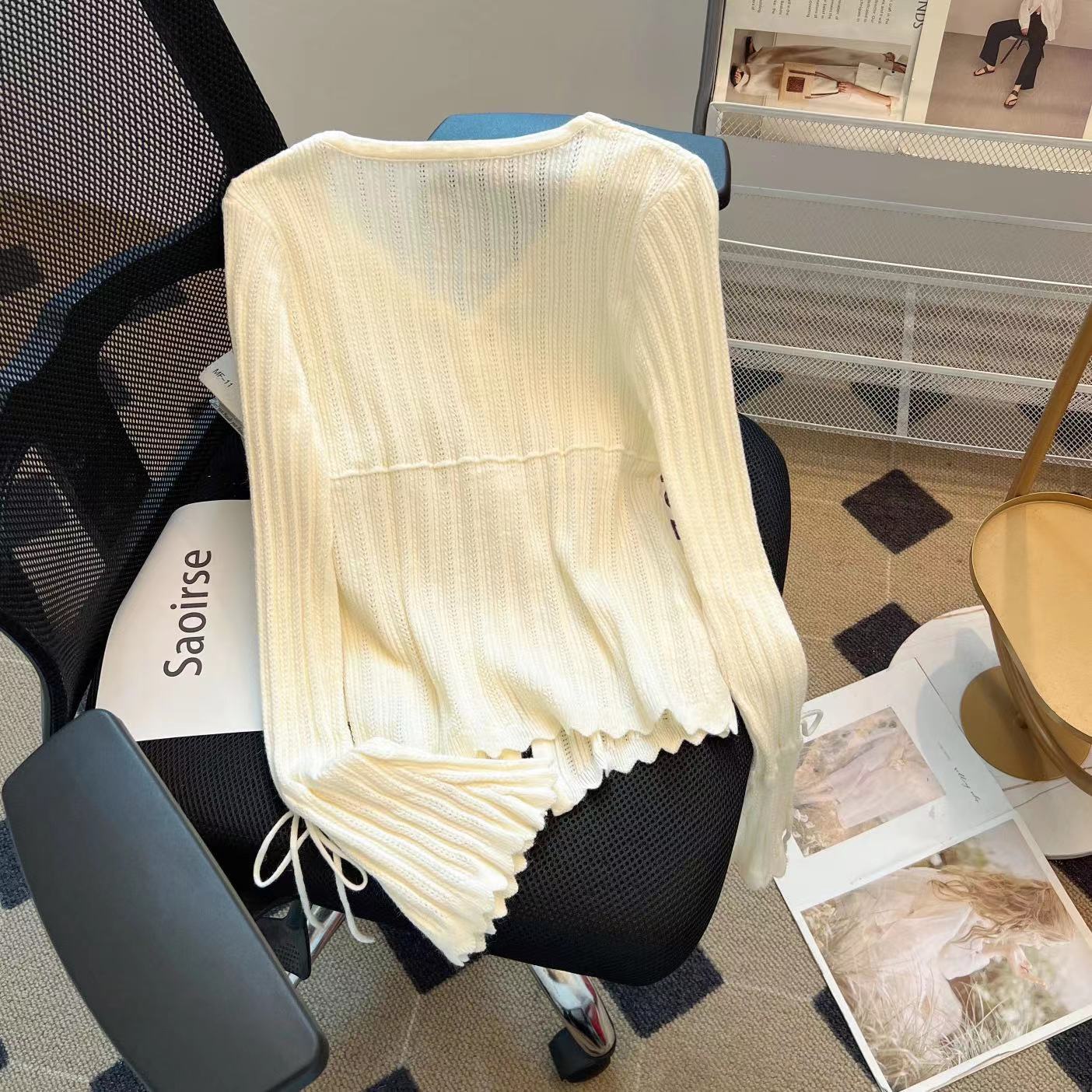 Toma real ~ Top pequeño, dulce y picante, con escote en V y corte entallado para mujer, moda de temperamento, camisa pequeña con mangas de cuerno, camiseta elegante de manga larga con cordones