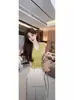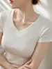 Top corto informal de seda de hielo de alta gama con cuello en V para mujer, camiseta ajustada de verano para mujer, que cubre la clavícula y el vientre.