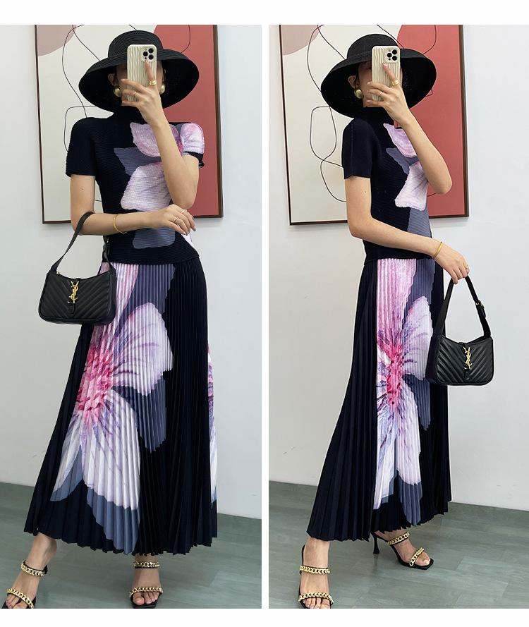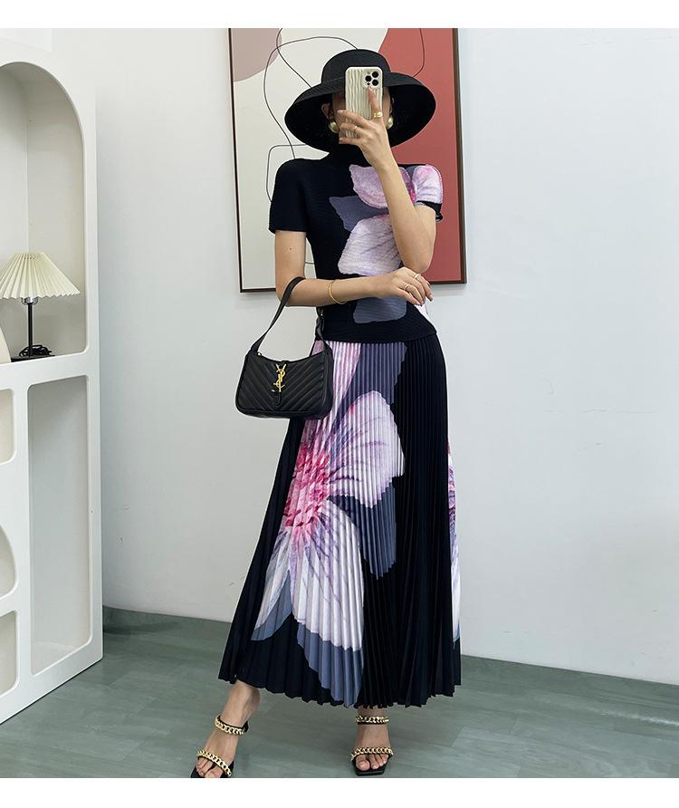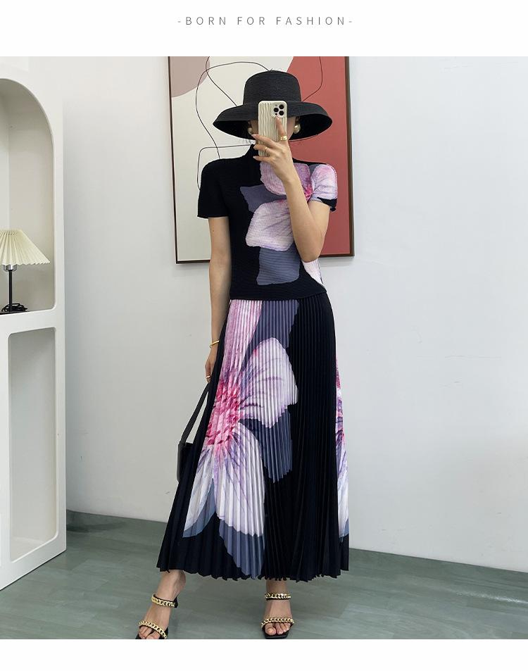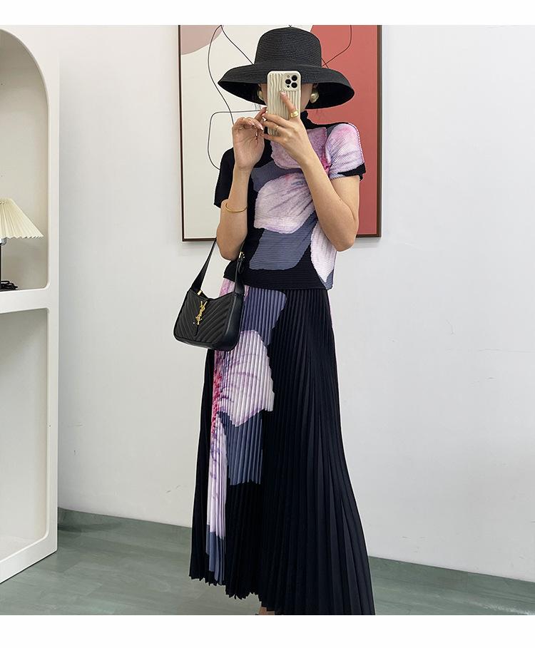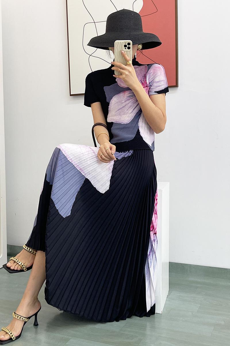 Ropa de gran venta de Xiaohongshu, traje plisado de moda para mujer, top ajustado estampado, falda plisada de manga larga, traje de dos piezas |
