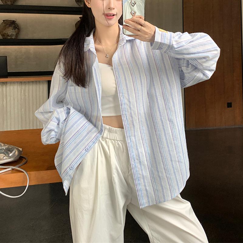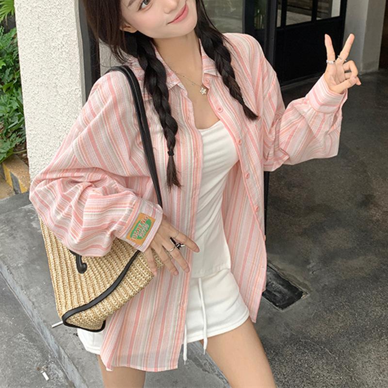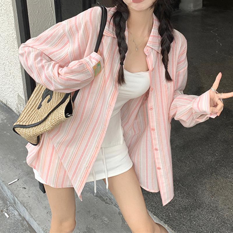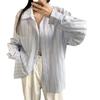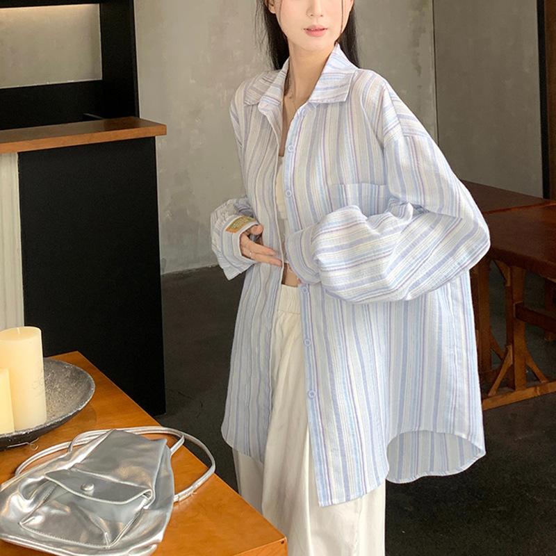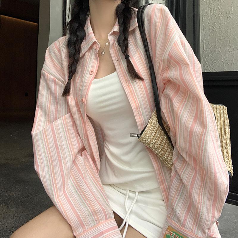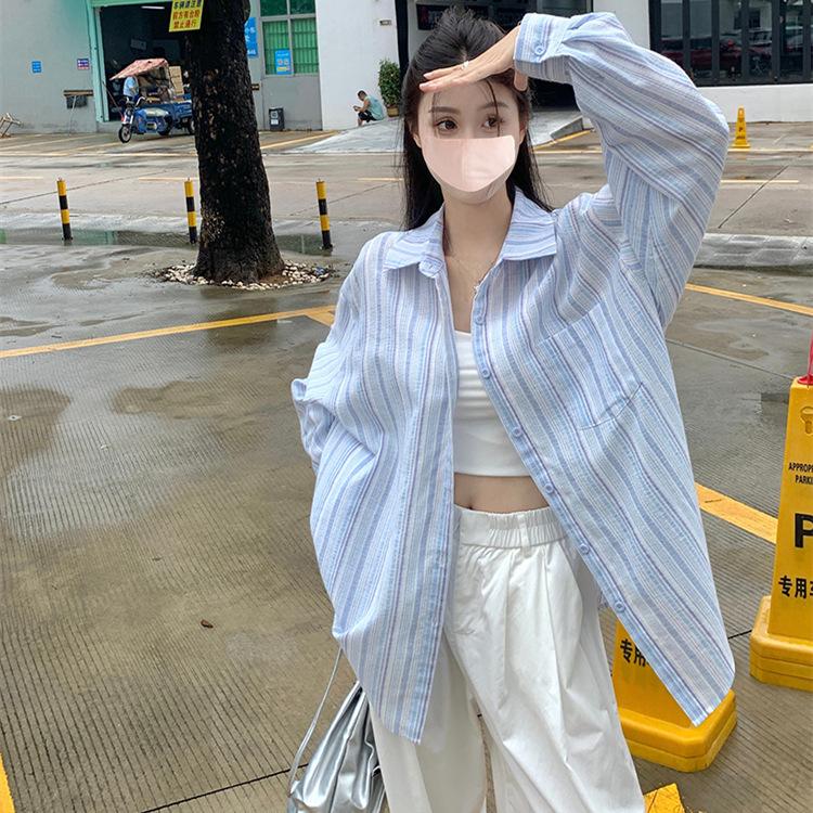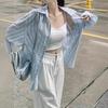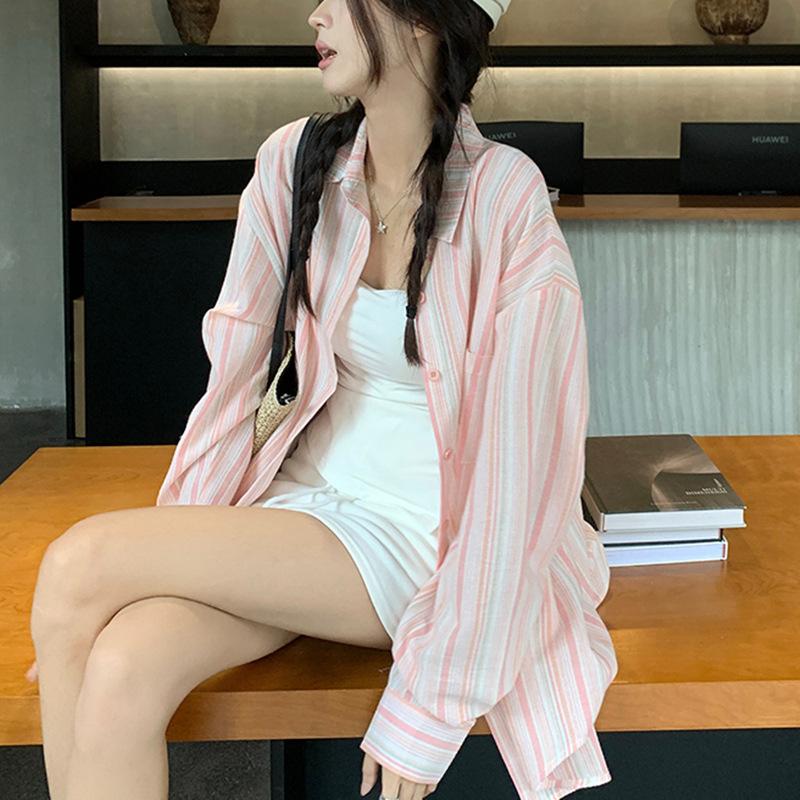Camisa de manga larga fina a rayas de estilo perezoso con protección solar para mujer, nueva blusa holgada de verano que combina con todo, informal, de largo medio y moderna.