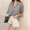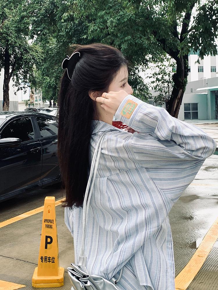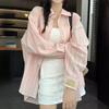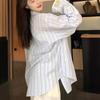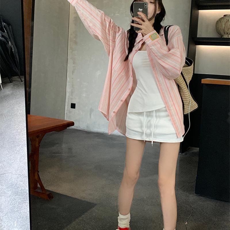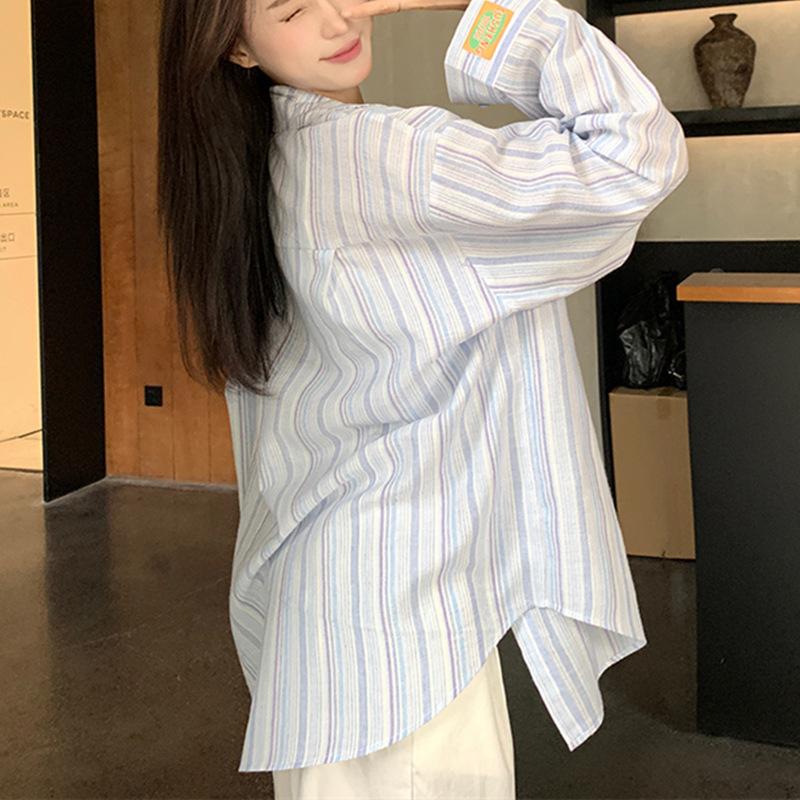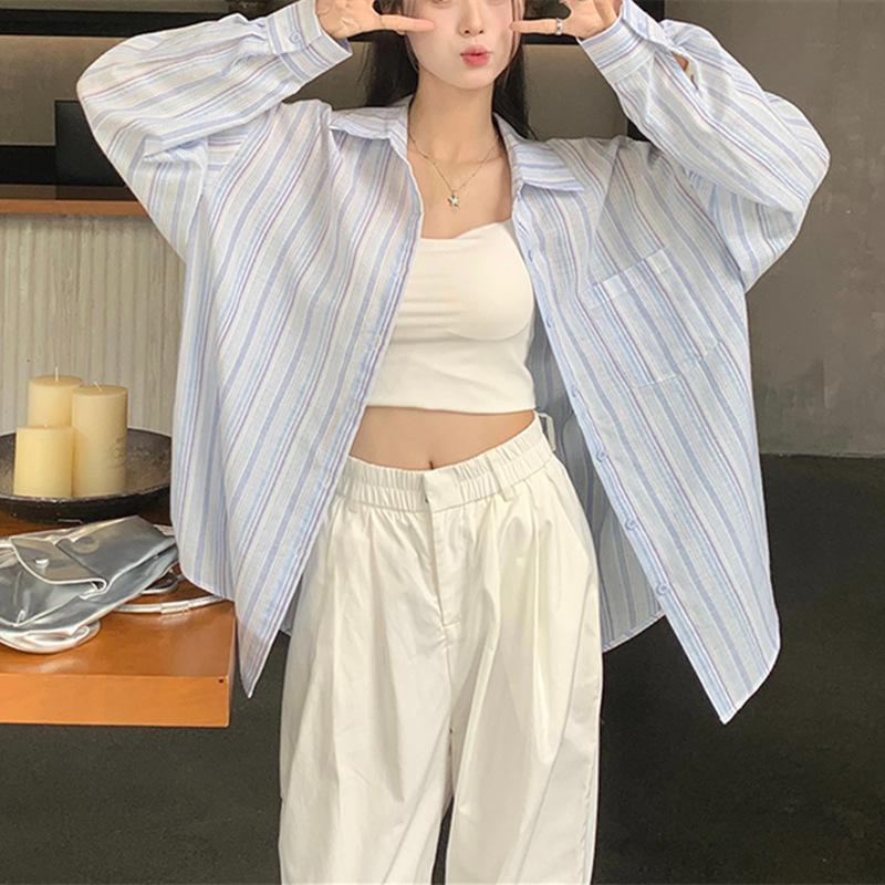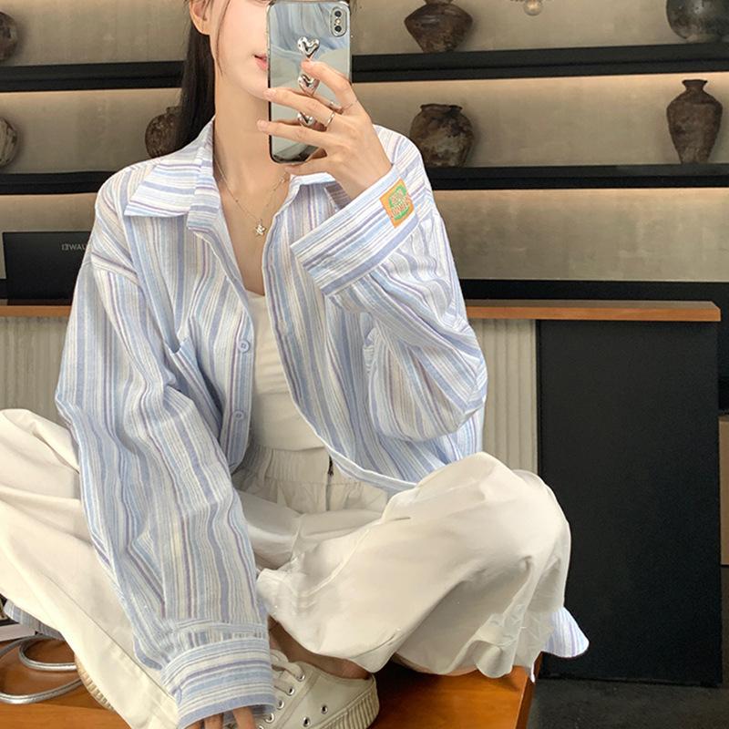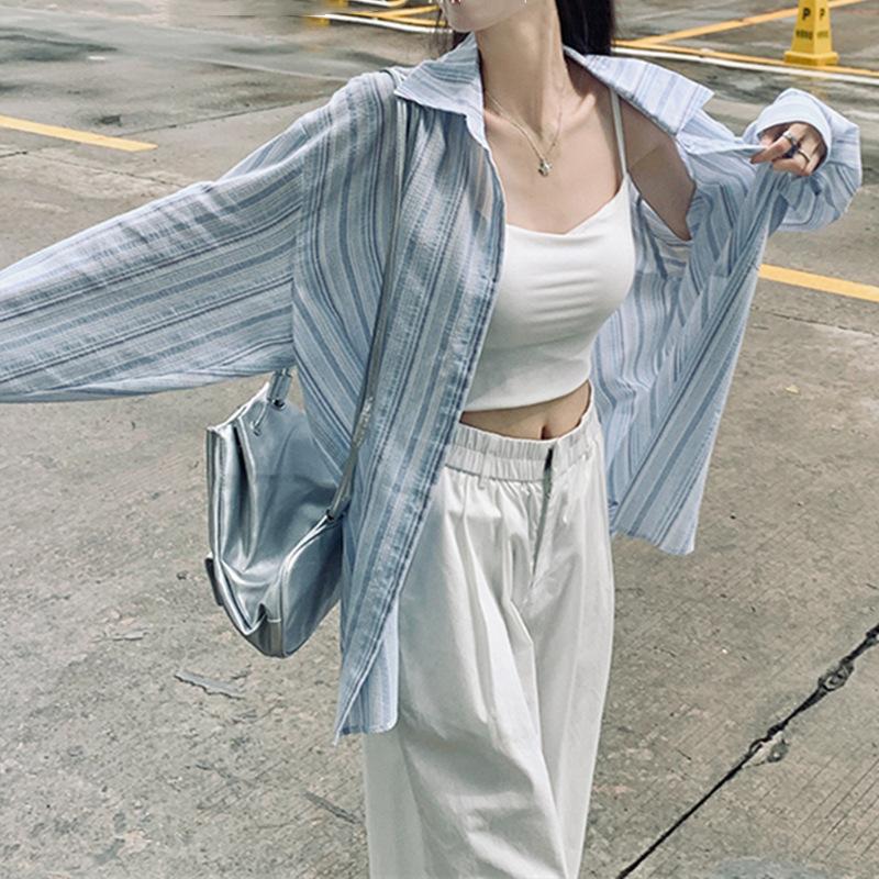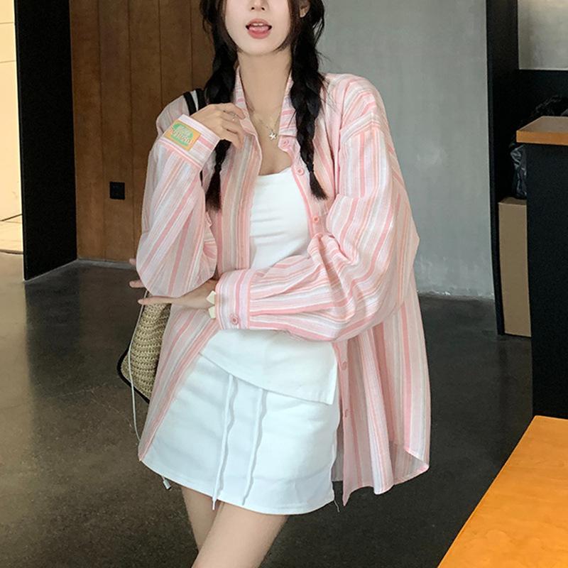 Camisa de manga larga fina a rayas de estilo perezoso con protección solar para mujer, nueva blusa holgada de verano que combina con todo, informal, de largo medio y moderna.