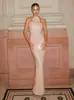En Stock Vestido de Noche Moda Europea y Americana Cuello Halter Albaricoque Blanco Vestido de Lentejuelas Elegante Ajustado Vestido Largo para Mujer
