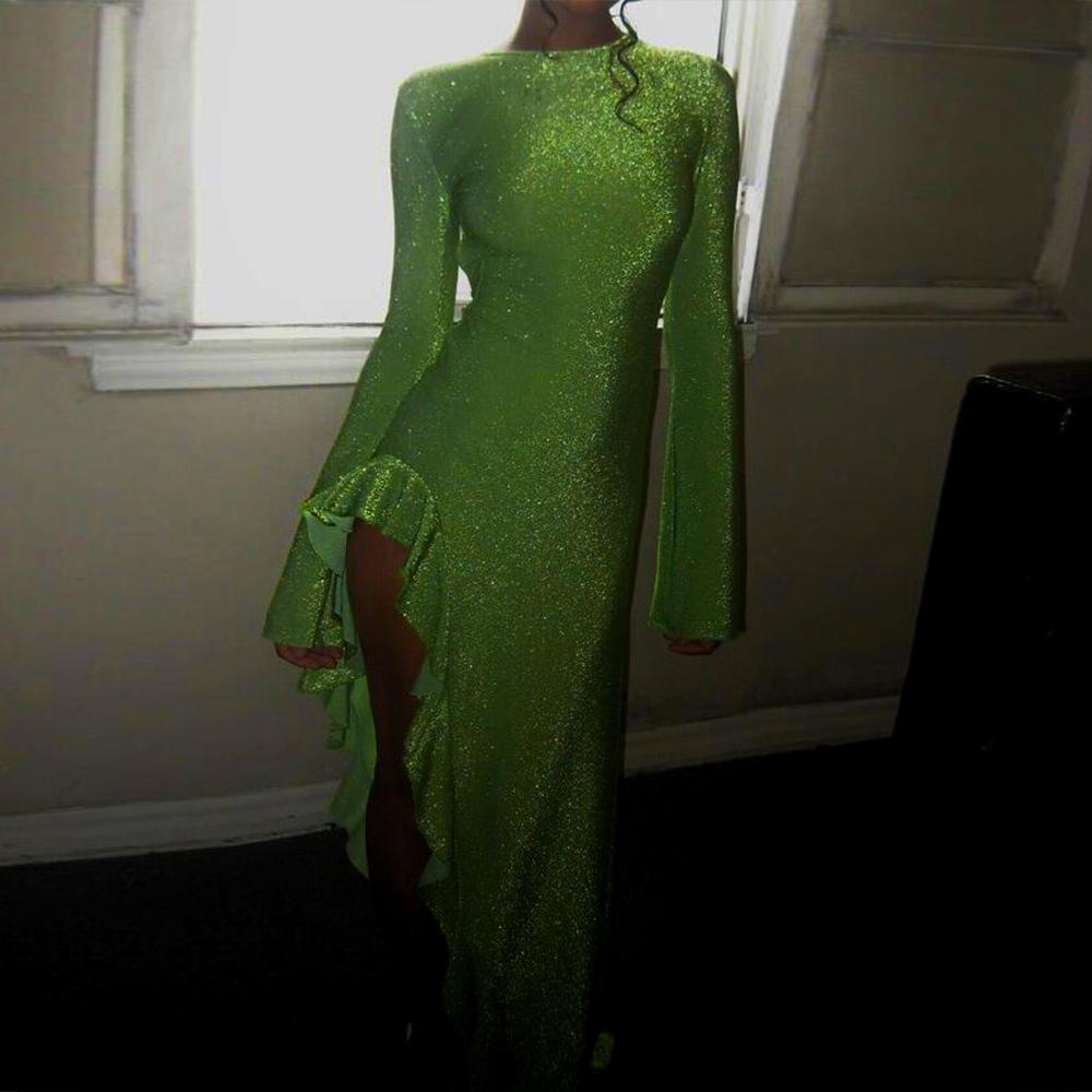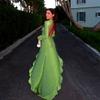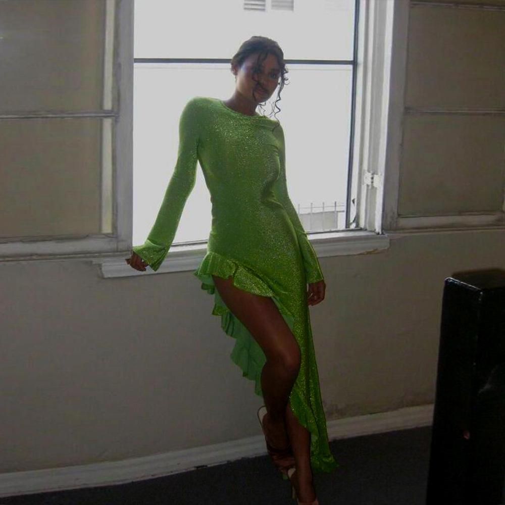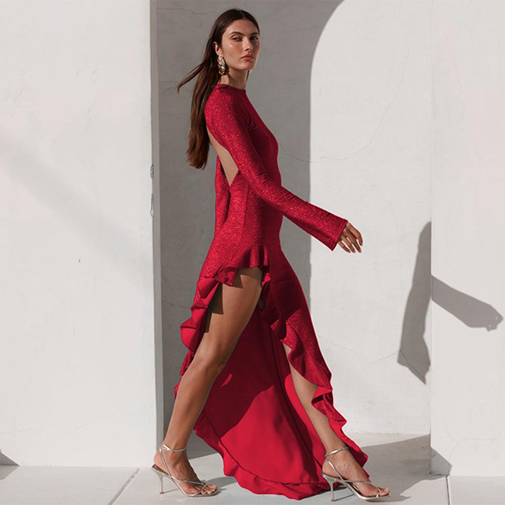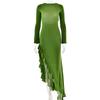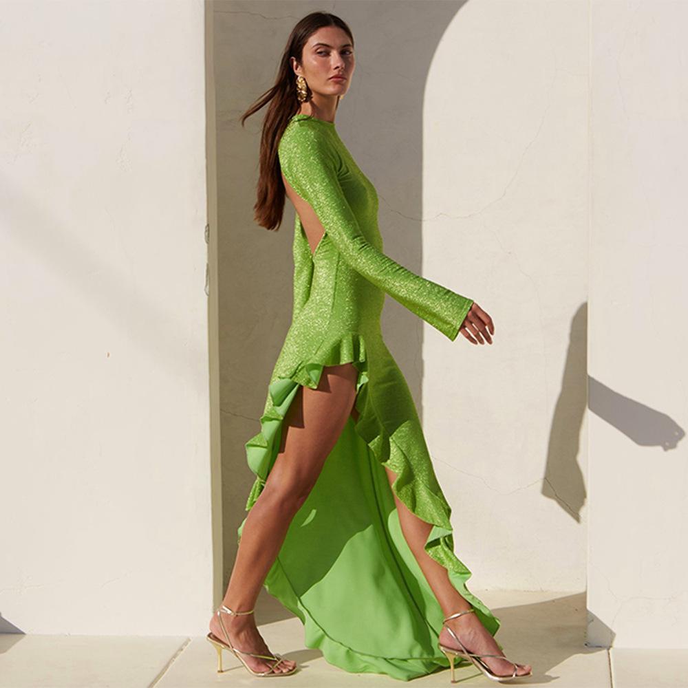red, green, Made of knitted bright silk fabric with asymmetrical ruffles and backless design