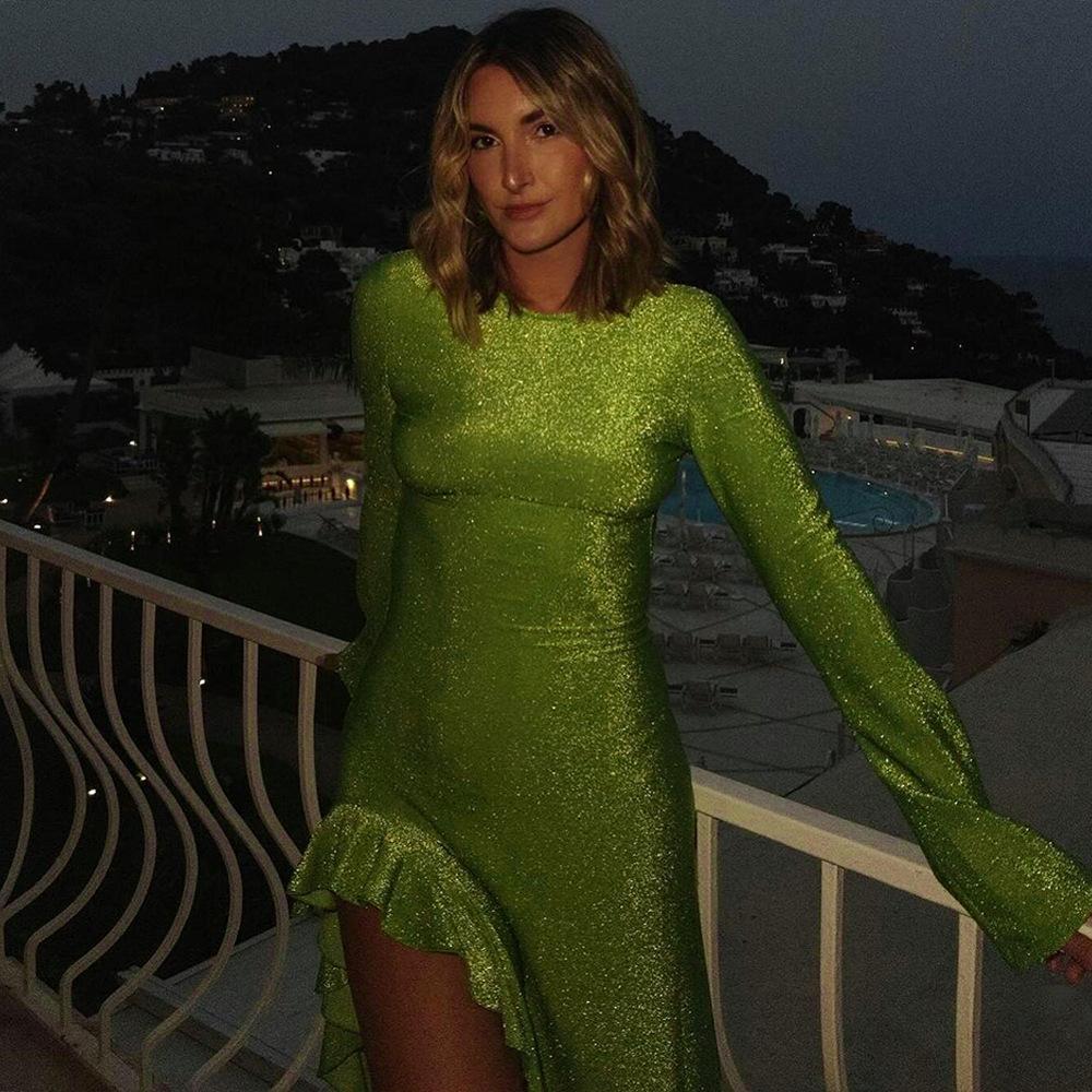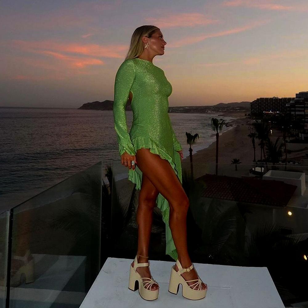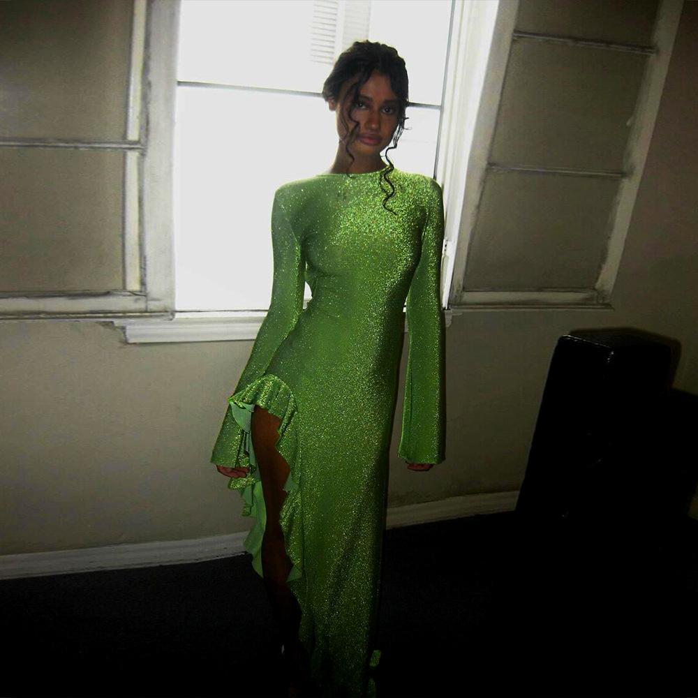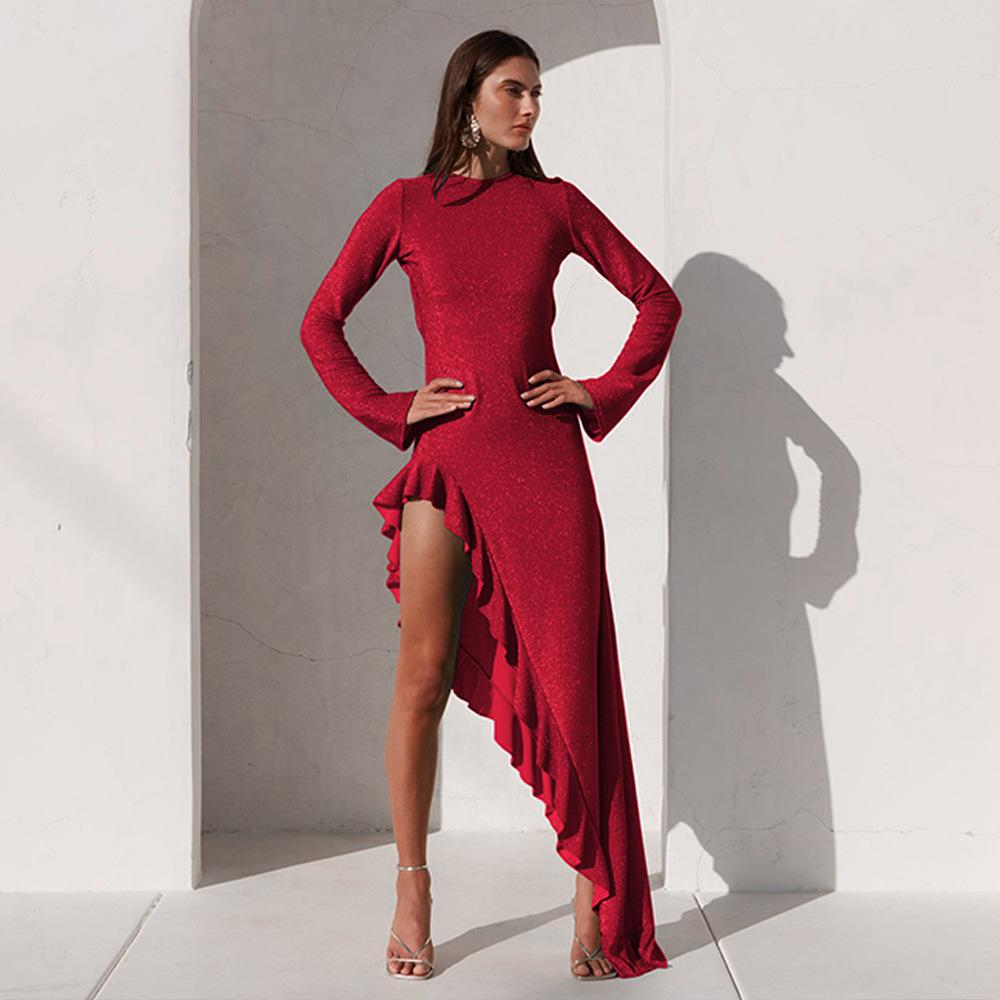 red, green, Made of knitted bright silk fabric with asymmetrical ruffles and backless design