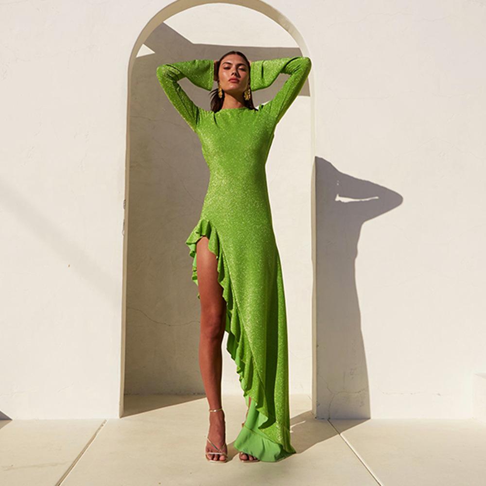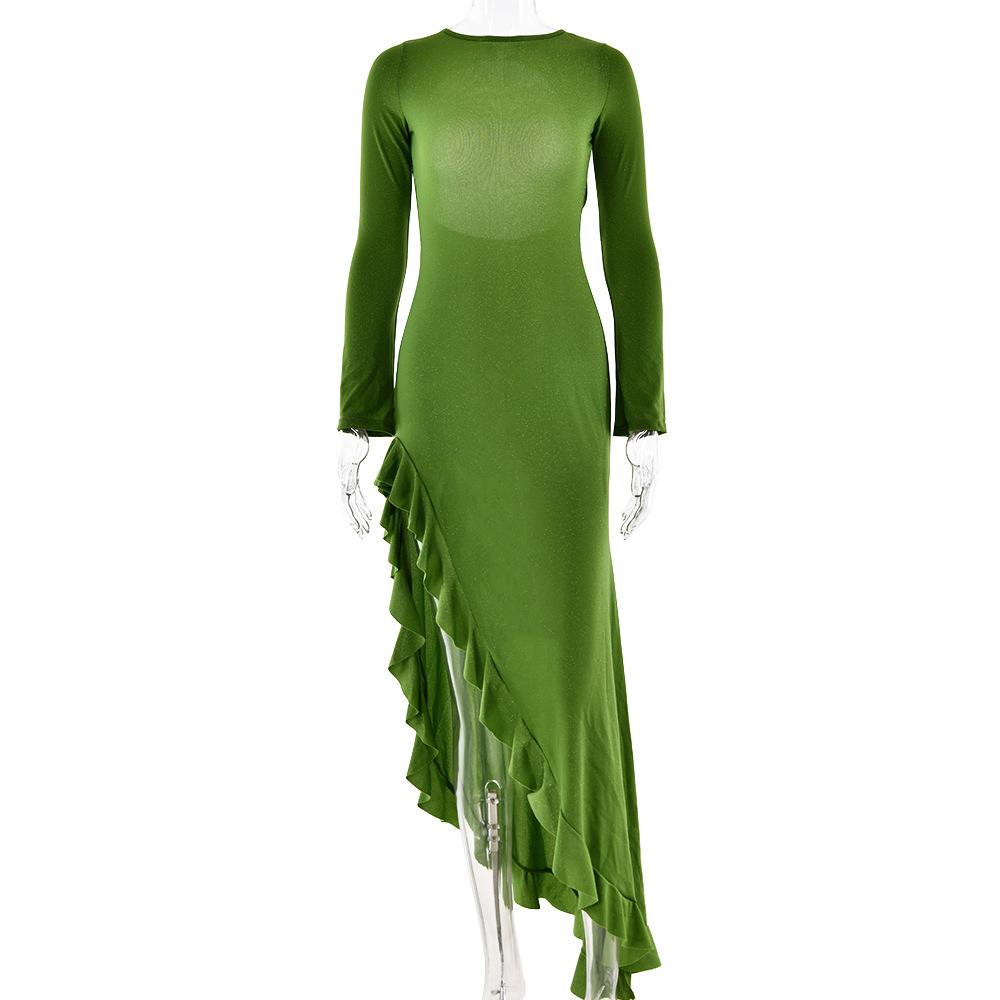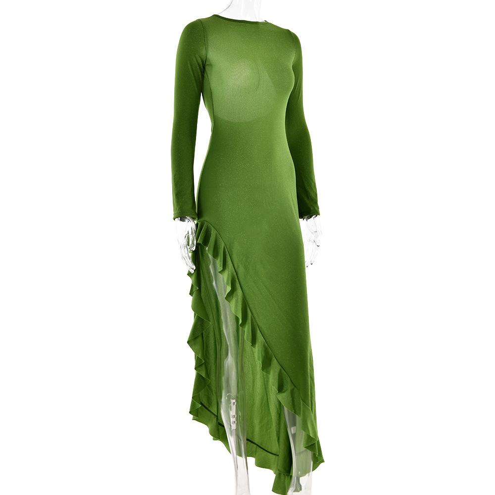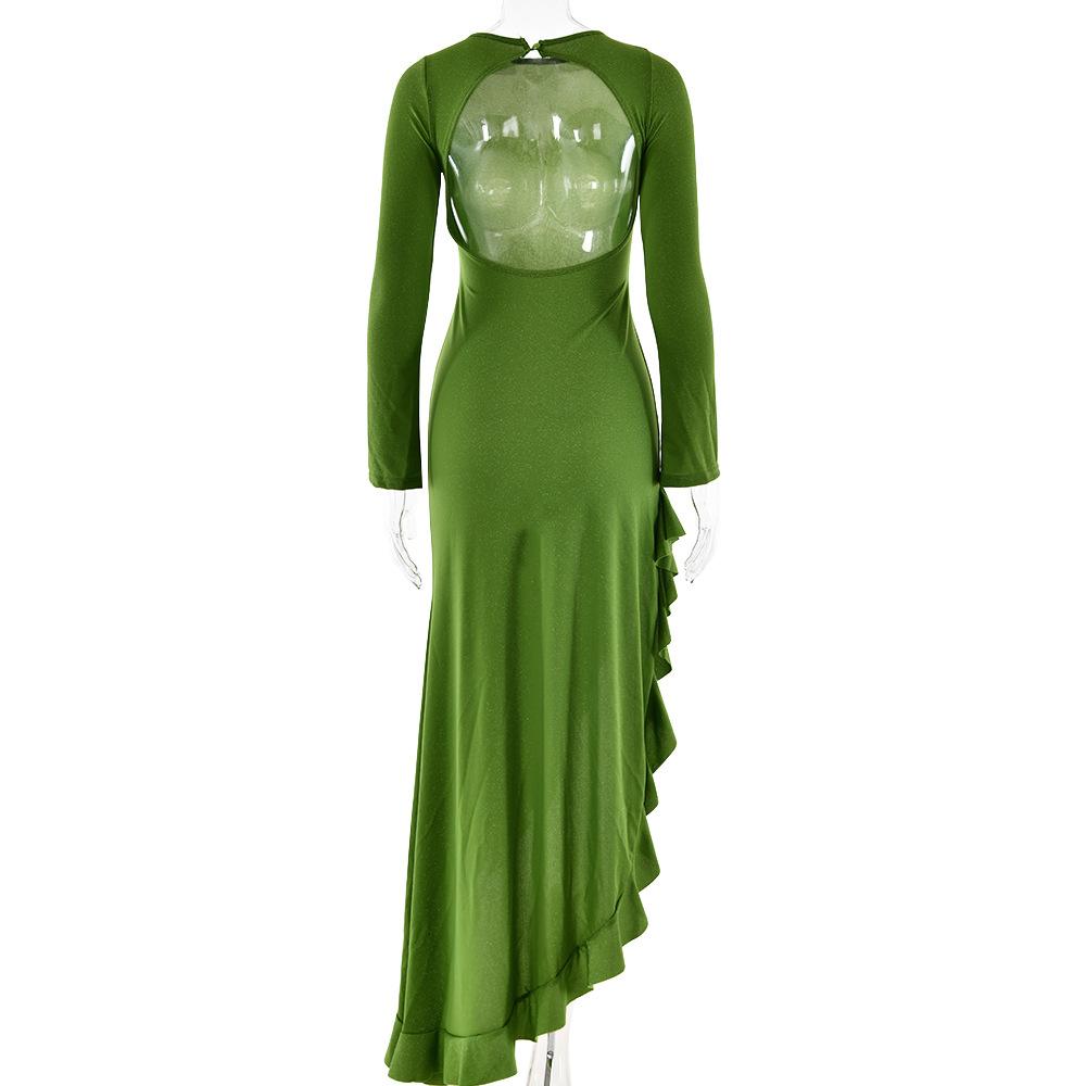 Ropa Sexy para Mujer Europea y Americana Ventas Calientes Transfronterizas 2025 Verano Nuevo Color Puro Cuello Redondo Manga Larga Espalda Descubierta Vestido con Abertura Alta