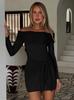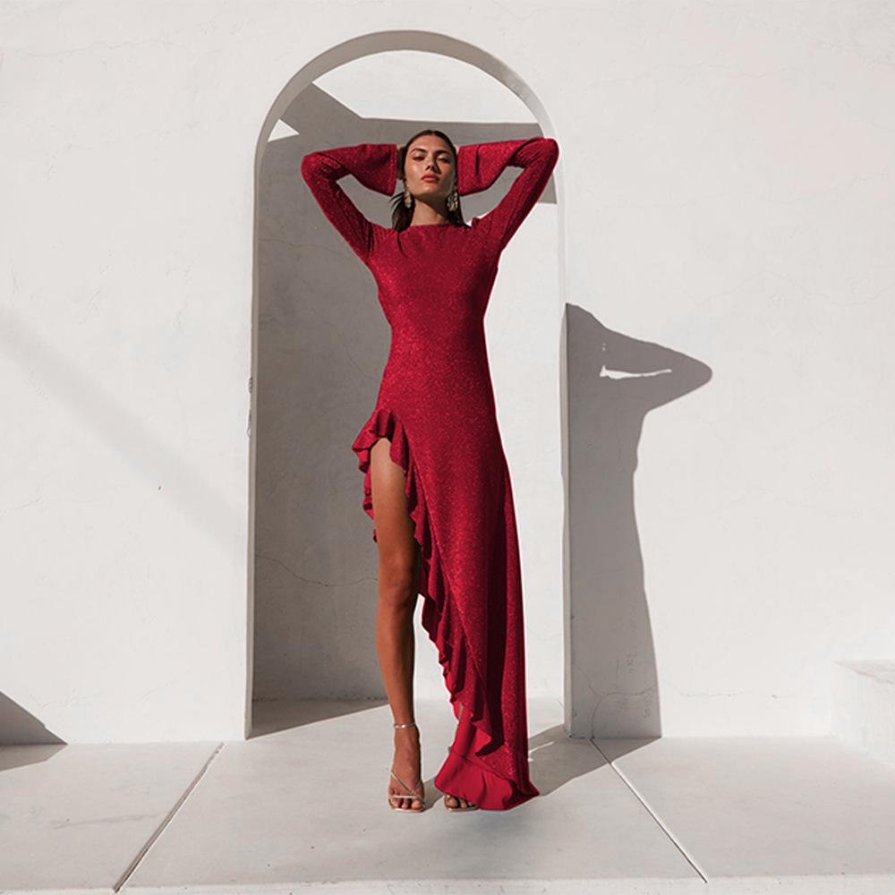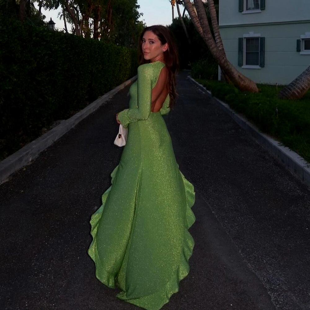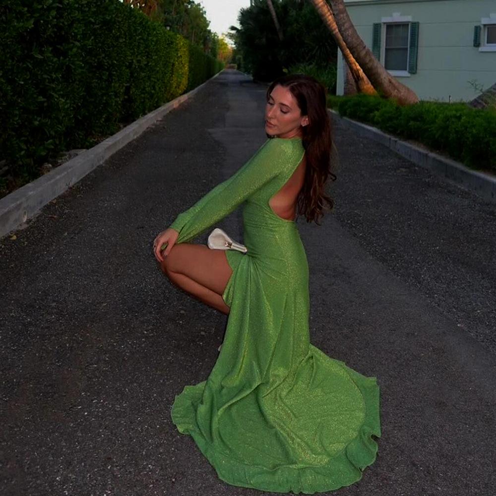 Ropa Sexy para Mujer Europea y Americana Ventas Calientes Transfronterizas 2025 Verano Nuevo Color Puro Cuello Redondo Manga Larga Espalda Descubierta Vestido con Abertura Alta