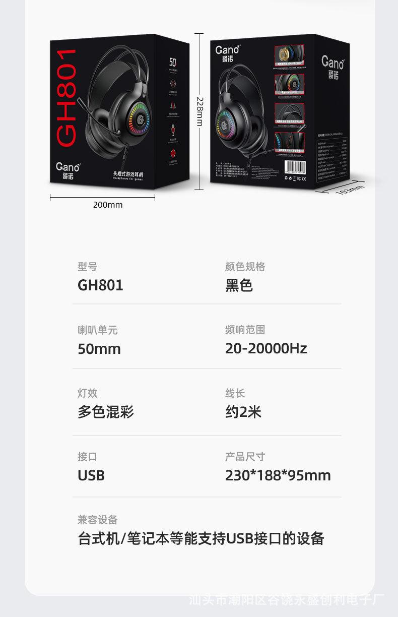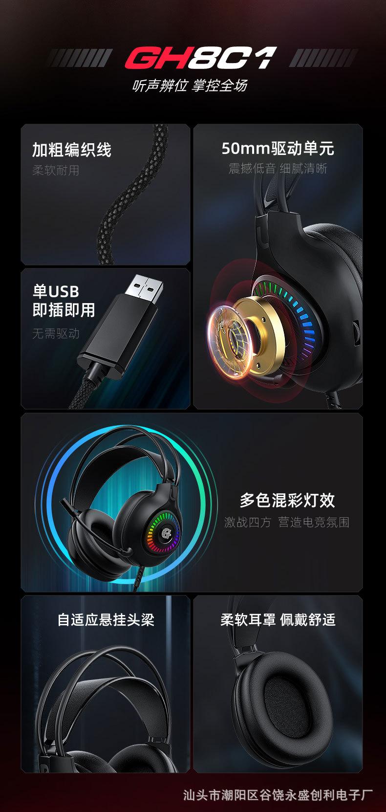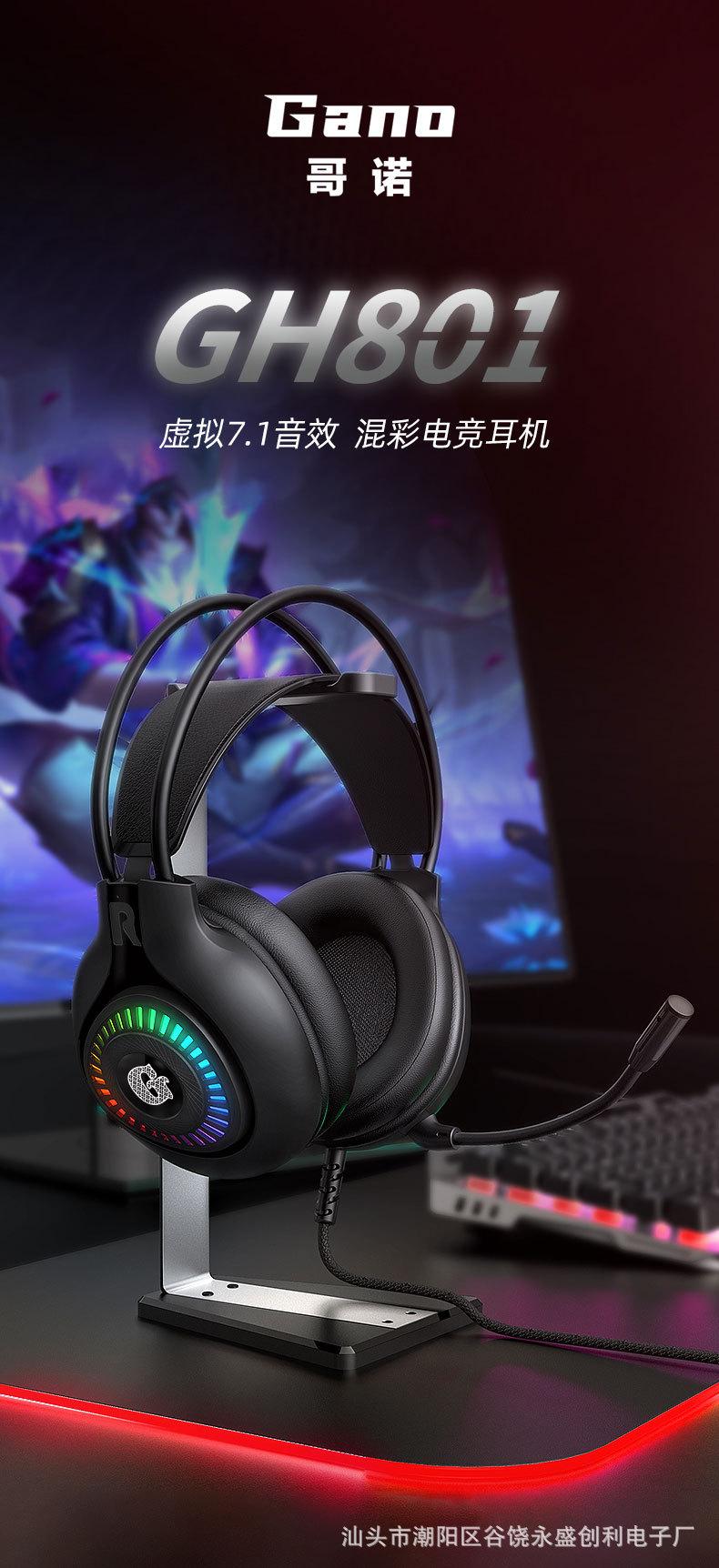 Auriculares para juegos de deportes electrónicos con café en Internet GH801, auriculares con cable USB, tarjeta de sonido 7.1 RGB, para comer pollo, escuchar voz y bits de habla