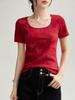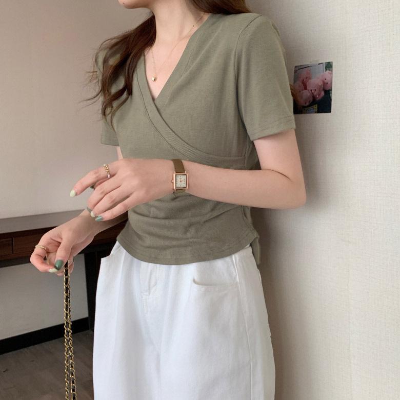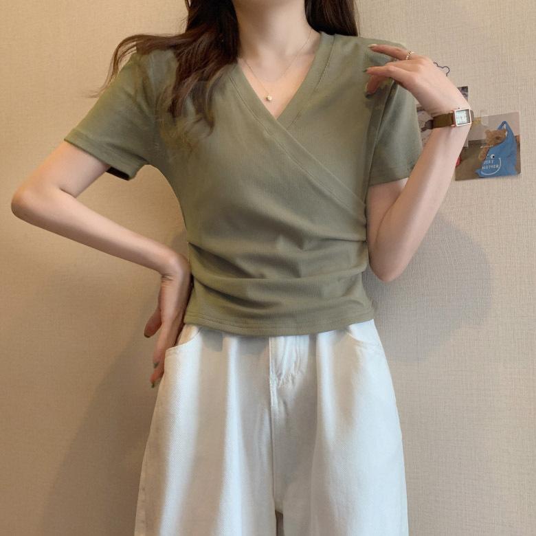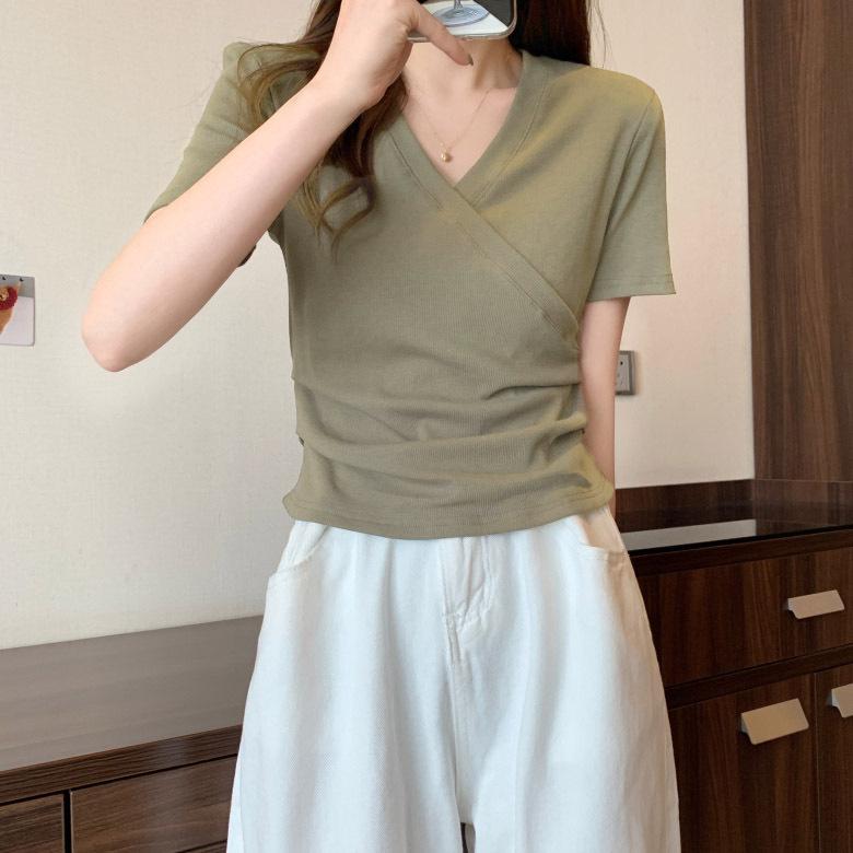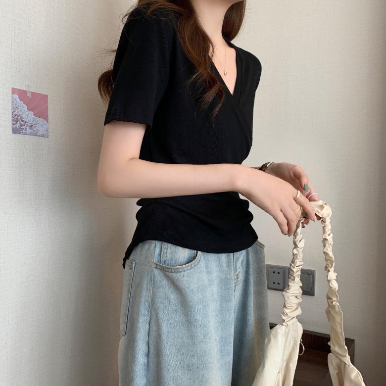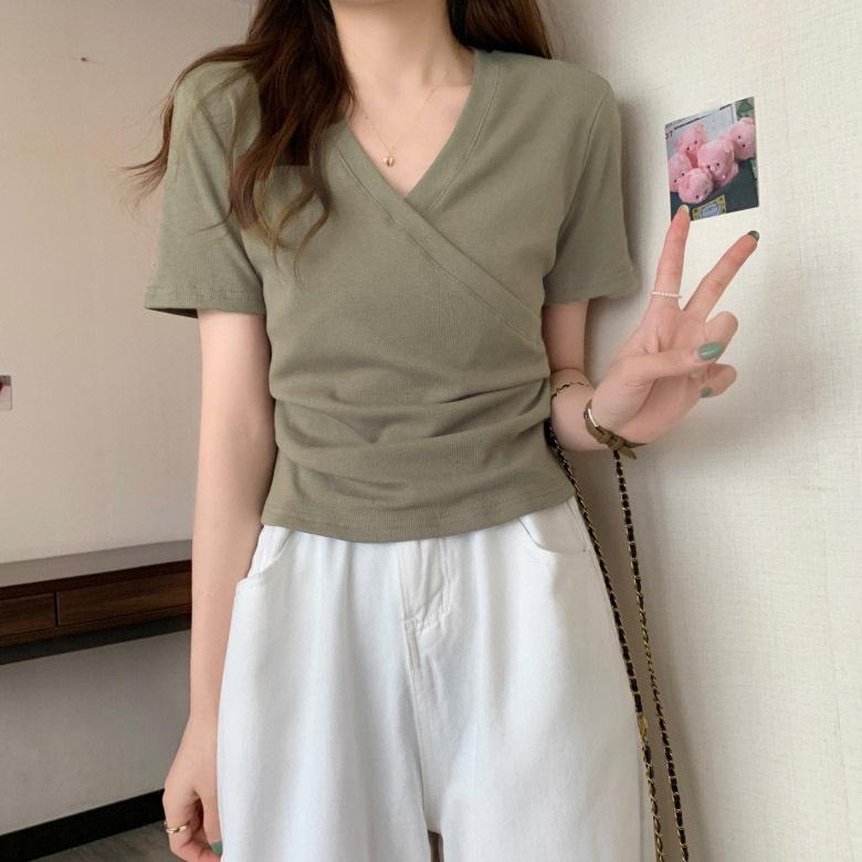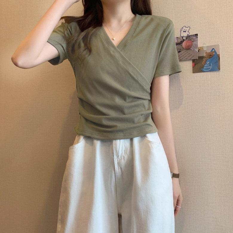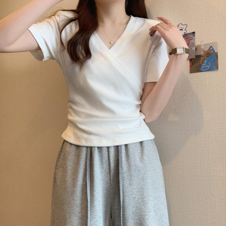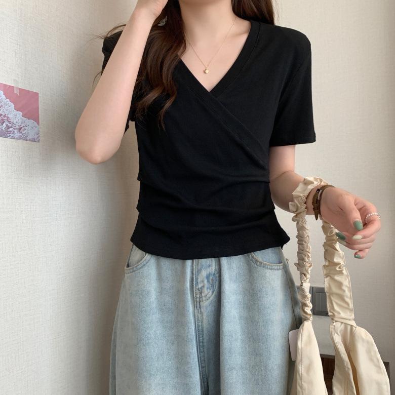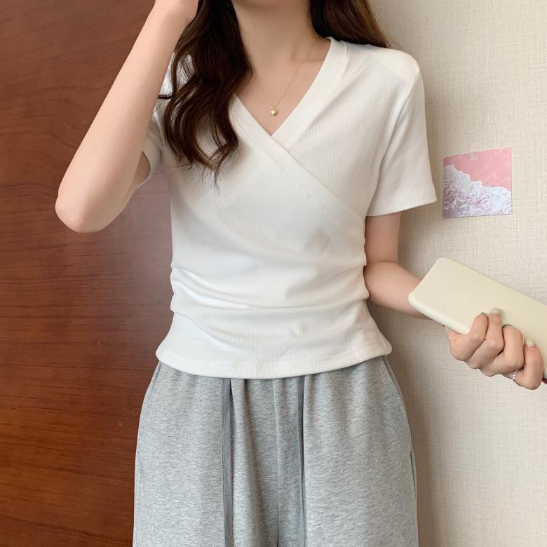Playera de Manga Corta con Cuello en V y Hombros Cruzados para Mujer Verano 2025 Nuevo Look Adelgazante Estilo Dulce y Picante Top Ajustado