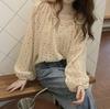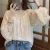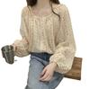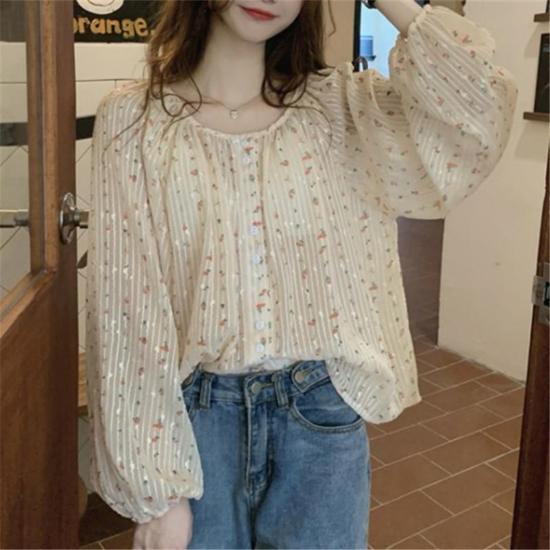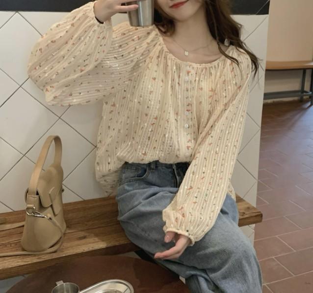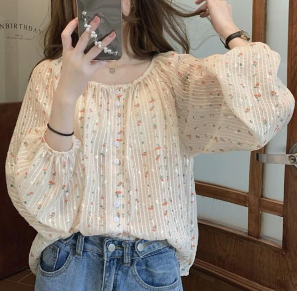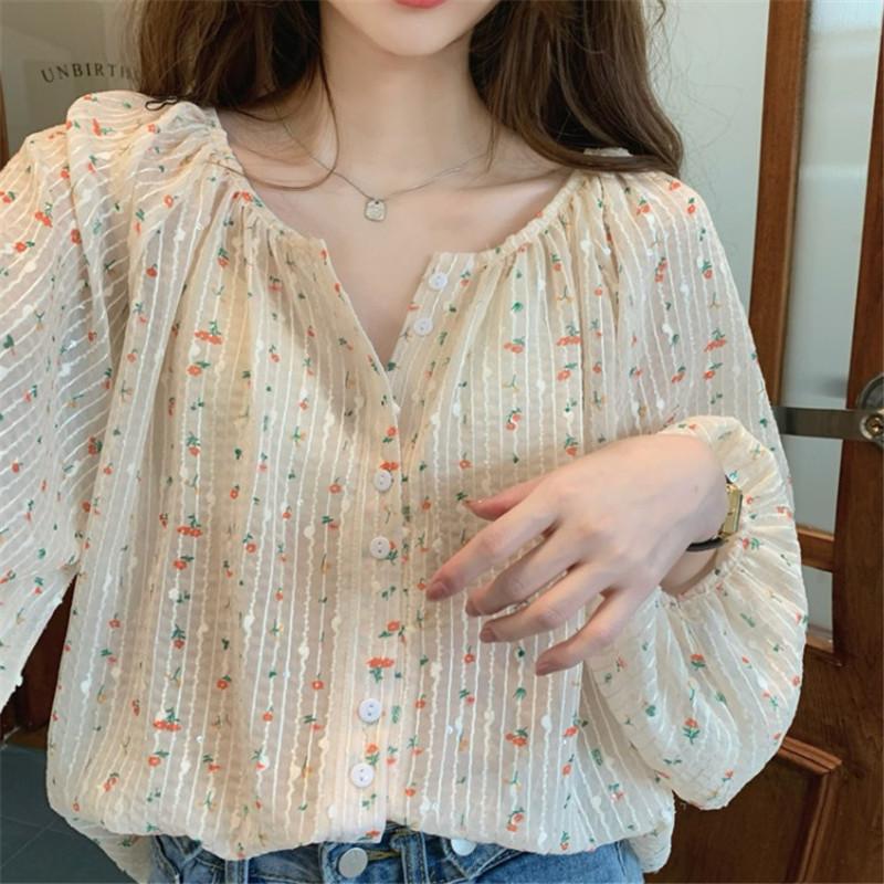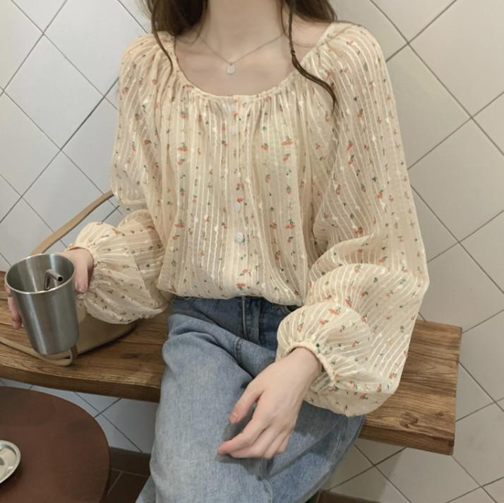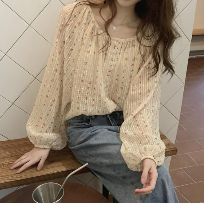 Camisa de gasa floral fresca de principios de primavera y otoño para mujer, diseño elegante y nicho, estilo Hong Kong, top de manga larga fino para verano