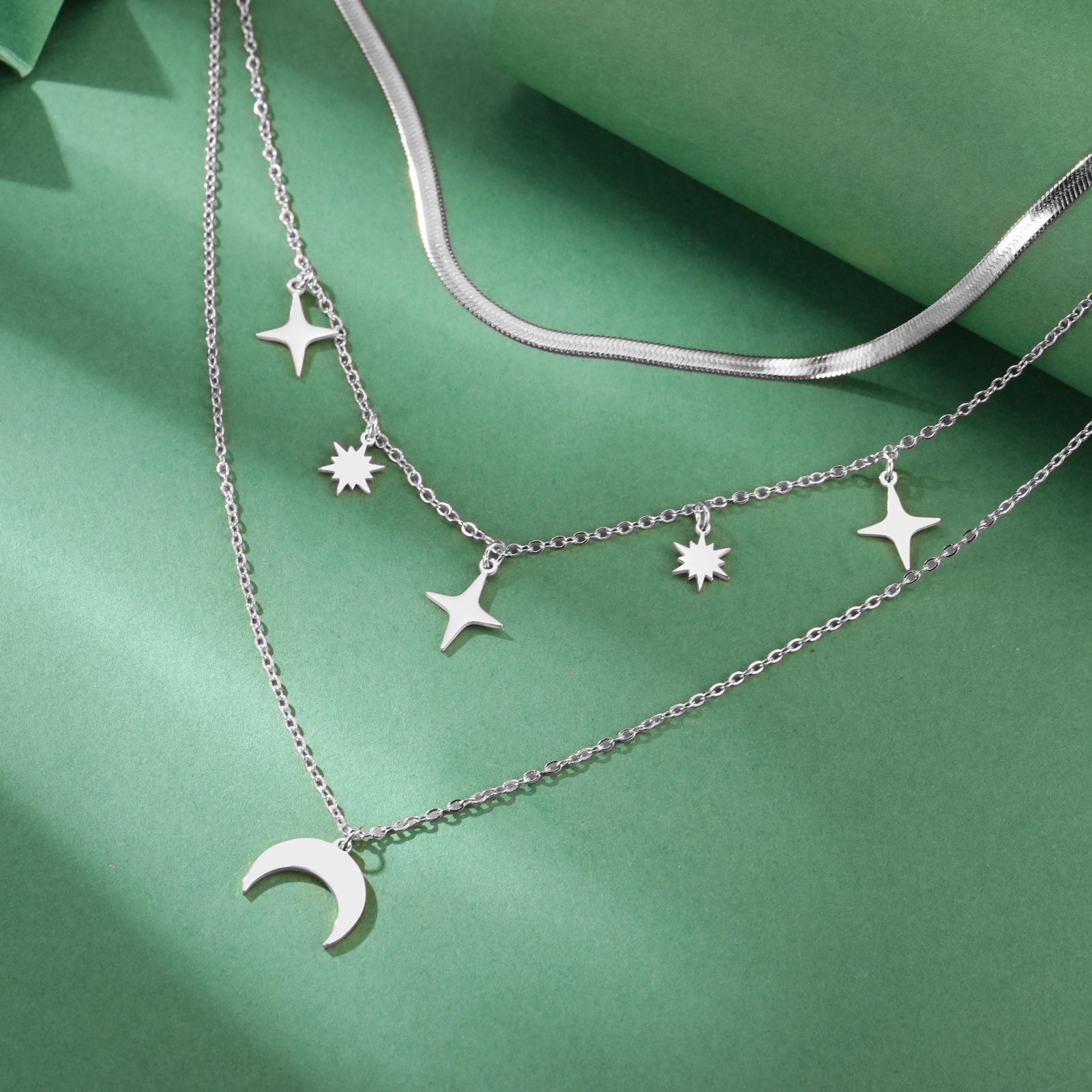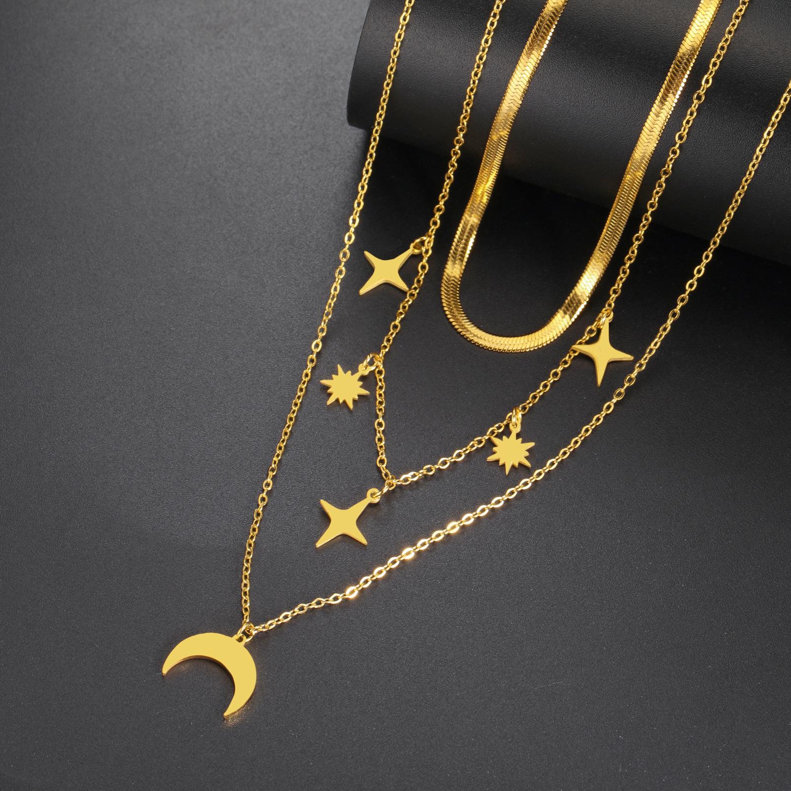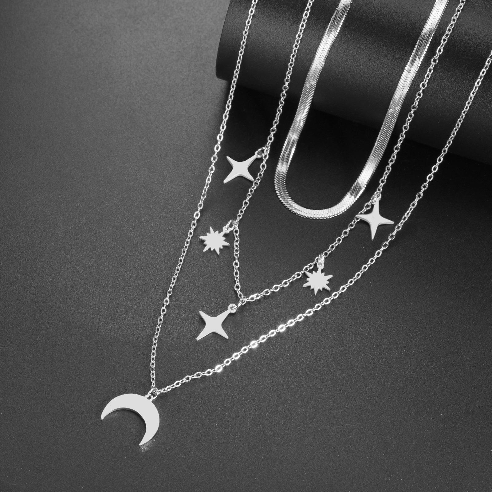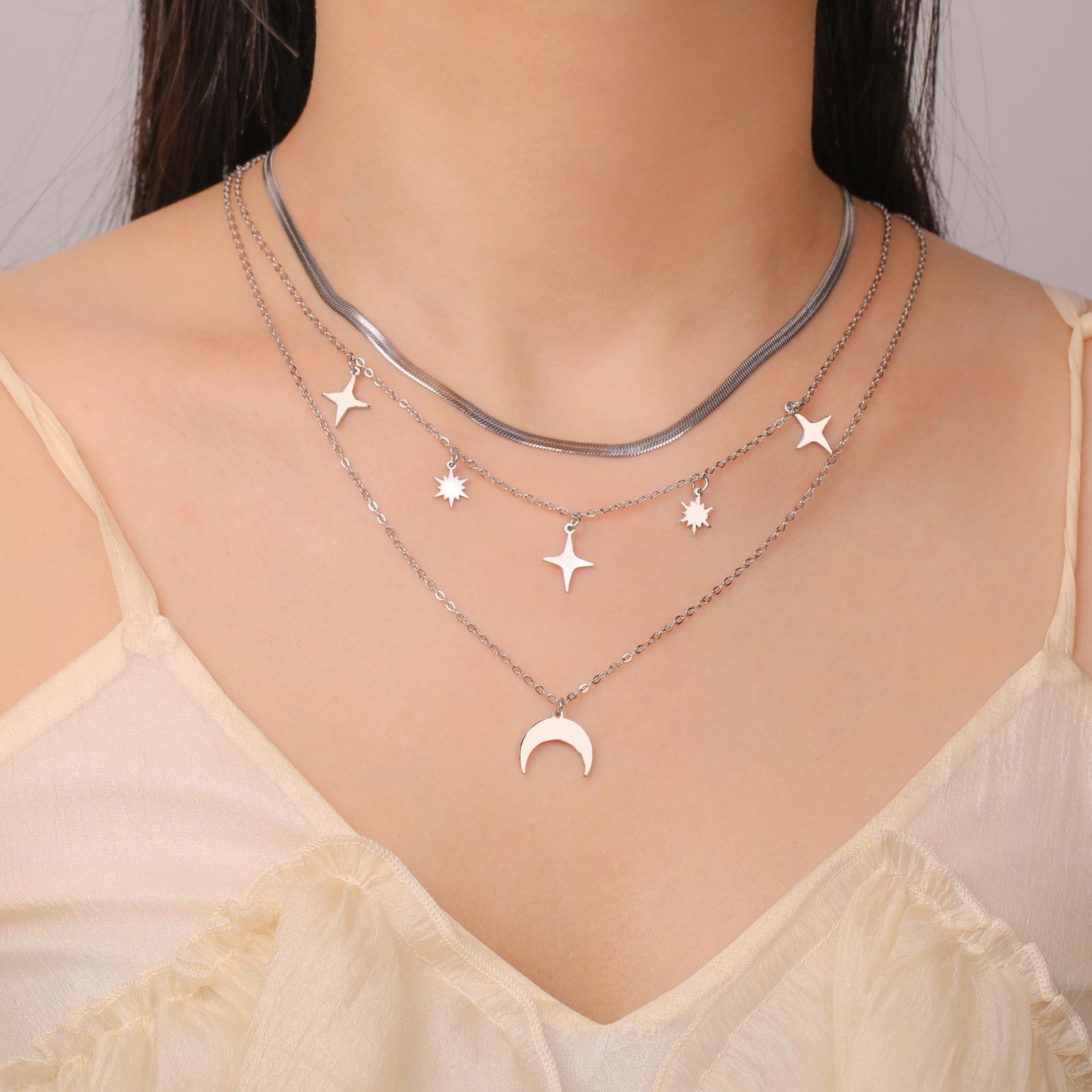 Exquisito Colgante con Patrón de Explosión de Estrella de Cuatro Hombres Combinación de Menisco Uso Apilado de Tres Capas Joyería de Temperamento para Damas Collar de Acero Inoxidable