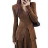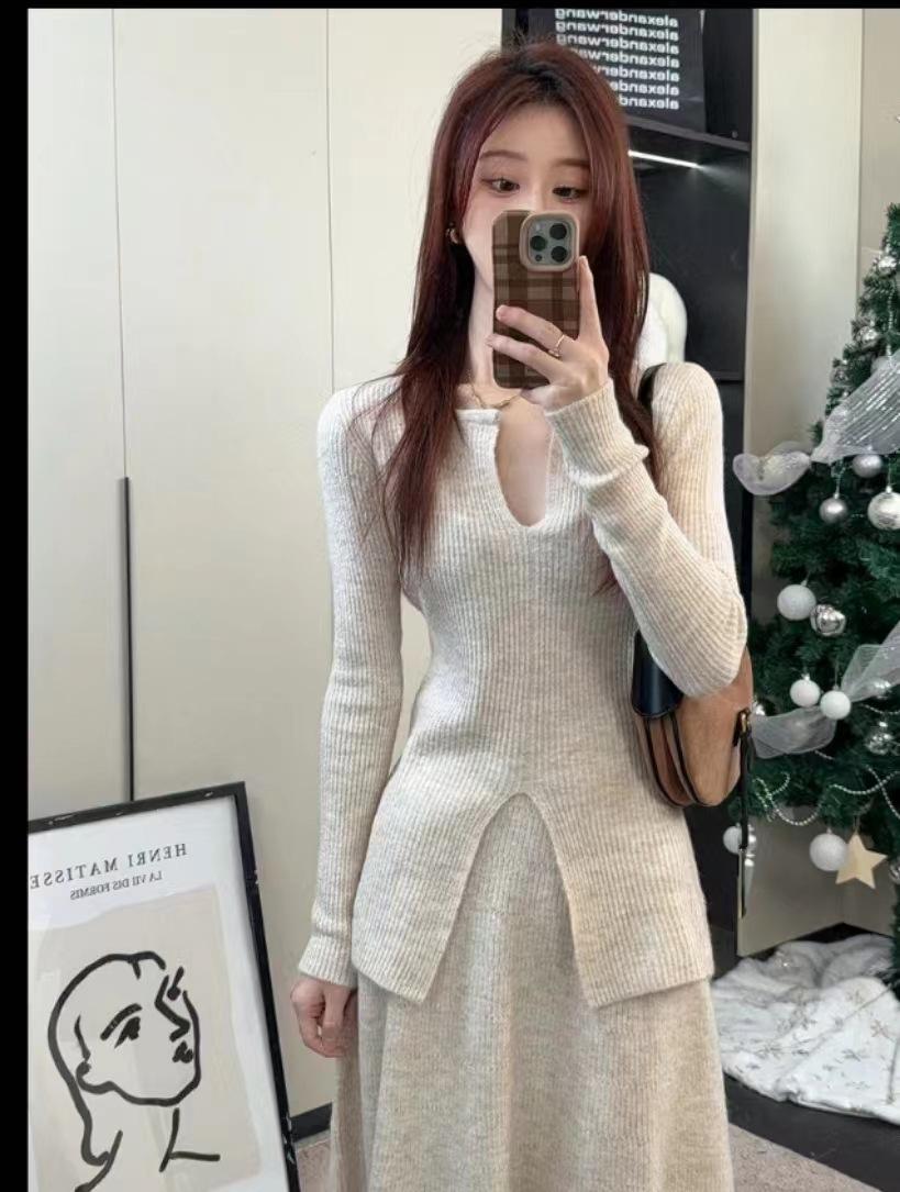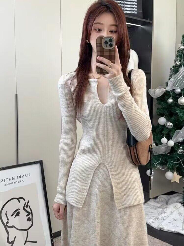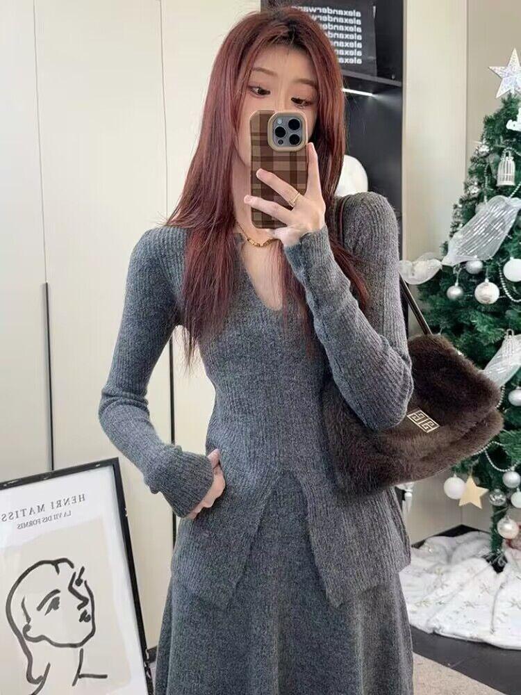 Traje informal de estilo perezoso para mujer, nuevo diseño de primavera, suéter de manga larga con cuello en V y falda ajustada, conjunto de dos piezas