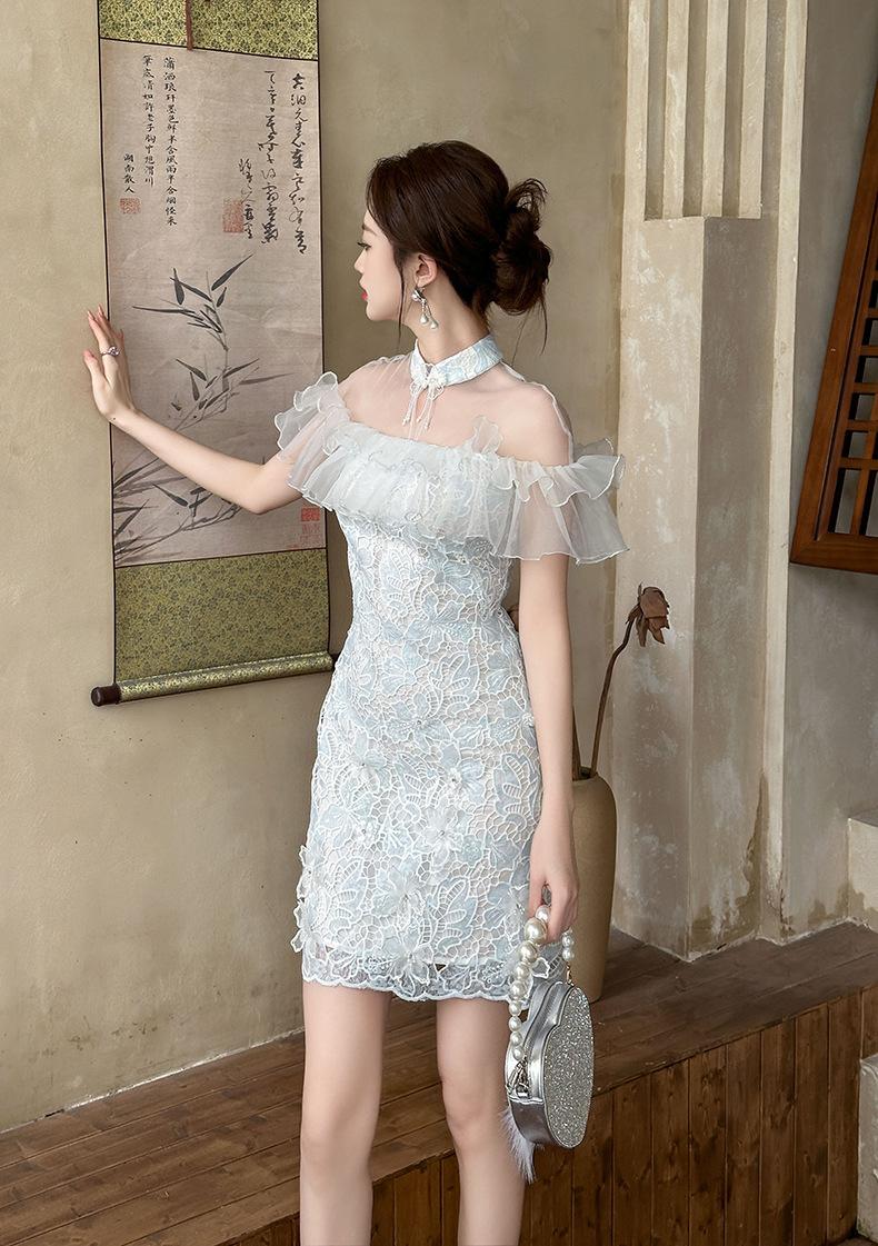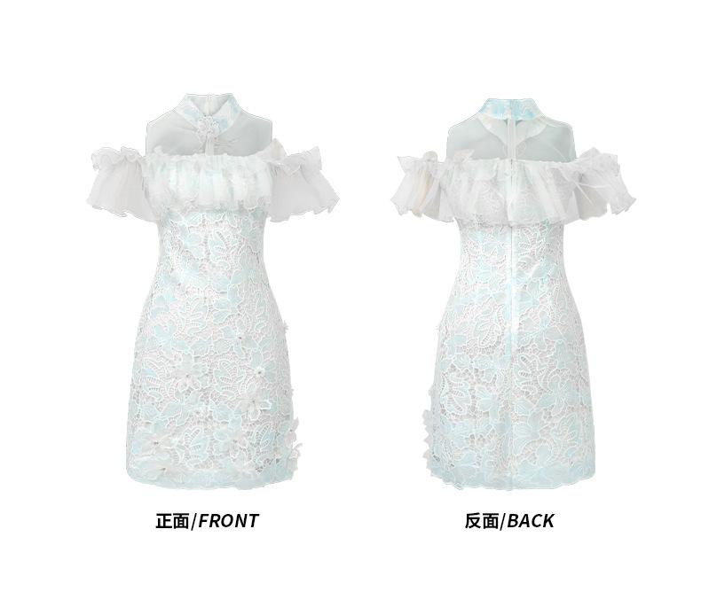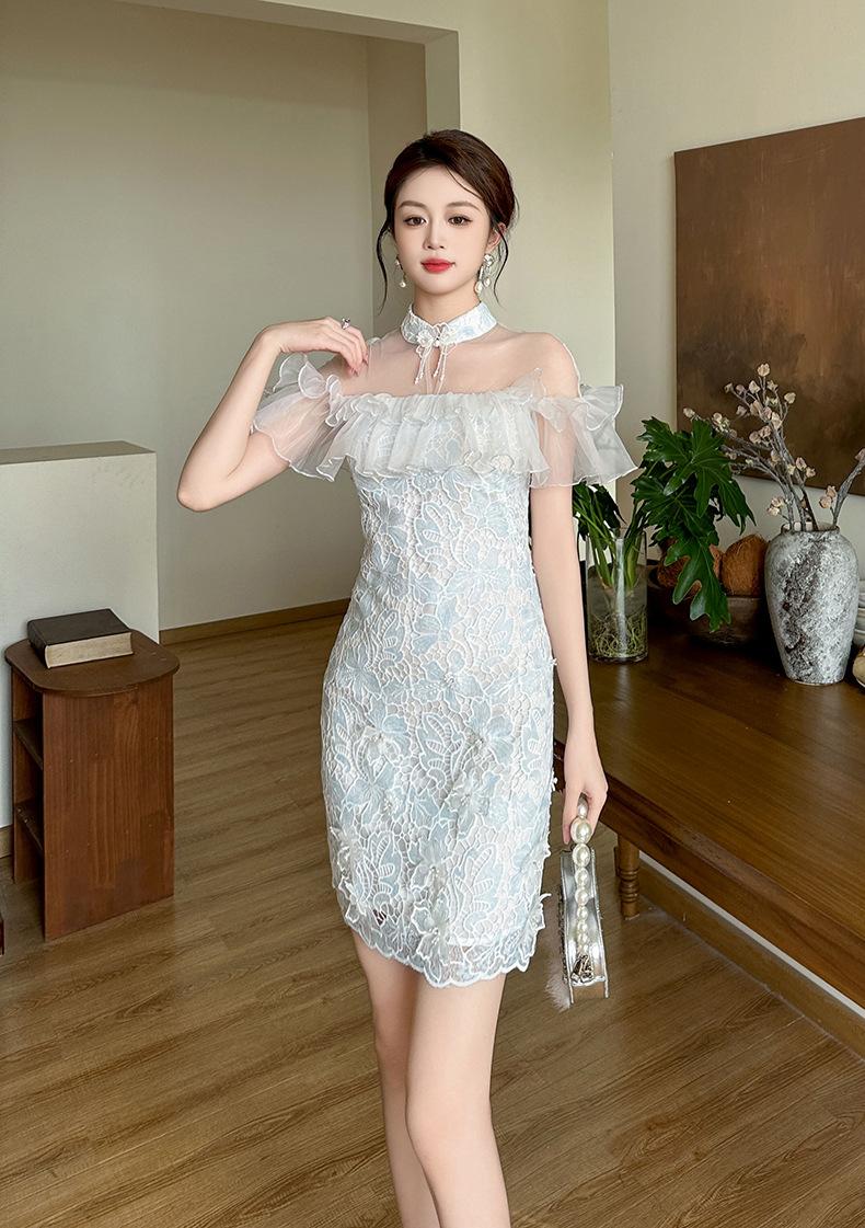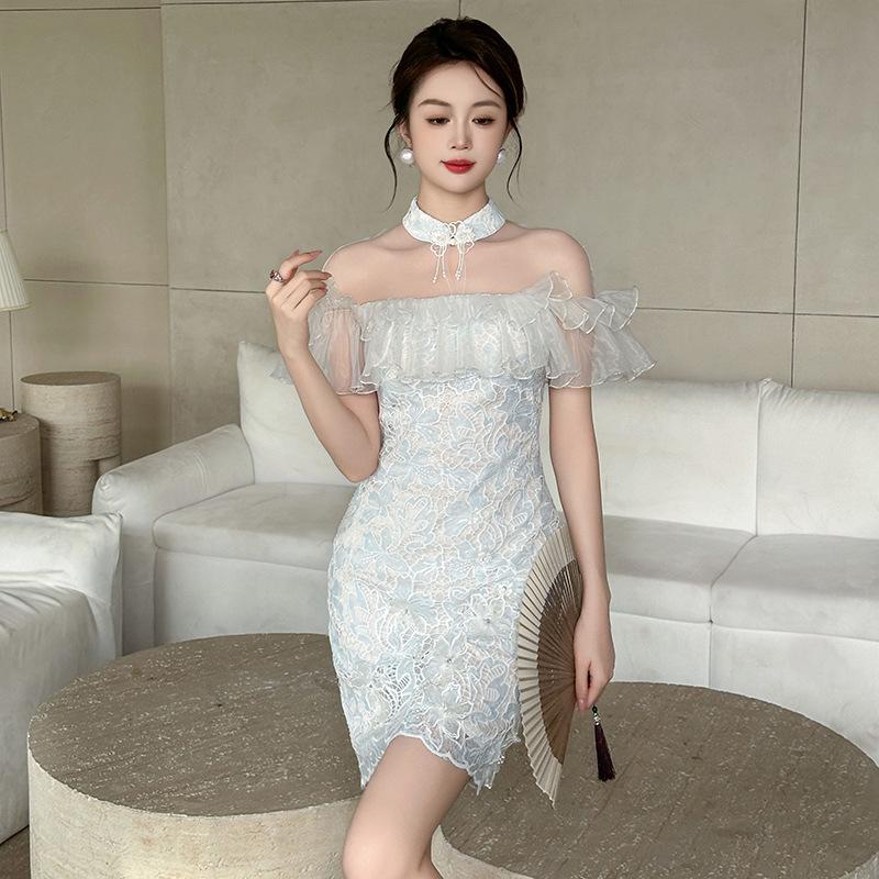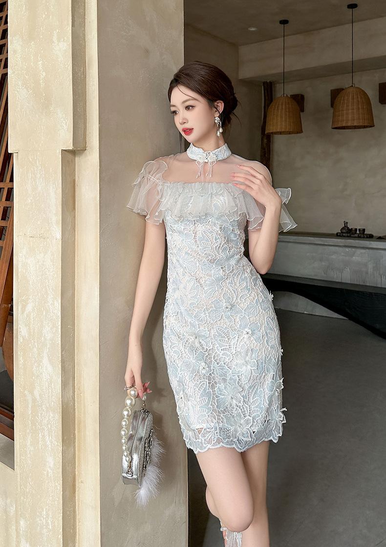 2025 Nueva Ropa de Verano para Mujer Nuevo Cheongsam Chinoiserie Mejorado Vestido de Encaje con Cintura con Volantes para Niña 2157