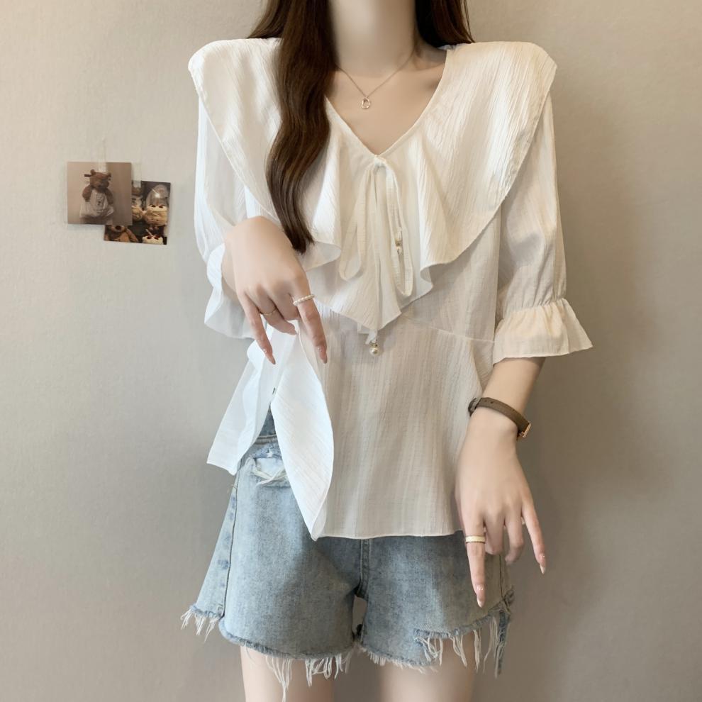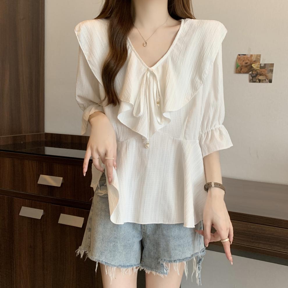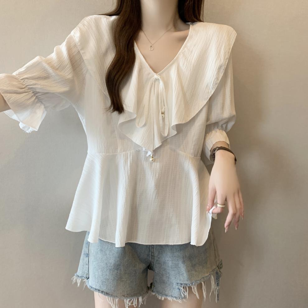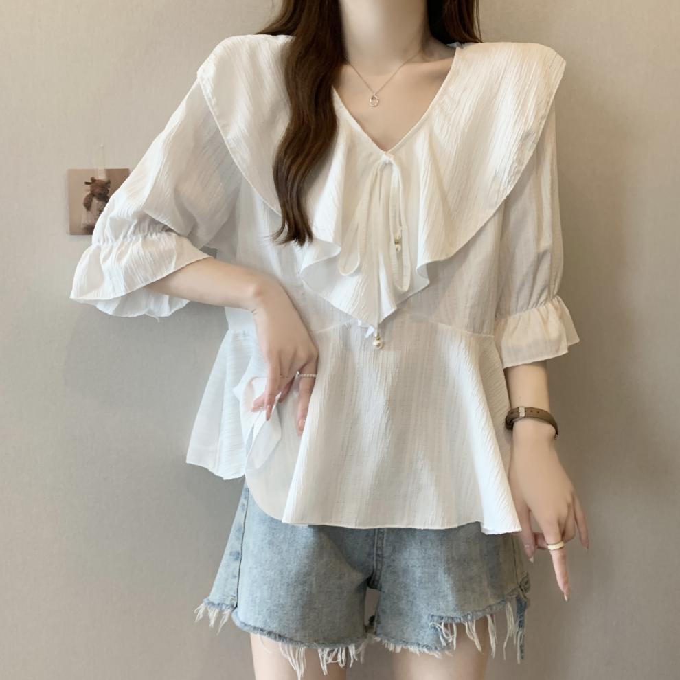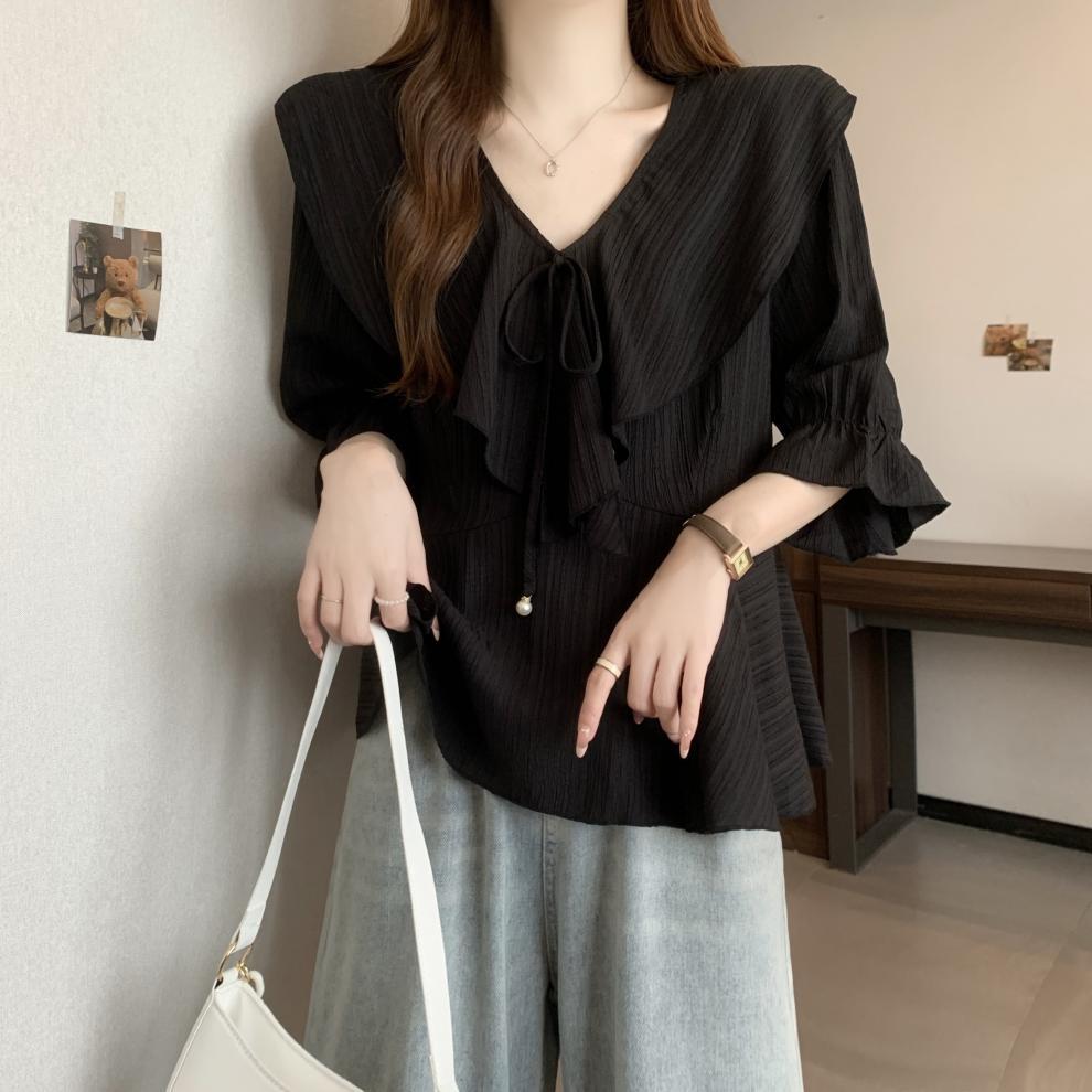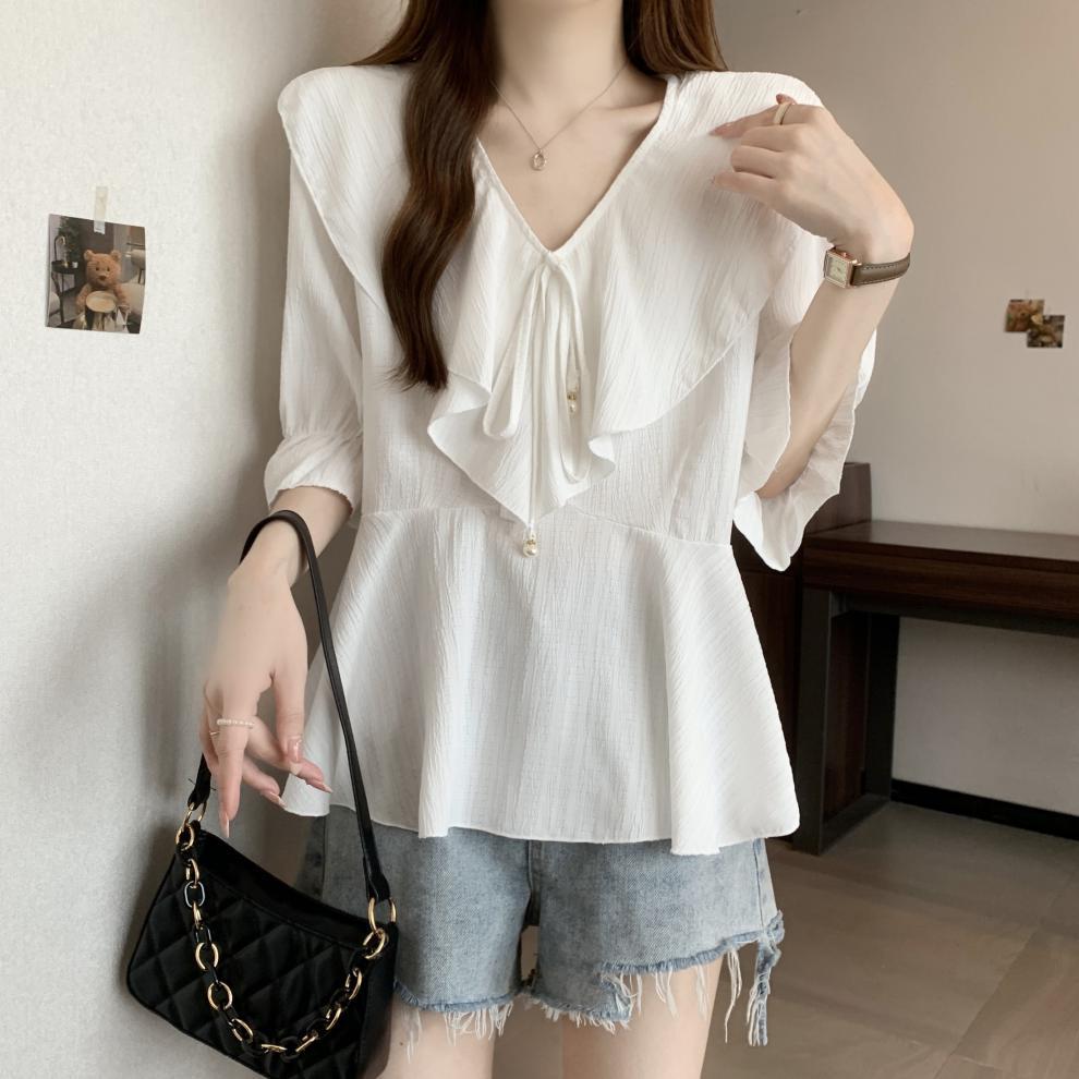 Novedad de verano 2024, ropa de mujer de talla grande, blusa de gasa con cuello en V y mangas abullonadas, blusa holgada adelgazante que cubre el vientre
