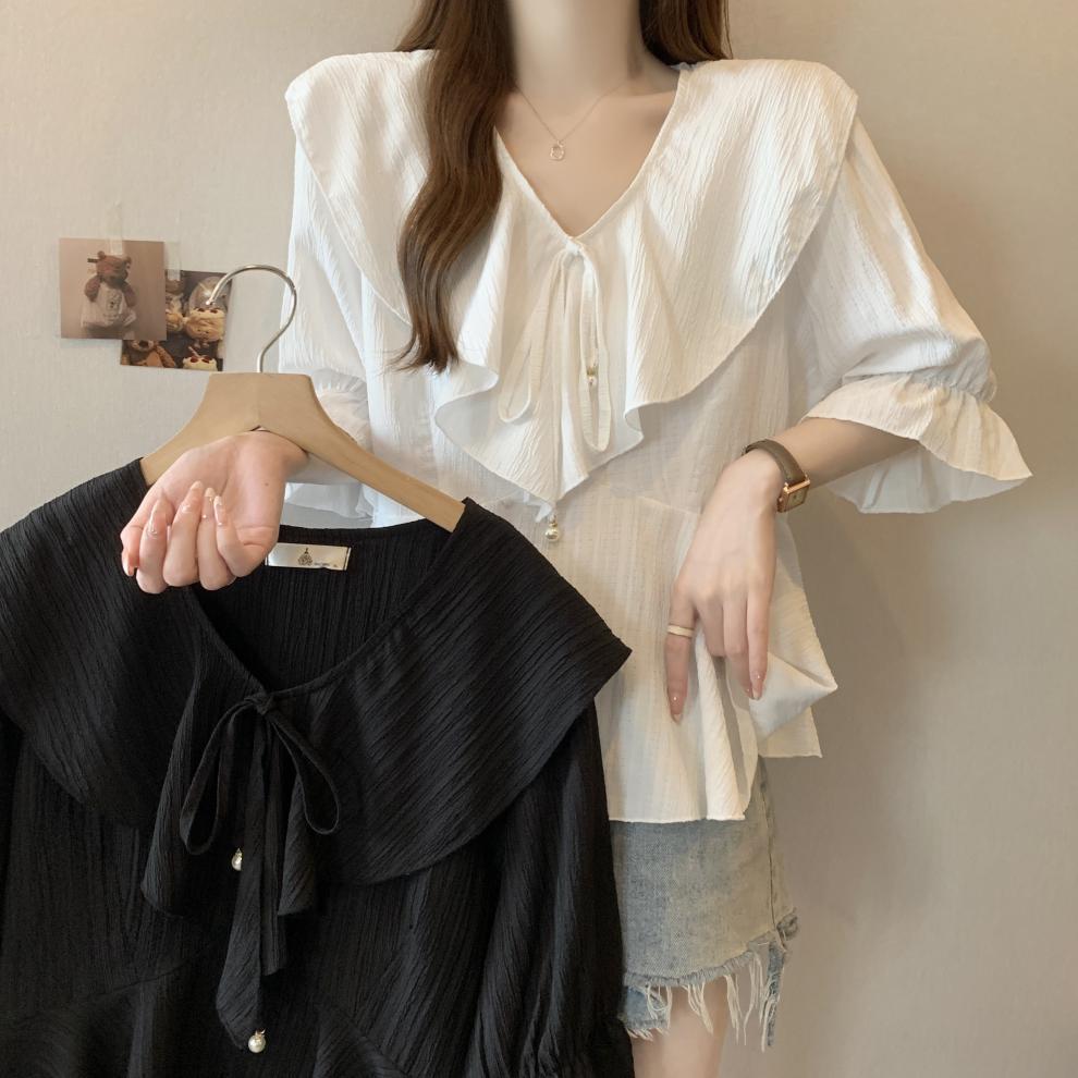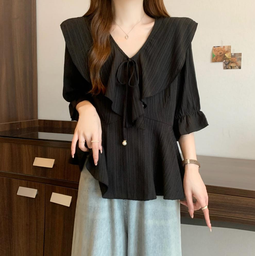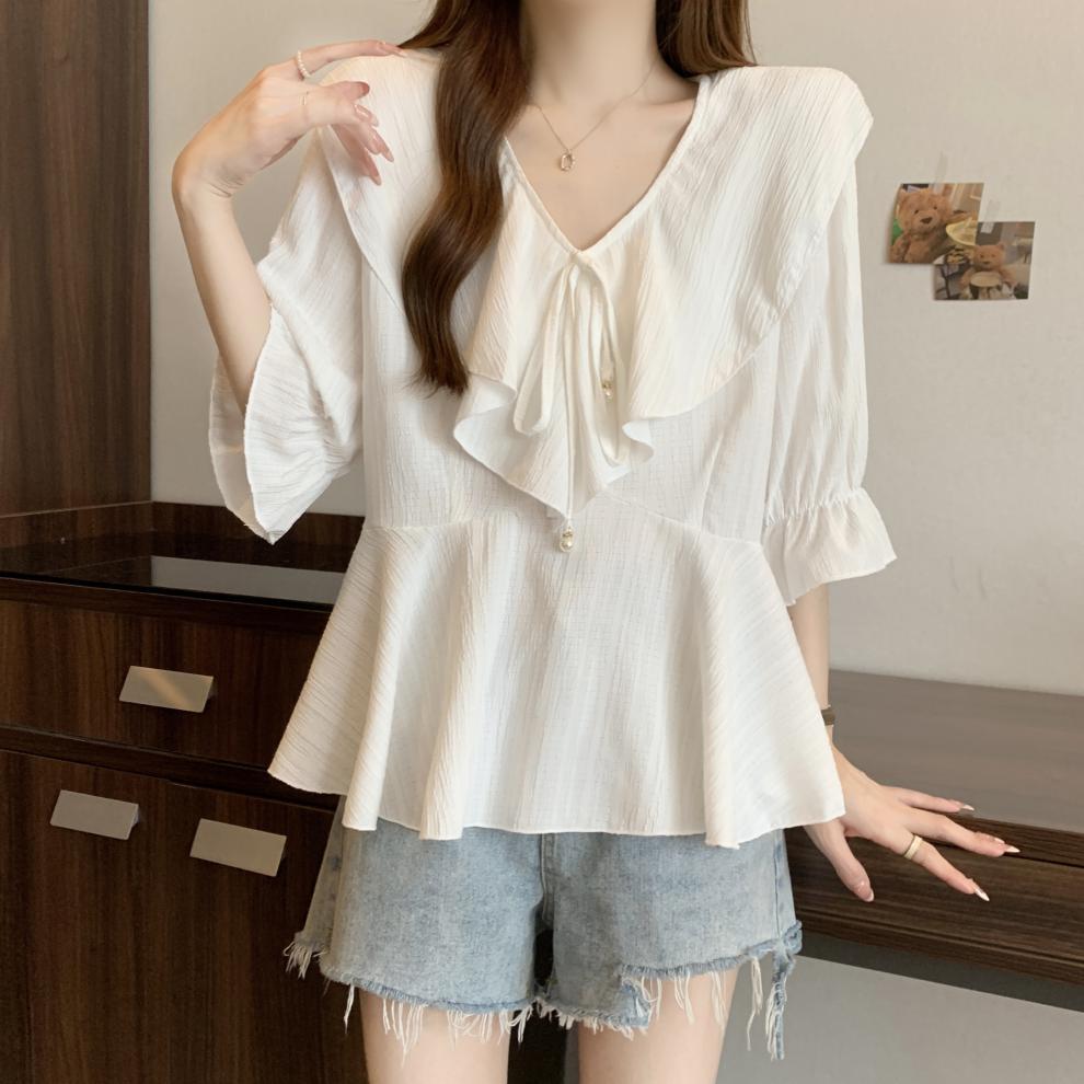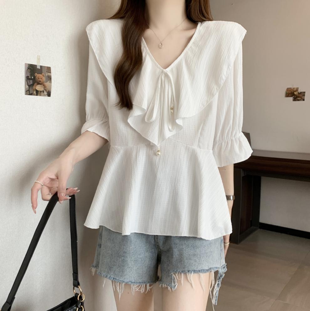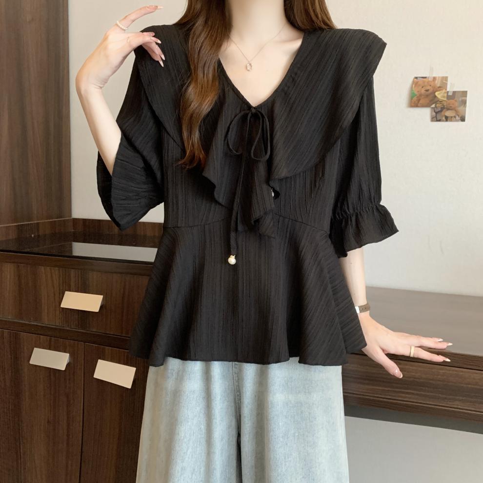 Novedad de verano 2024, ropa de mujer de talla grande, blusa de gasa con cuello en V y mangas abullonadas, blusa holgada adelgazante que cubre el vientre