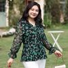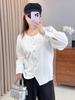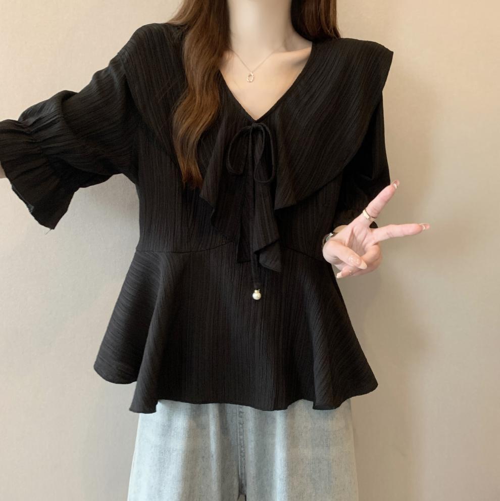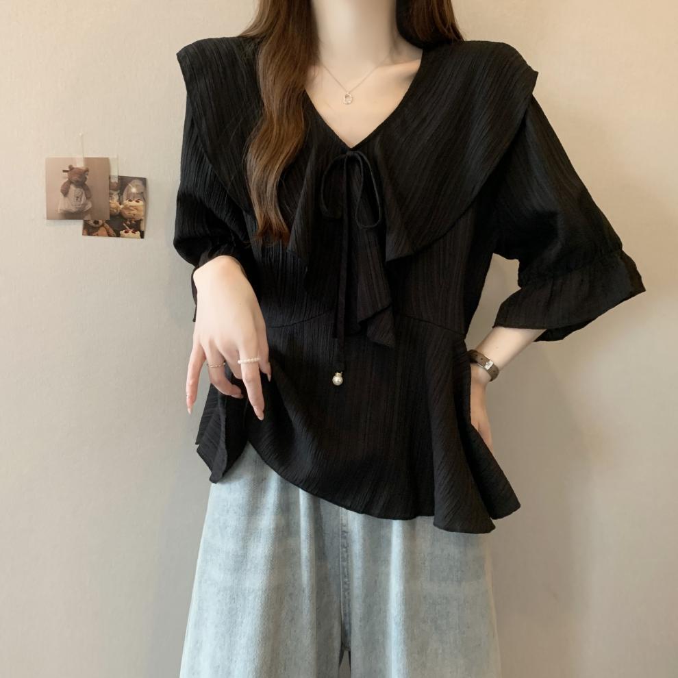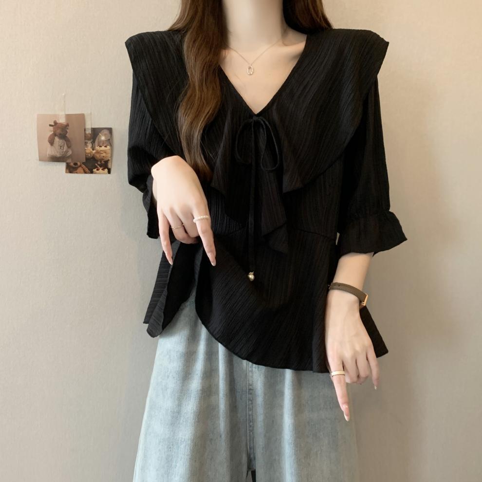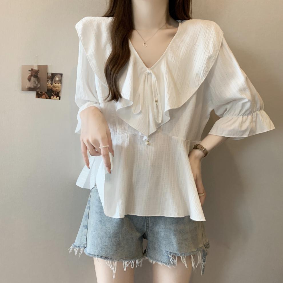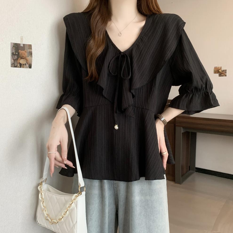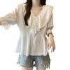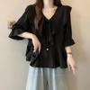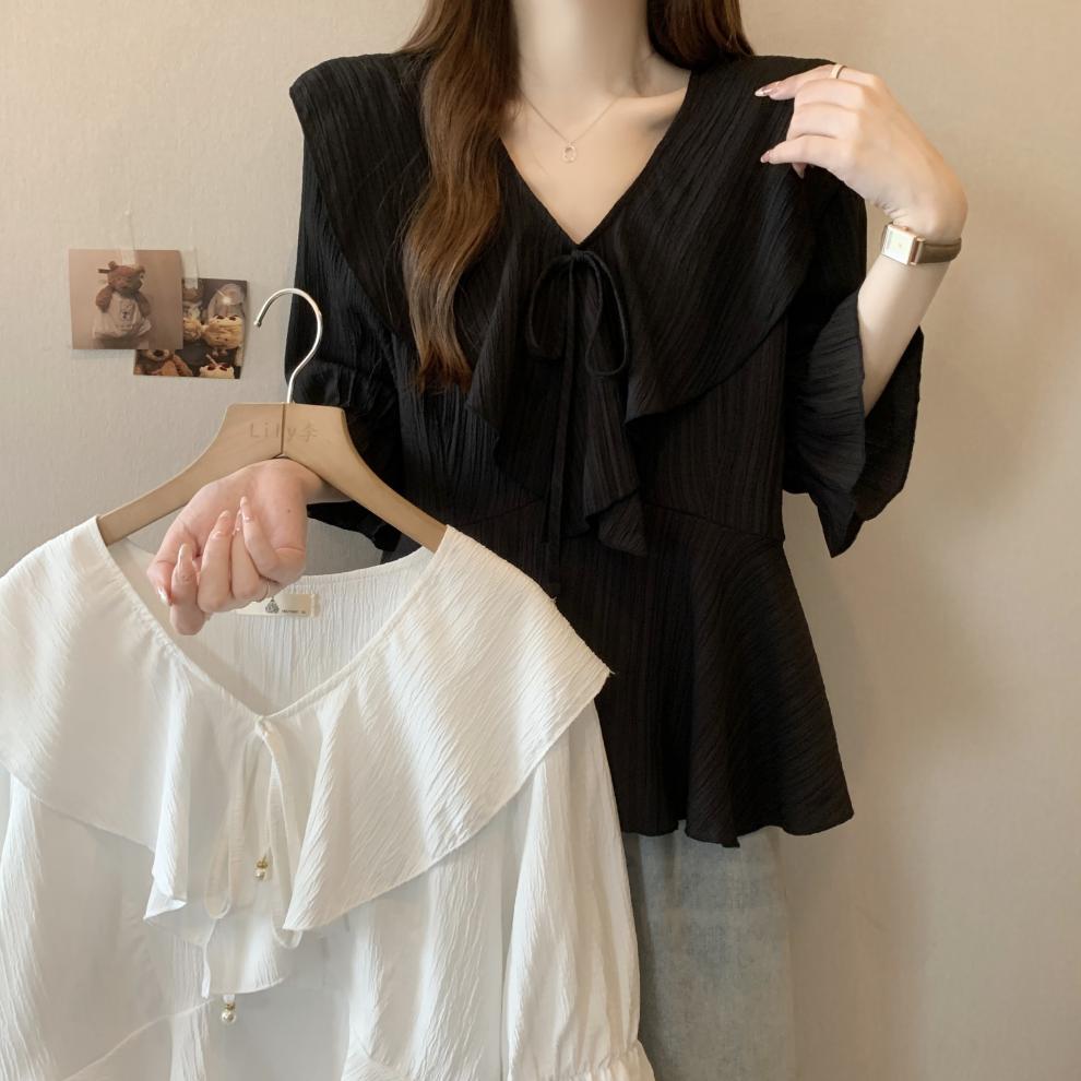 Novedad de verano 2024, ropa de mujer de talla grande, blusa de gasa con cuello en V y mangas abullonadas, blusa holgada adelgazante que cubre el vientre