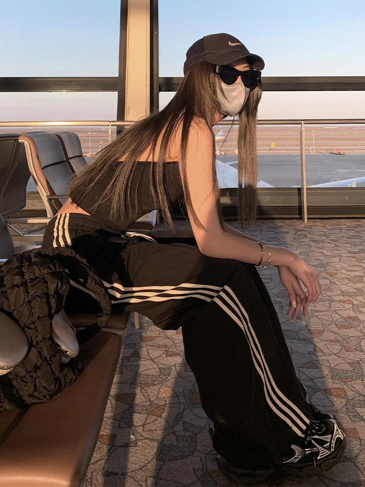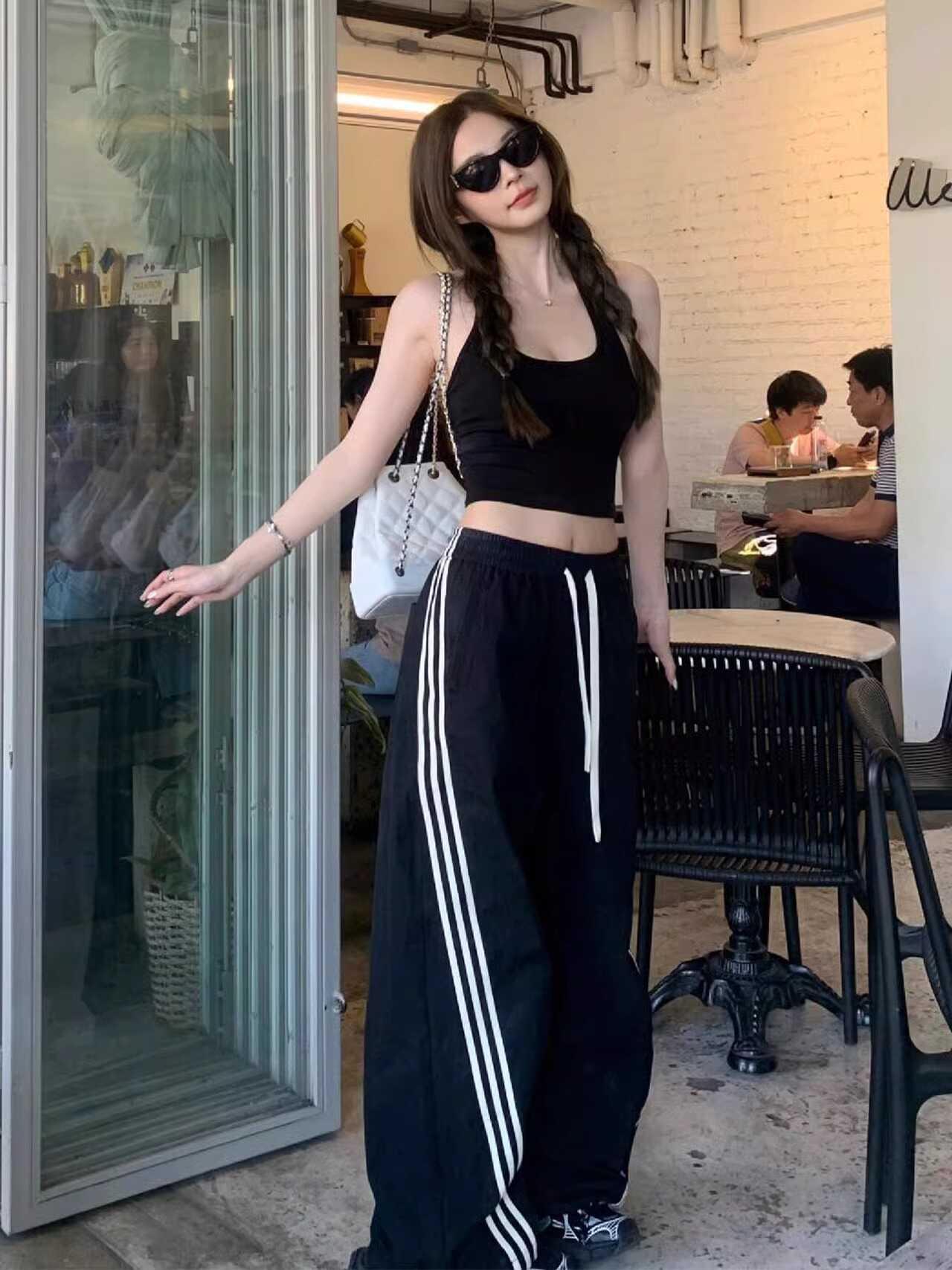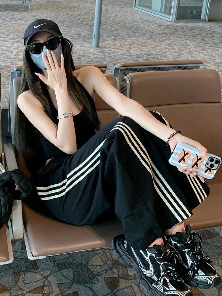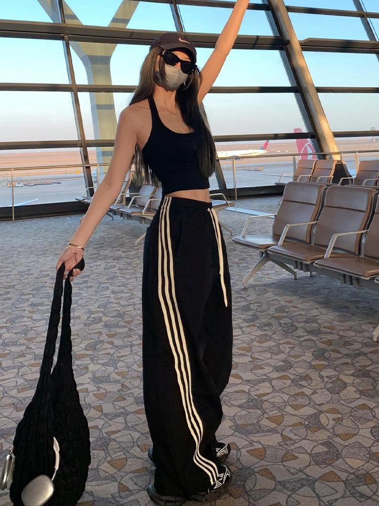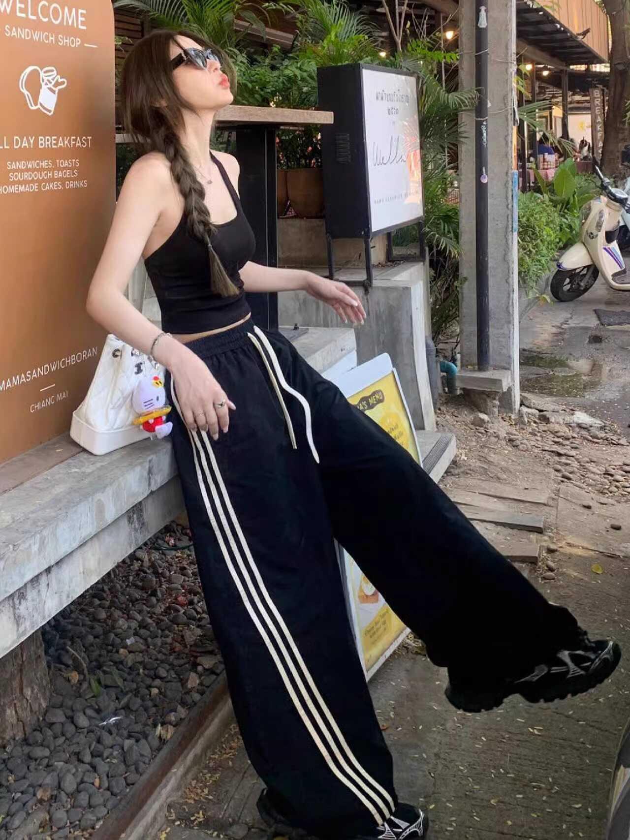 Pantalones deportivos de tres barras estilo americano para mujer, de verano, finos, de secado rápido, holgados, de pierna ancha y cintura elástica, informales y drapeados.