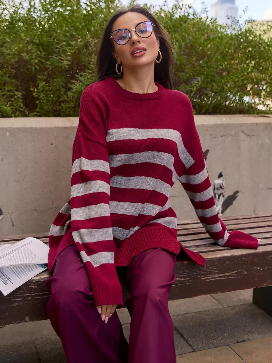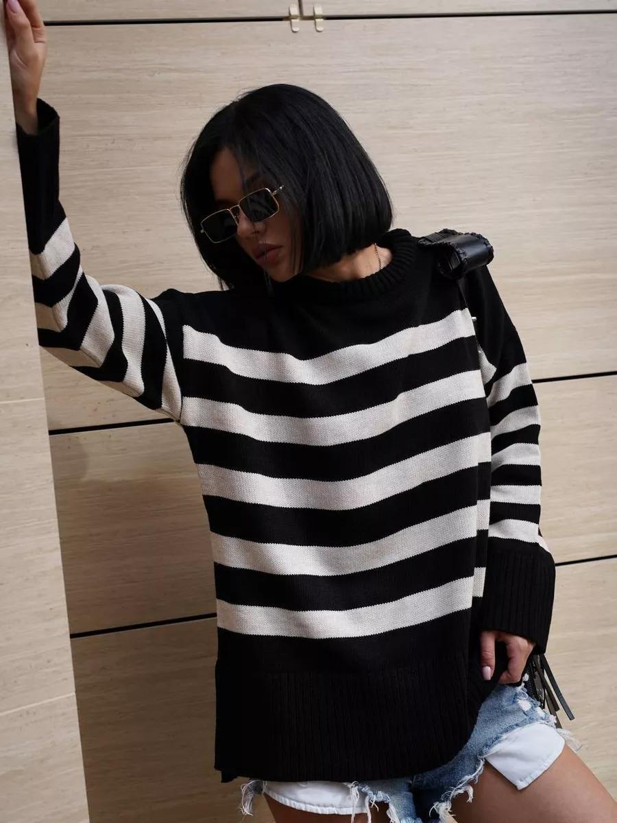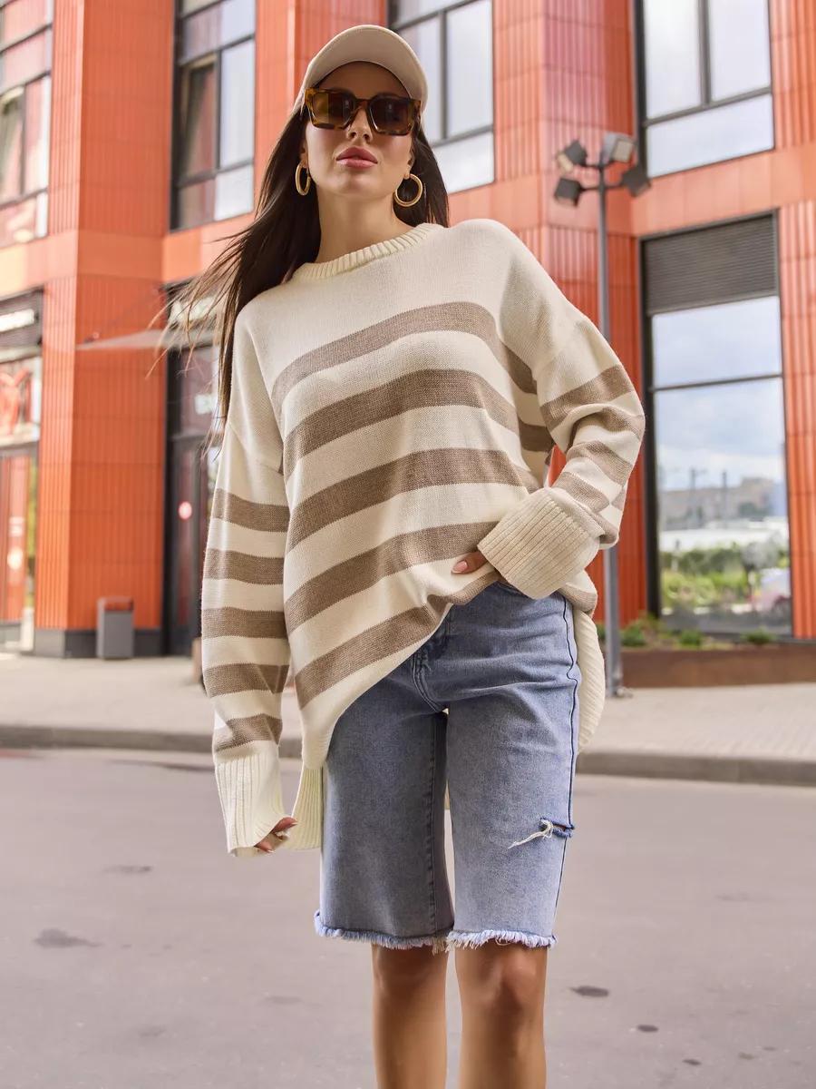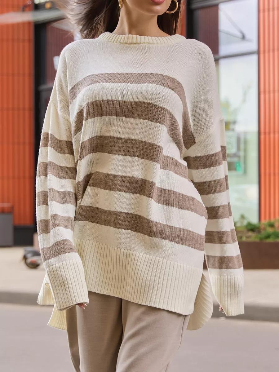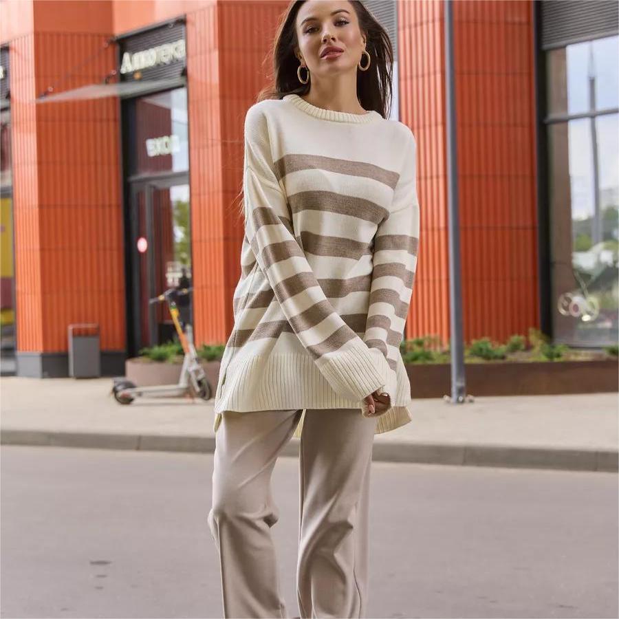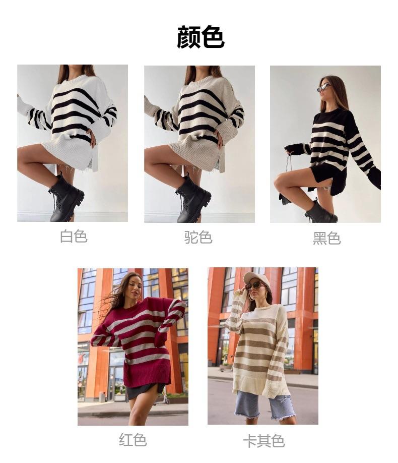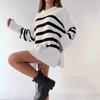 Ropa de Punto para Mujer Otoño e Invierno 2025 Nuevo Europeo y Americano Transfronterizo Casual Rayas Suelto Cuello Redondo Jersey Ropa de Punto Chaqueta para Mujer