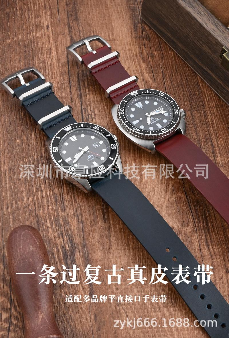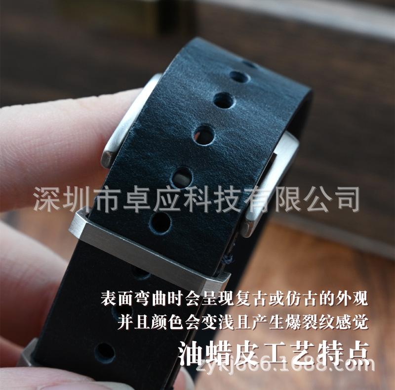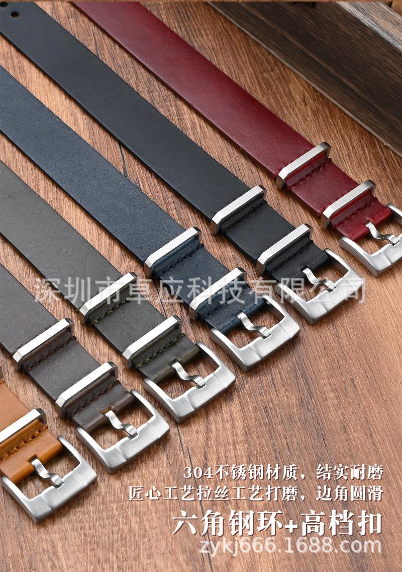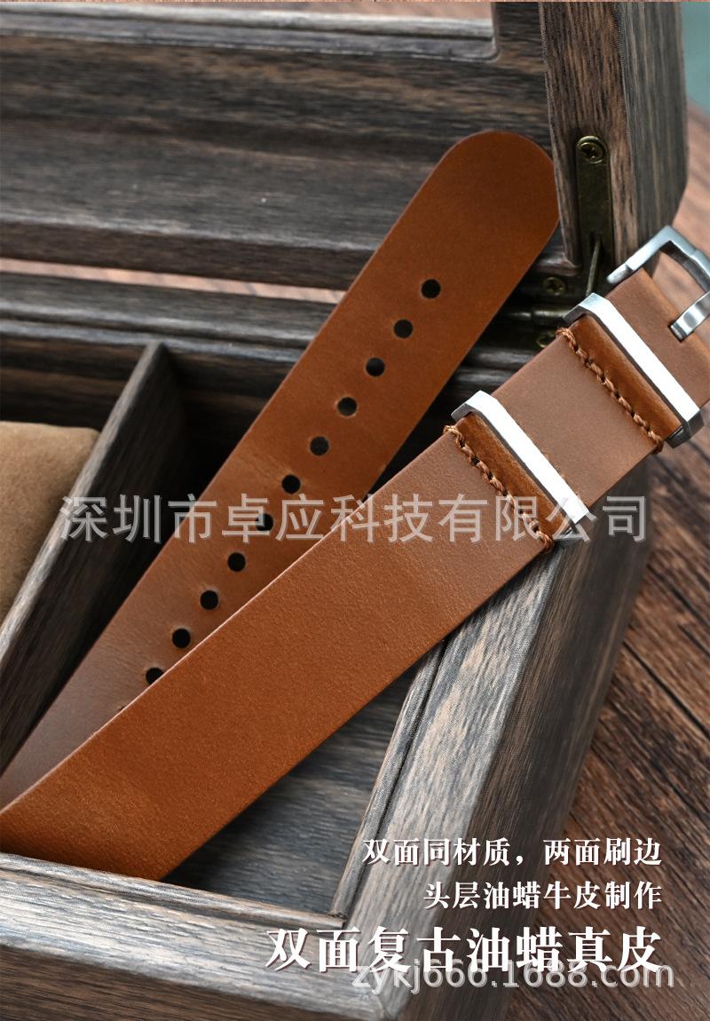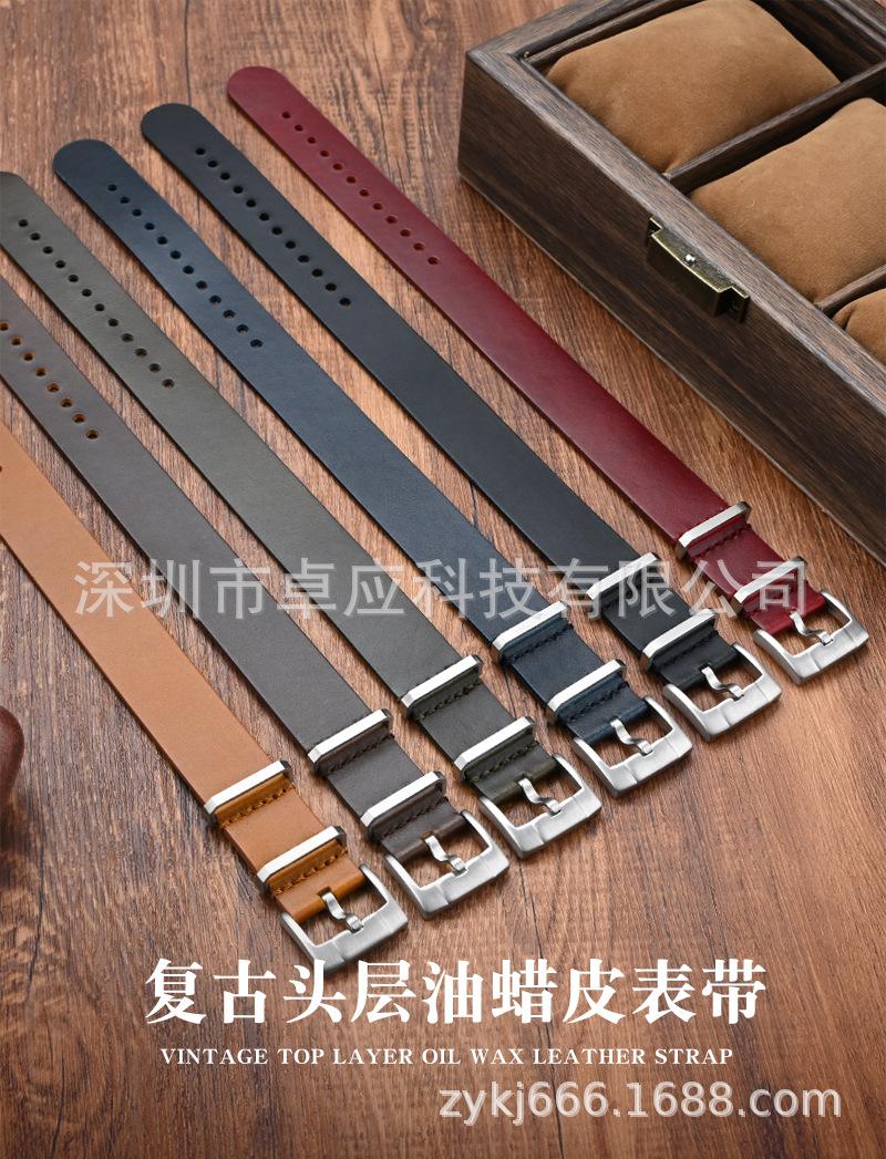 Correa de reloj vintage de alta gama con capa superior de piel de vacuno encerada y anillo hexagonal.