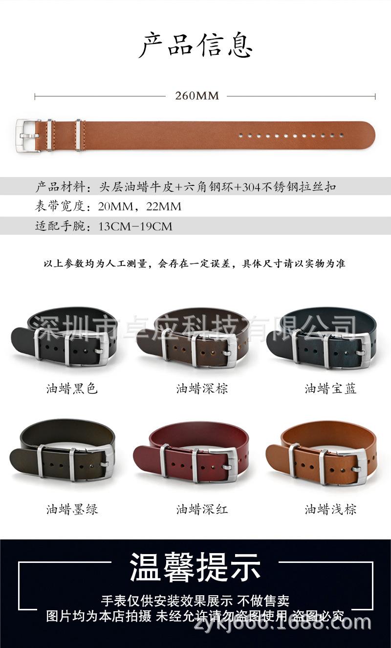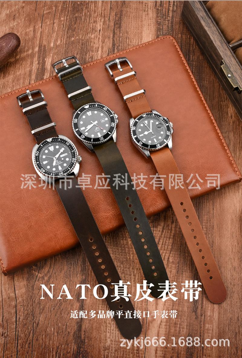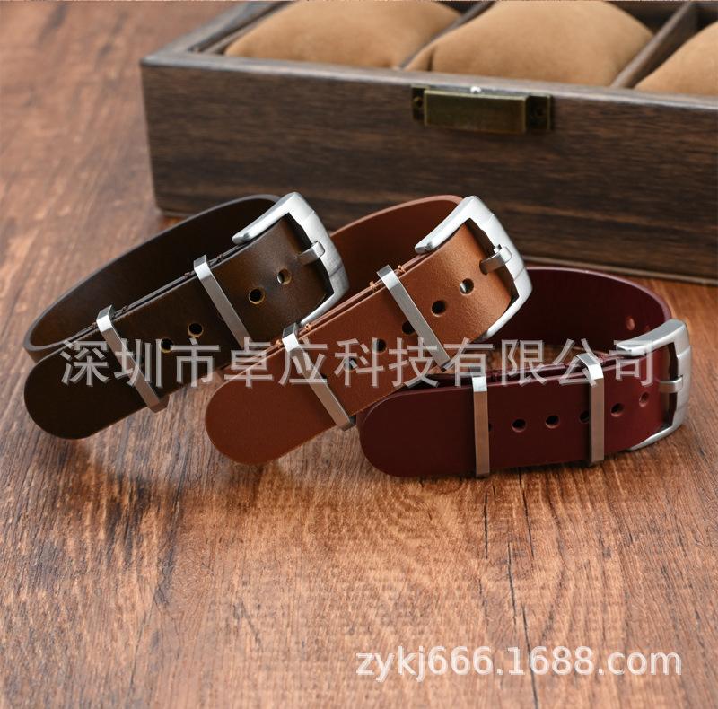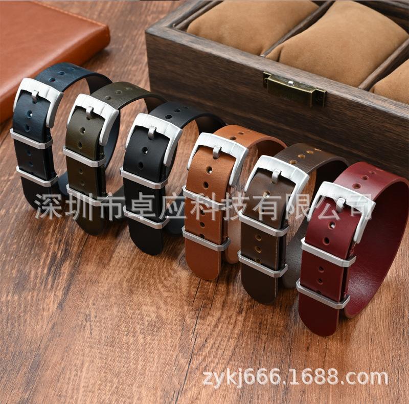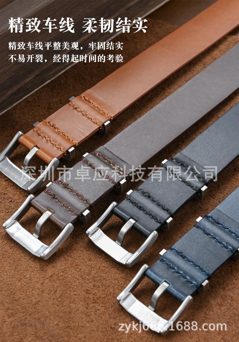 Correa de reloj vintage de alta gama con capa superior de piel de vacuno encerada y anillo hexagonal.