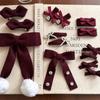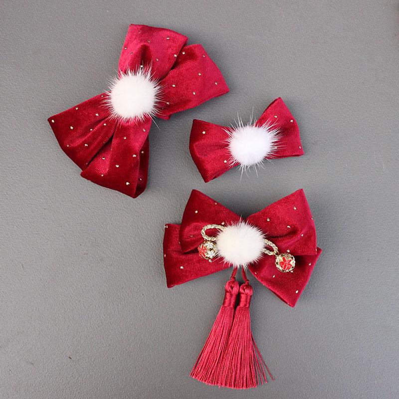 Wine red velvet double bow hairpin, Wine red velvet bow fur ball tassel hair clip, Wine red velvet single-layer bow hairpin