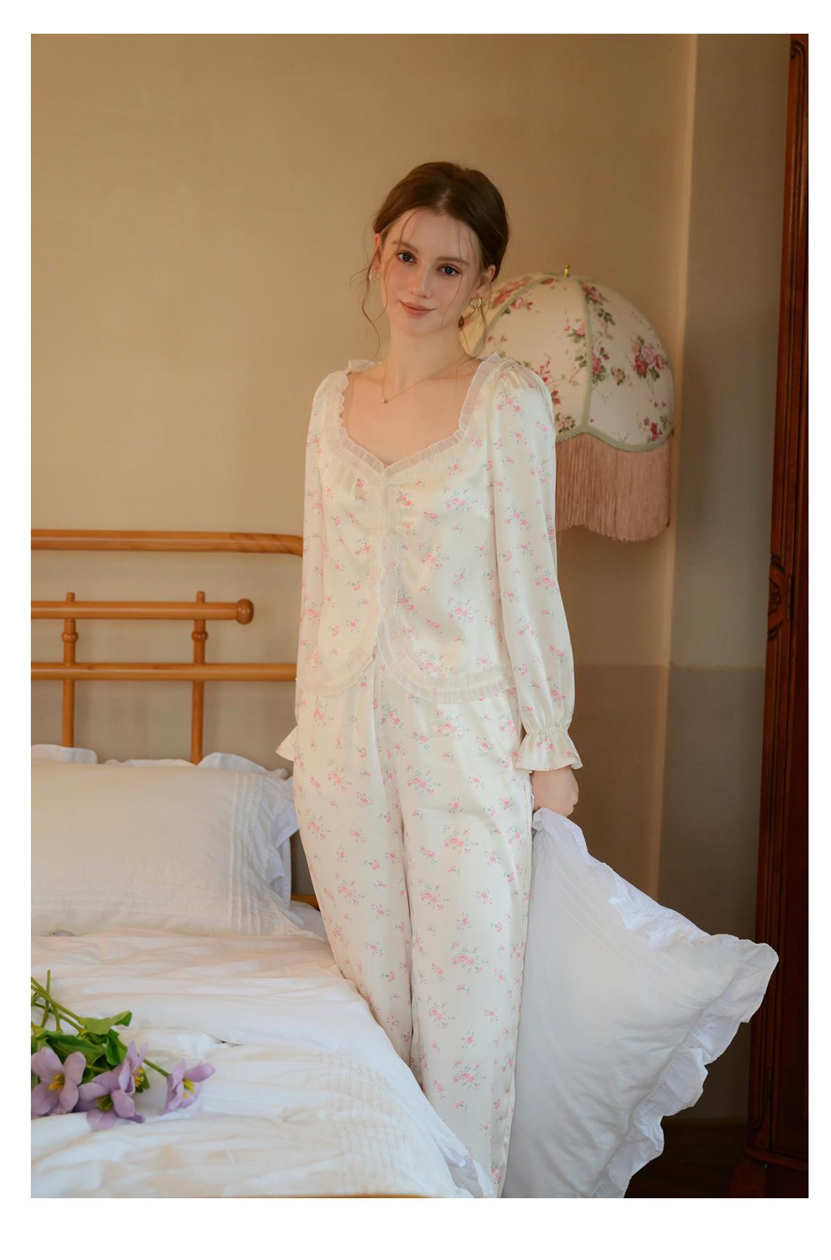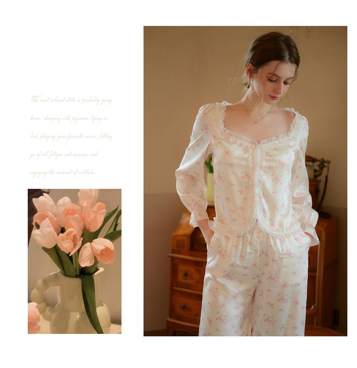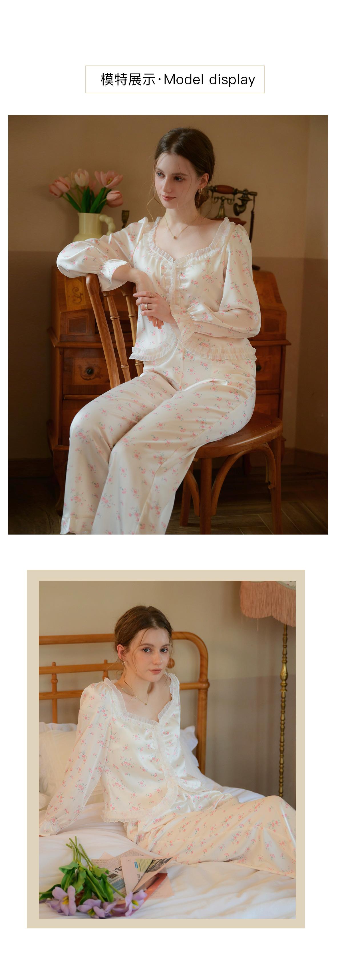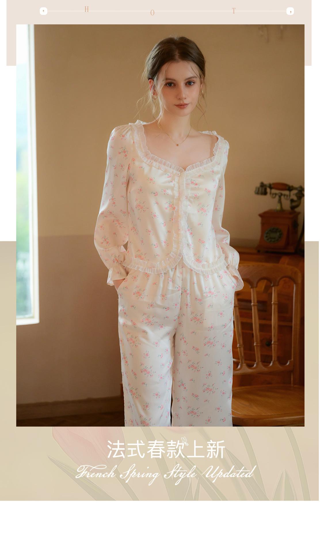 Conjunto de Pijama Francés para Mujer Primavera 2024 Nuevo Satén Estampado Pantalón de Manga Larga Ropa de Casa de Alta Gama Se Puede Usar Afuera