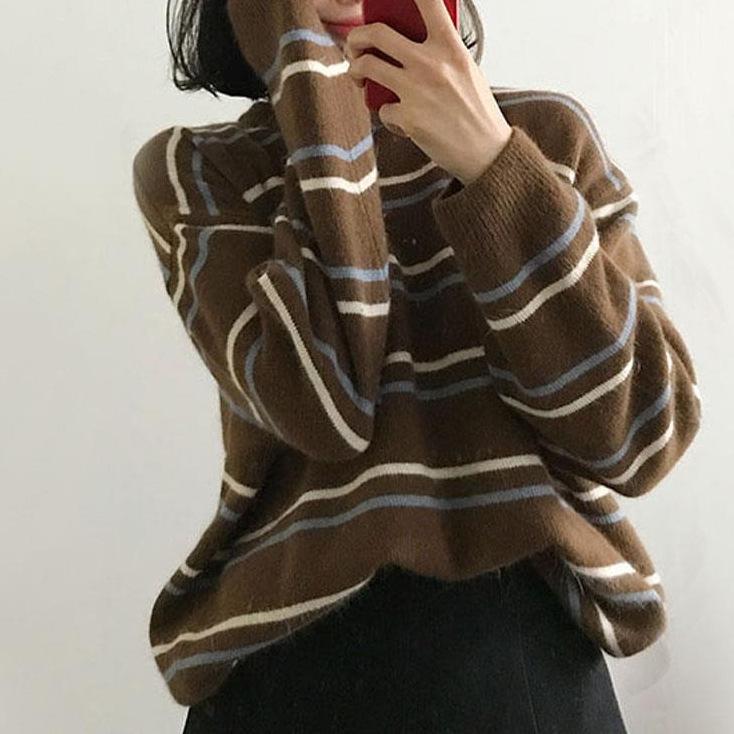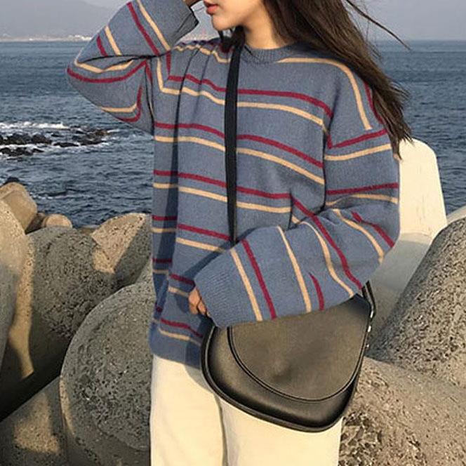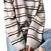 Otoño e Invierno Nuevo Tejido de Punto de Cuello Redondo para Mujer Coreano Suéter Chic para Mujer Tejido de Punto a Rayas Holgado Perezoso Estudiante Ropa Exterior