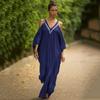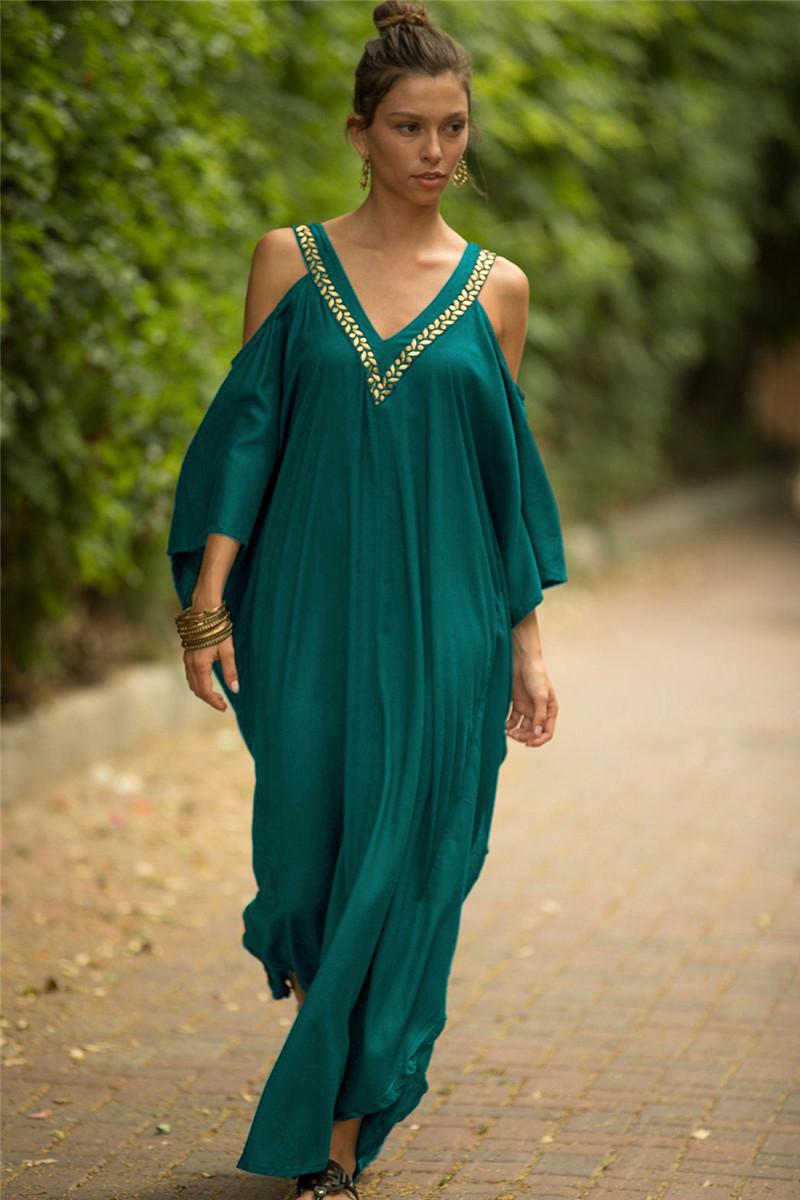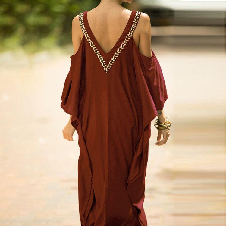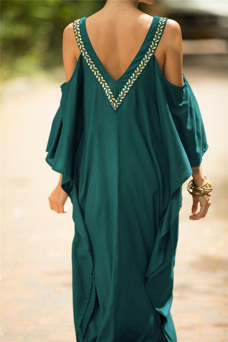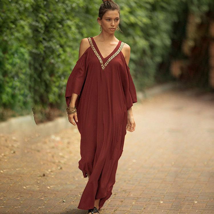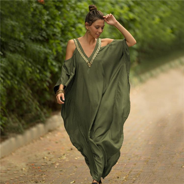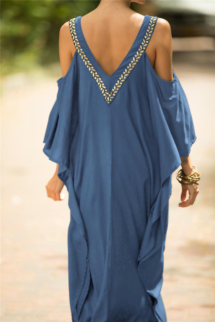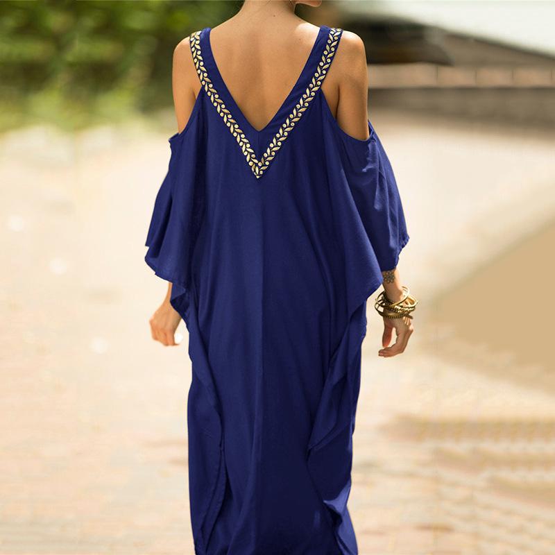 Explosiones Transfronterizas Europeas y Americanas Imitación Algodón Cuello en V Bordado Blusa de Playa Sexy Hombro Descubierto Suelta Protector Solar Vestido Camisero 6 Colores