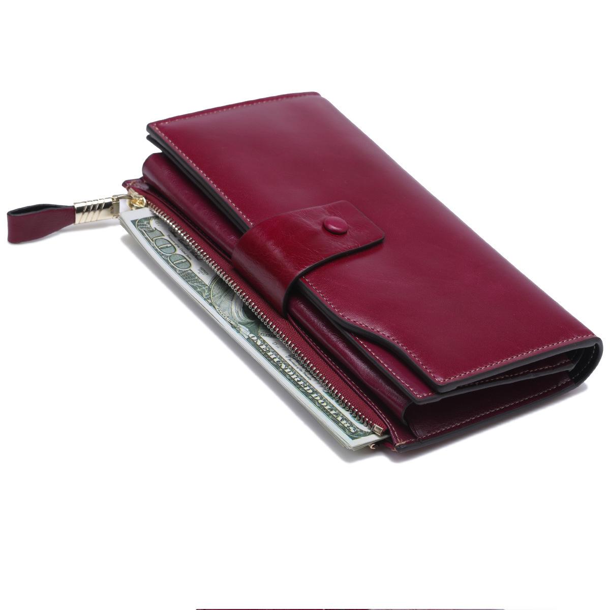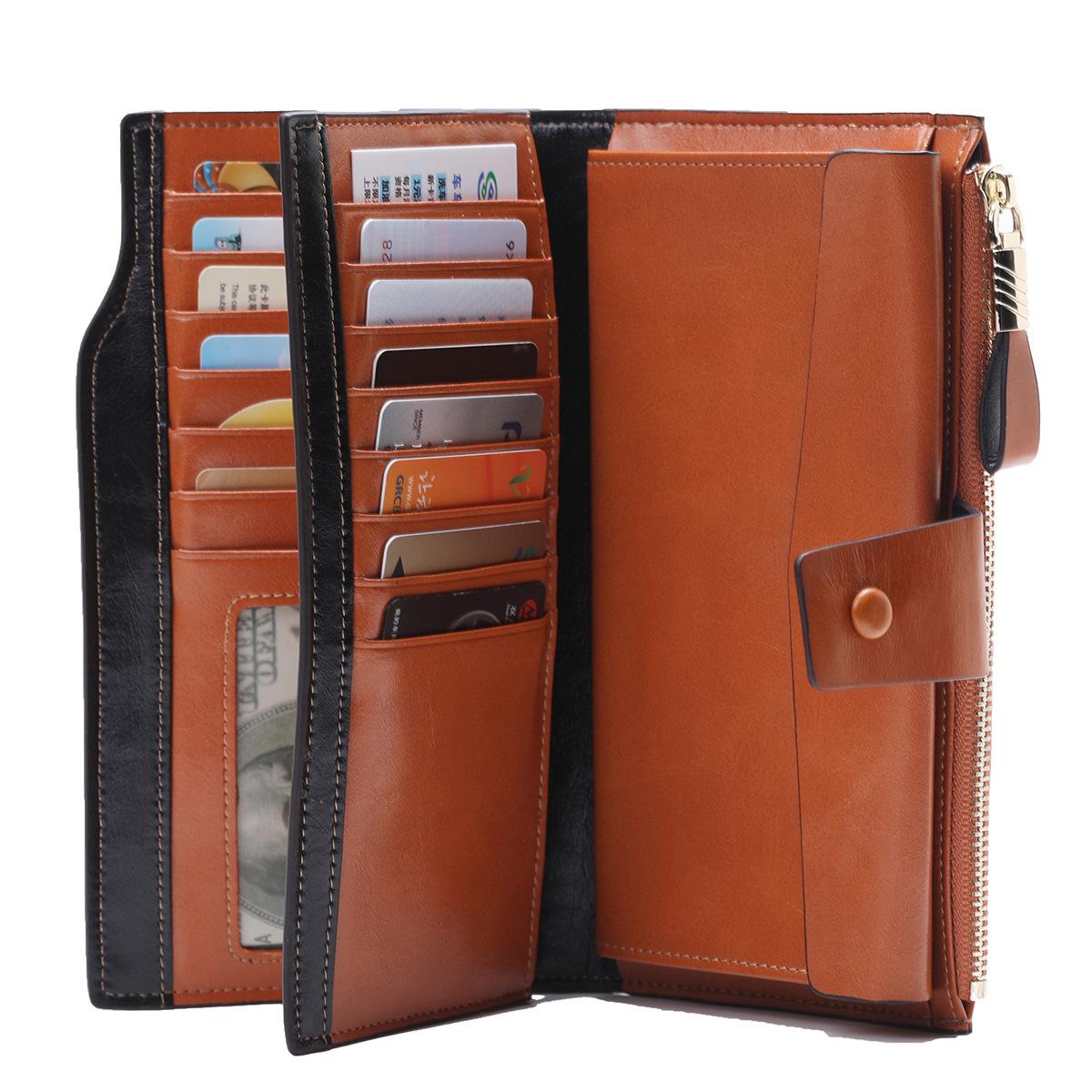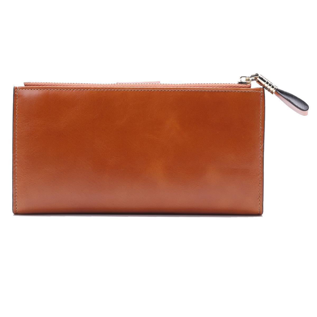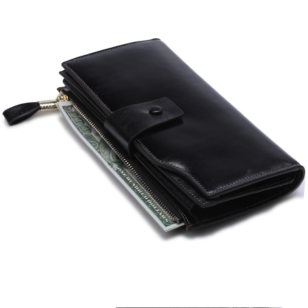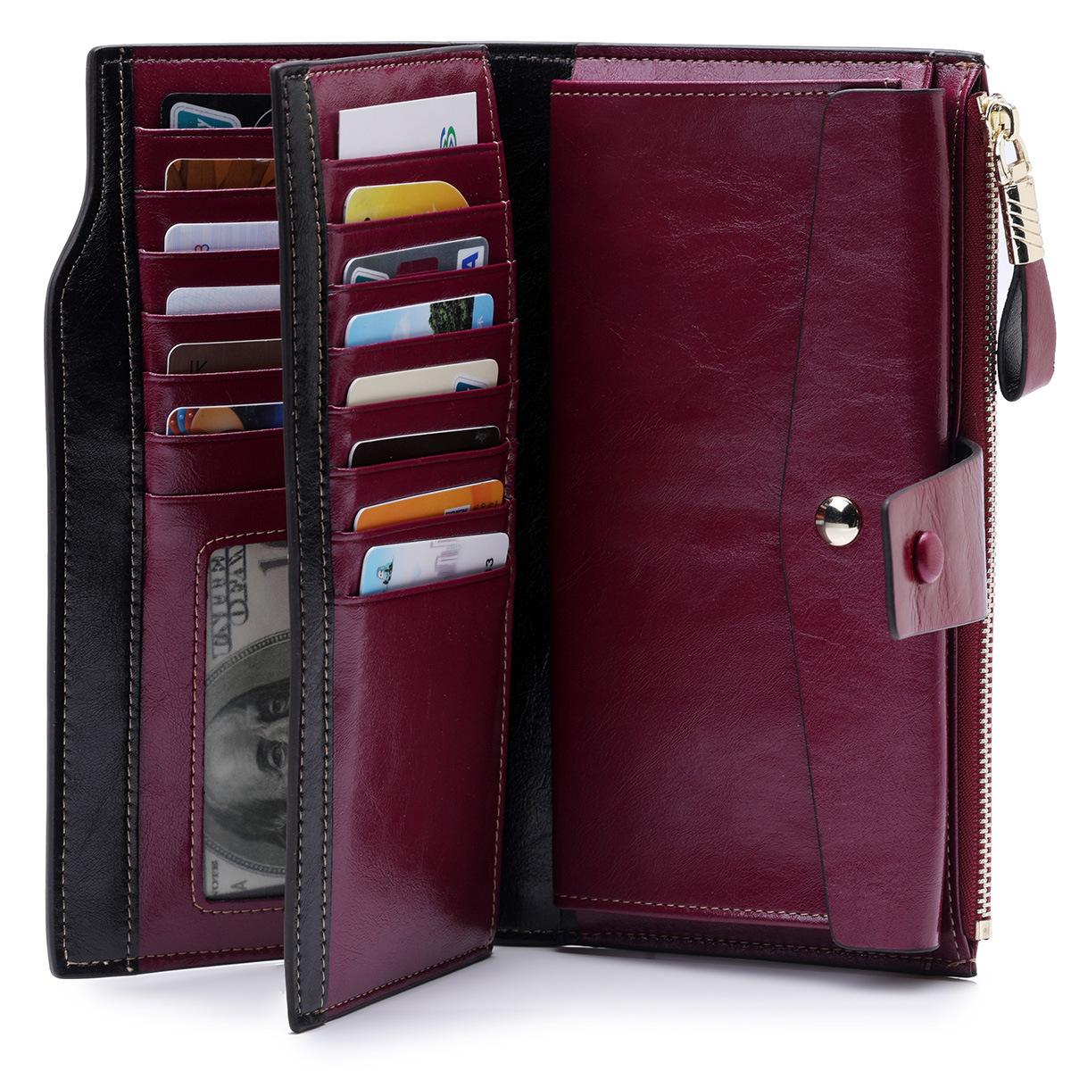 Cartera larga para mujer, venta al por mayor, de fábrica en Guangzhou, de piel auténtica, de primera capa, con múltiples ranuras para tarjetas, de piel de vaca.